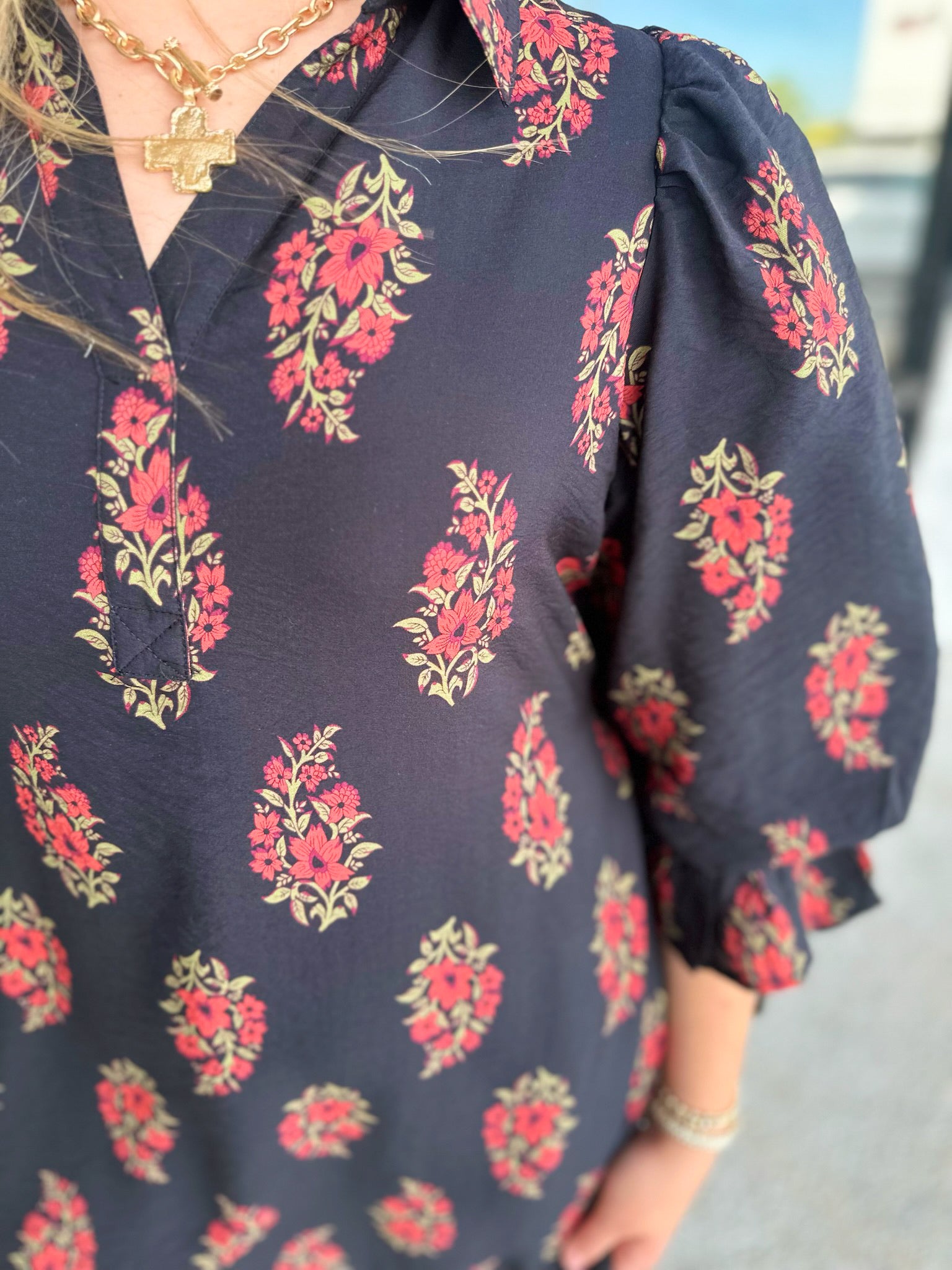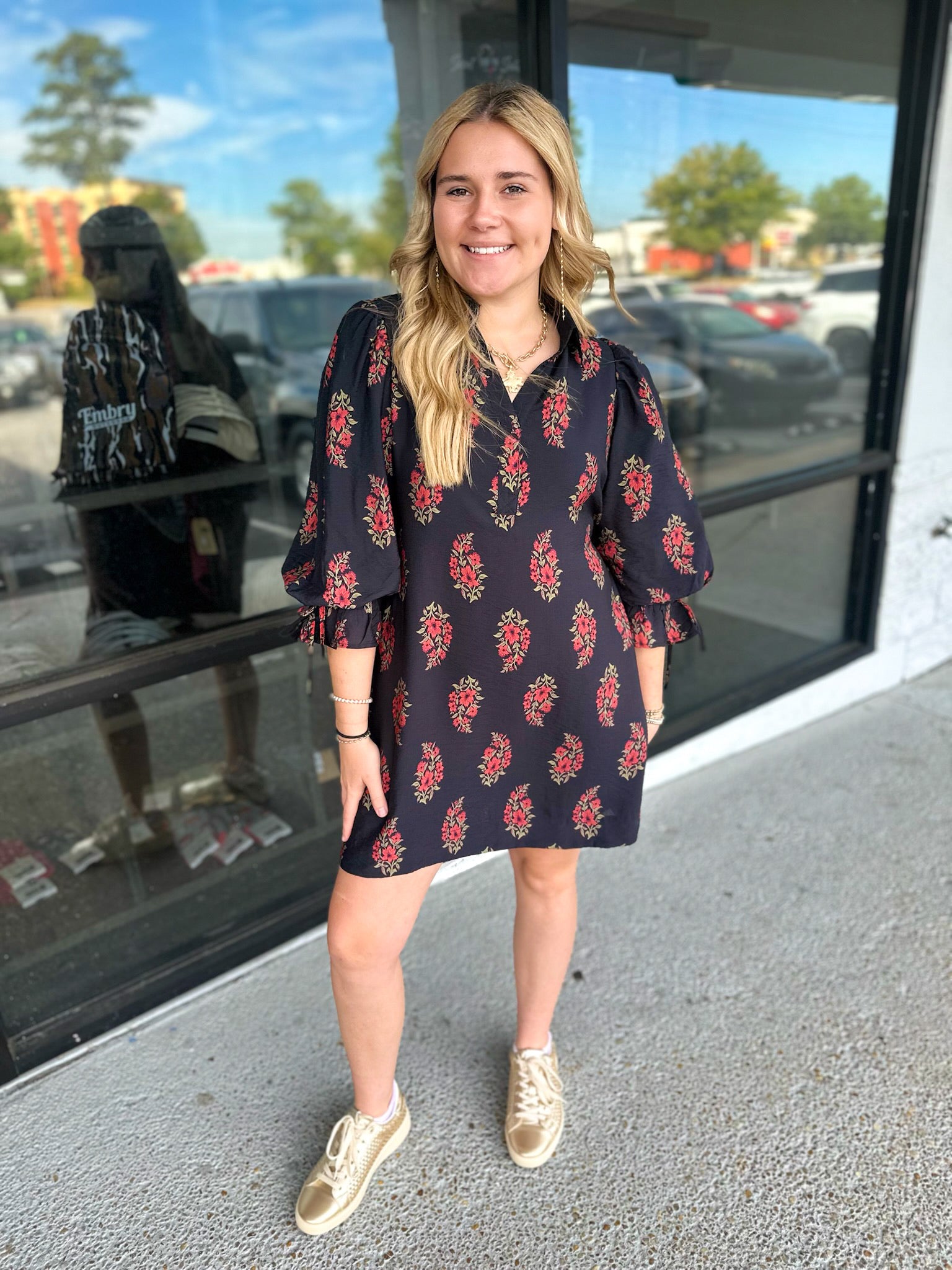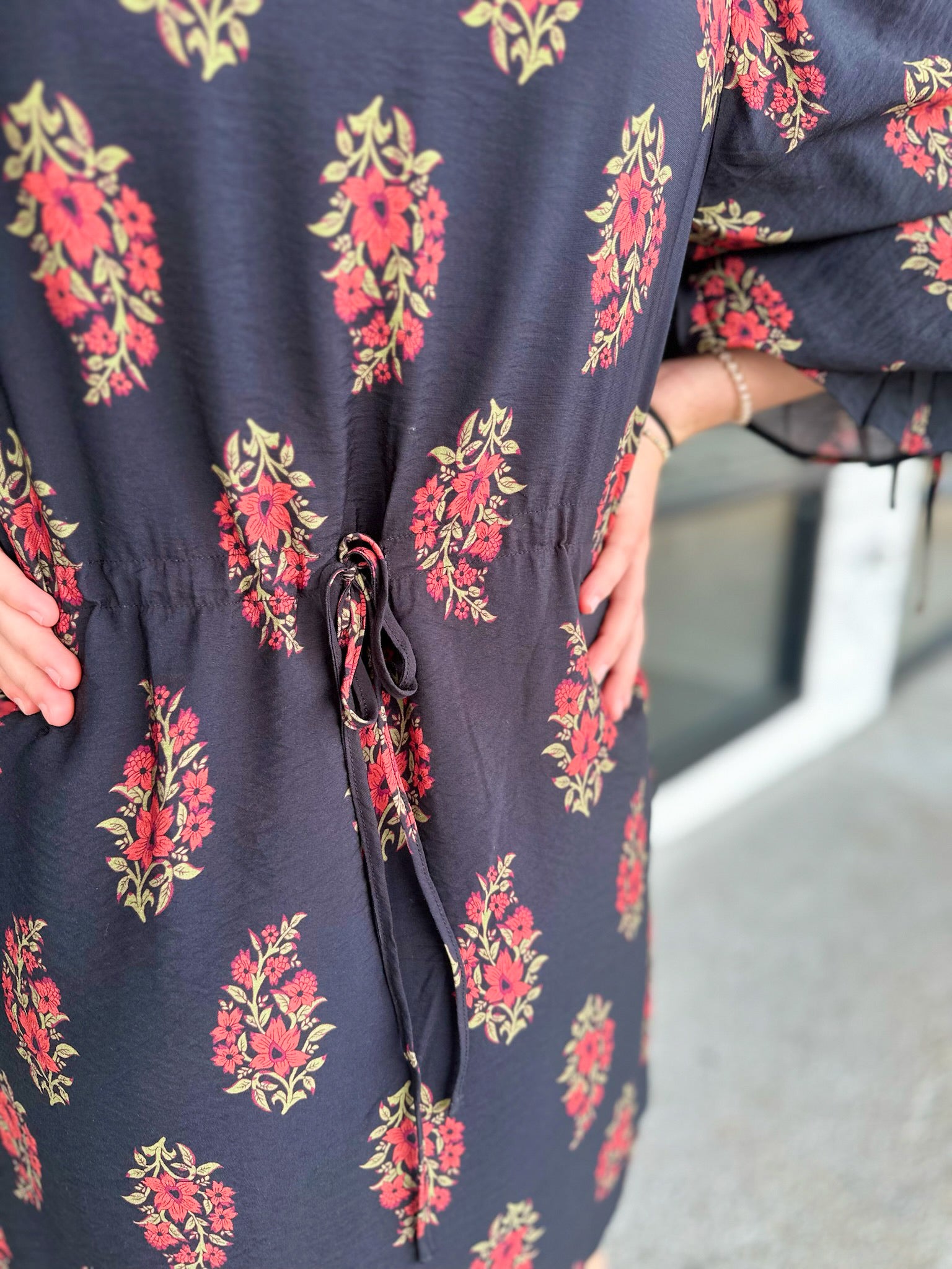 Floral print puff sleeve mini dress featuring drawstring tie at cuffs and back waist. Side pockets. Lined. Woven. Non-sheer. Lightweight.