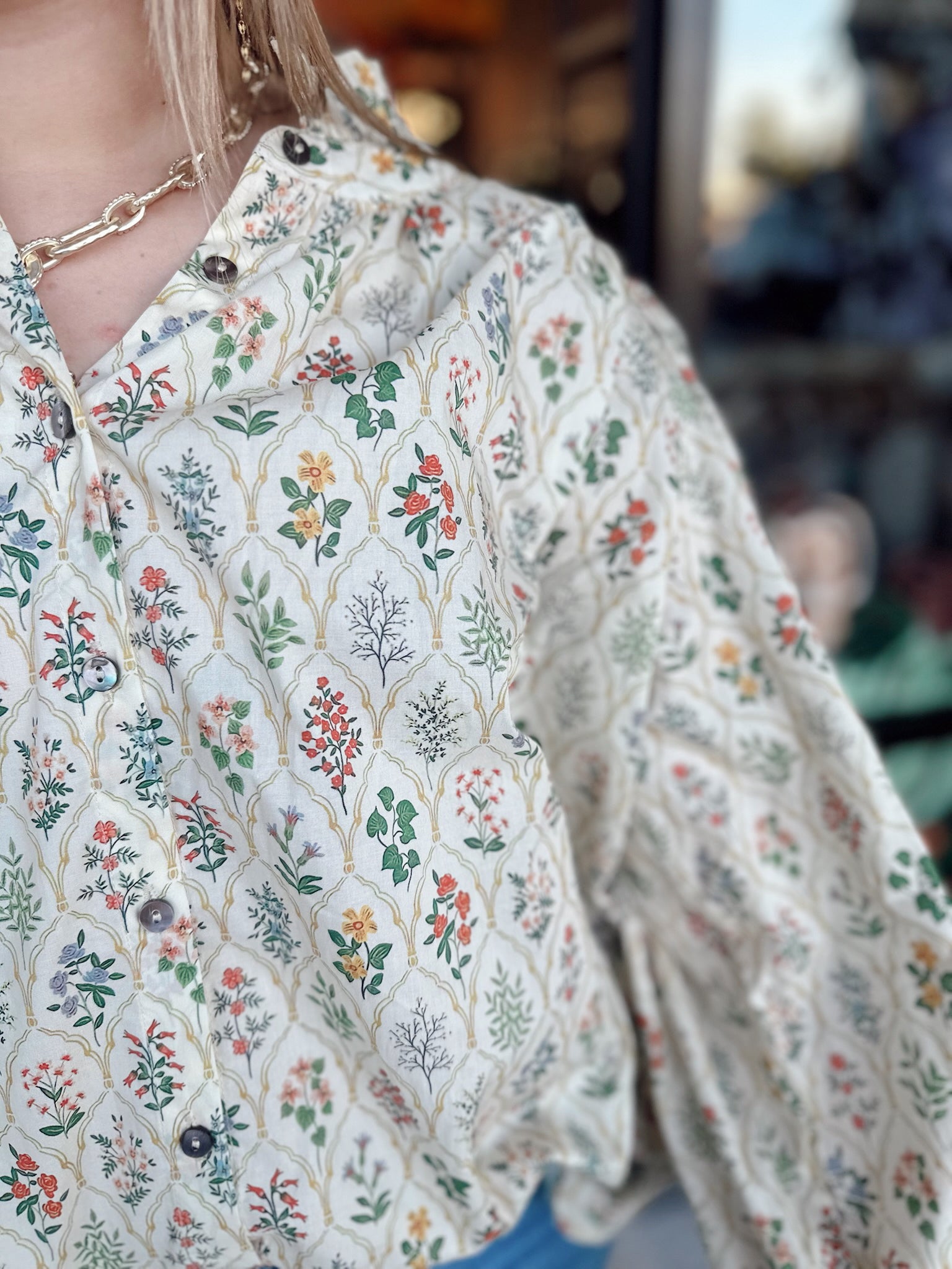 Multi-floral print long sleeve puff sleeve top featuring ruffle band collar and sleeve finish. Unlined. Woven. Non-sheer. Lightweight.