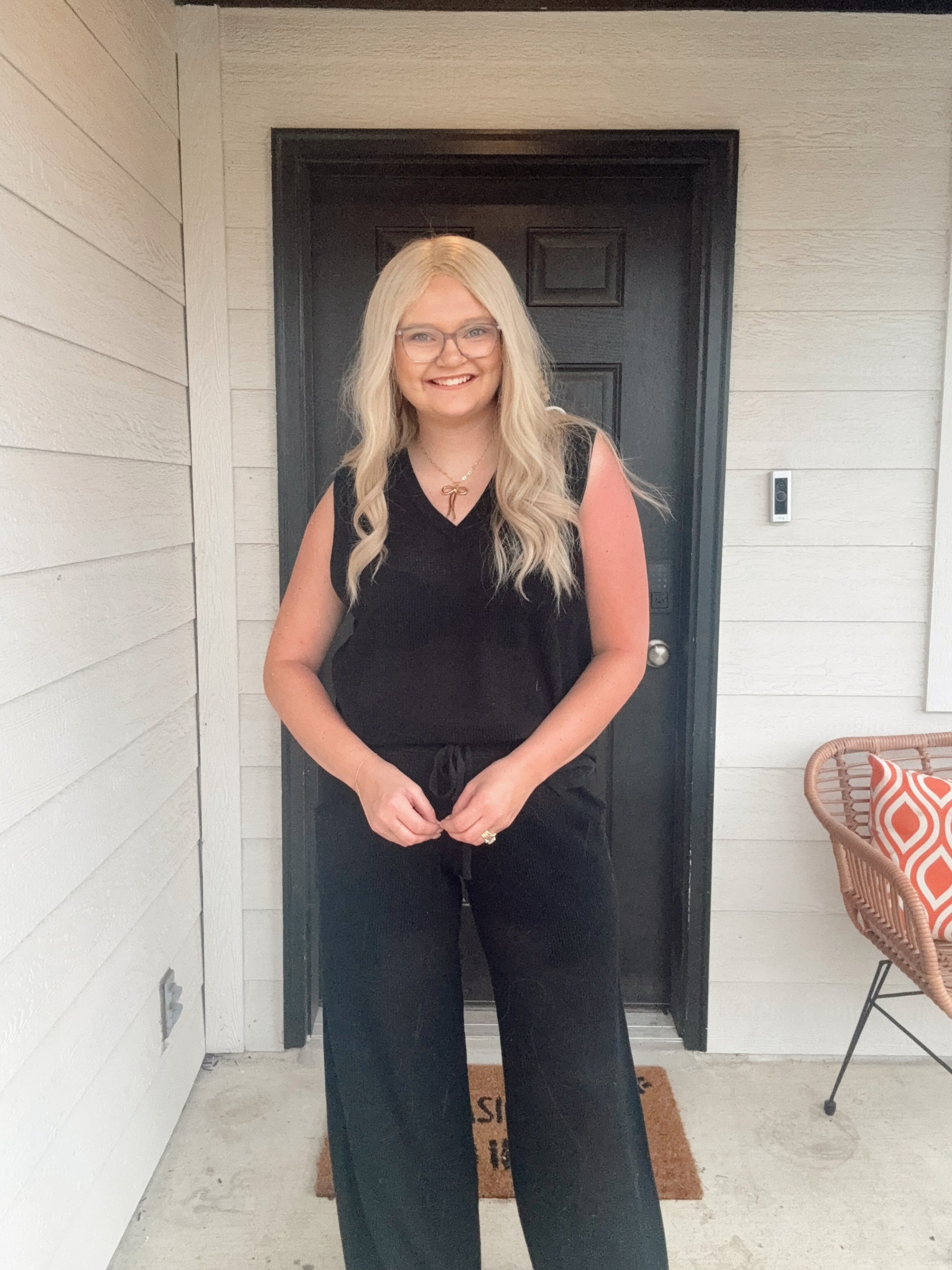 - oft Knit Fabric: Lightweight and breathable material, ideal for lounging or casual outings. - Relaxed Silhouette: Oversized fit offers ultimate comfort and easy movement. - V-Neckline Top: Features a flattering V-neck and sleeveless design, perfect for layering or warm weather. - Wide-Leg Pants: Designed with an elastic drawstring waistband for an adjustable fit and side pockets for added convenience. - Versatile Style: Can be dressed up with sneakers for errands or worn as cozy loungewear at home.