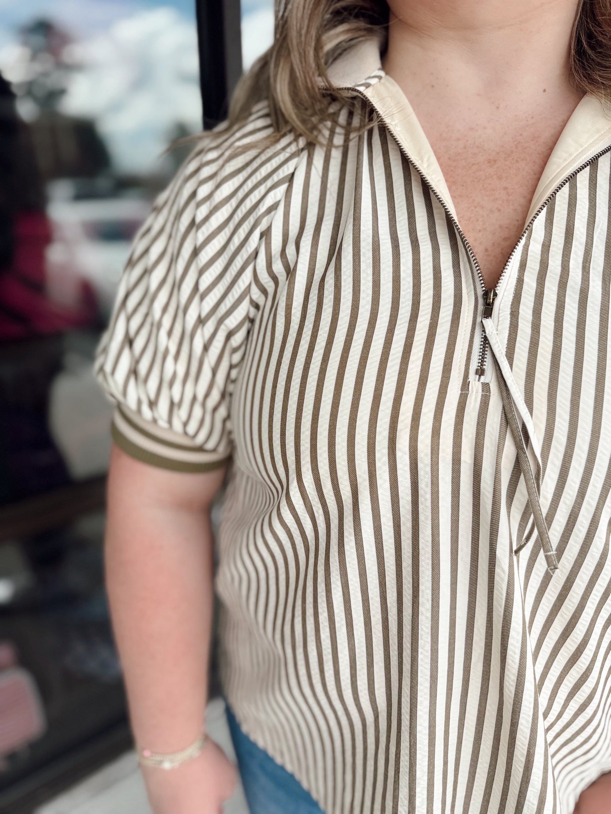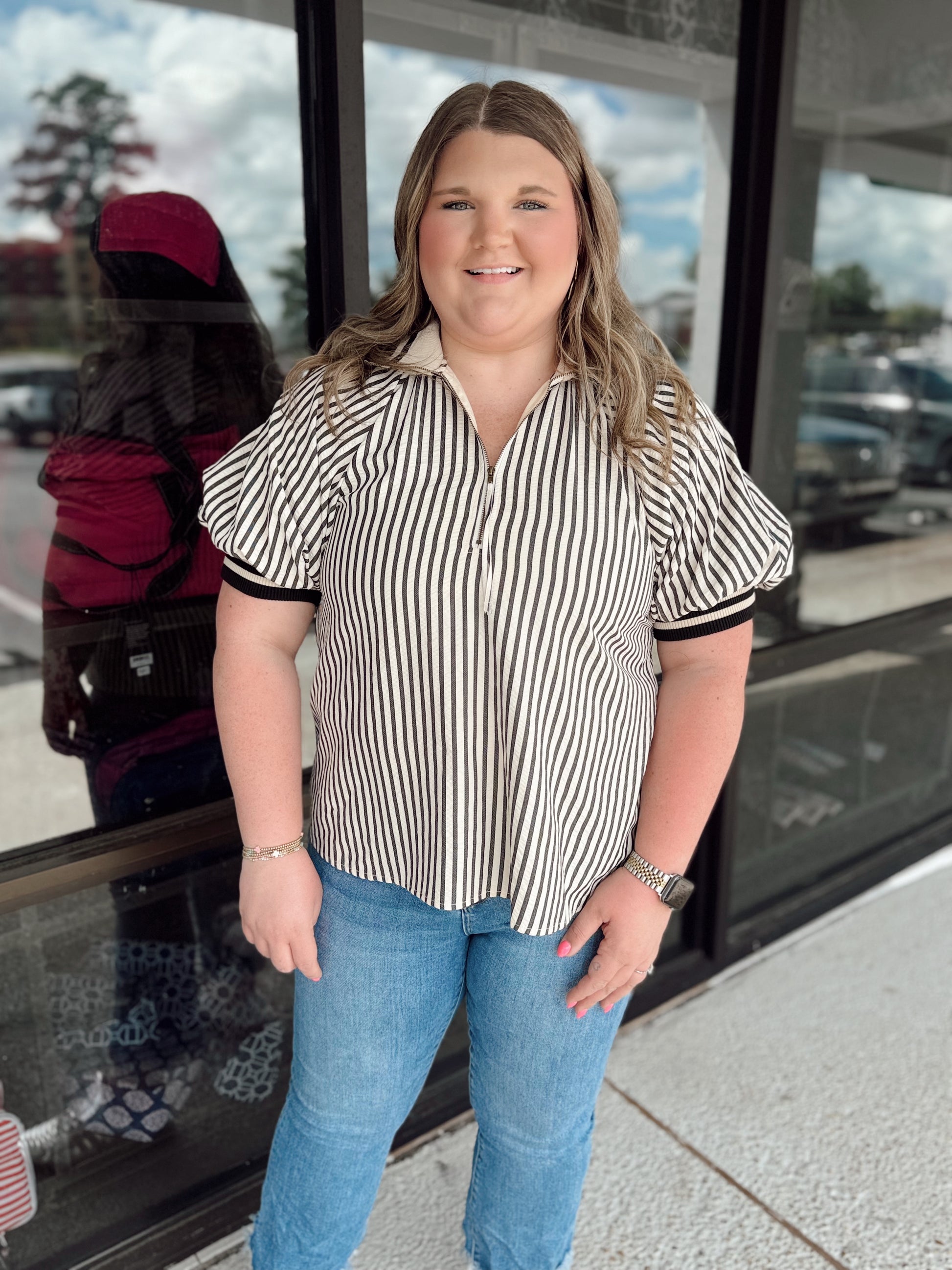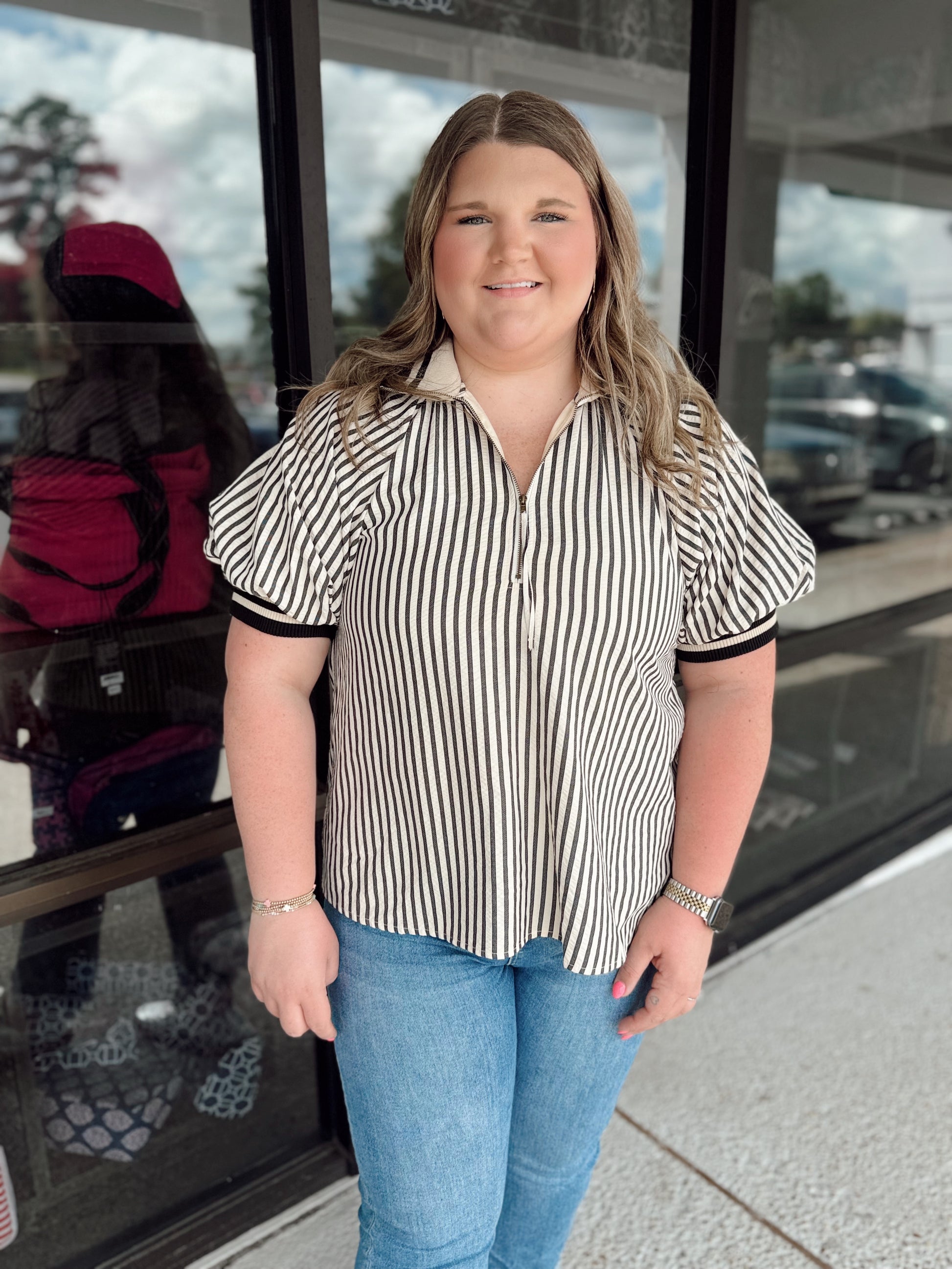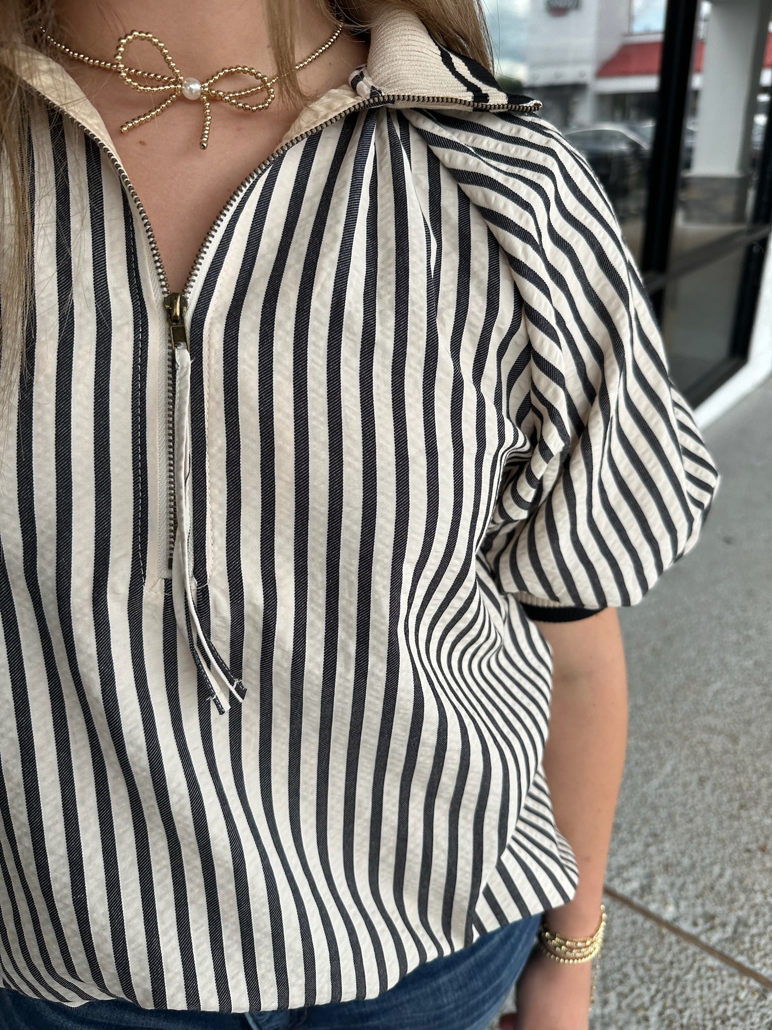 Stripe pattern half-zip closure short puff sleeve top featuring multicolor accent band. Unlined. Woven. Non-sheer. Lightweight.