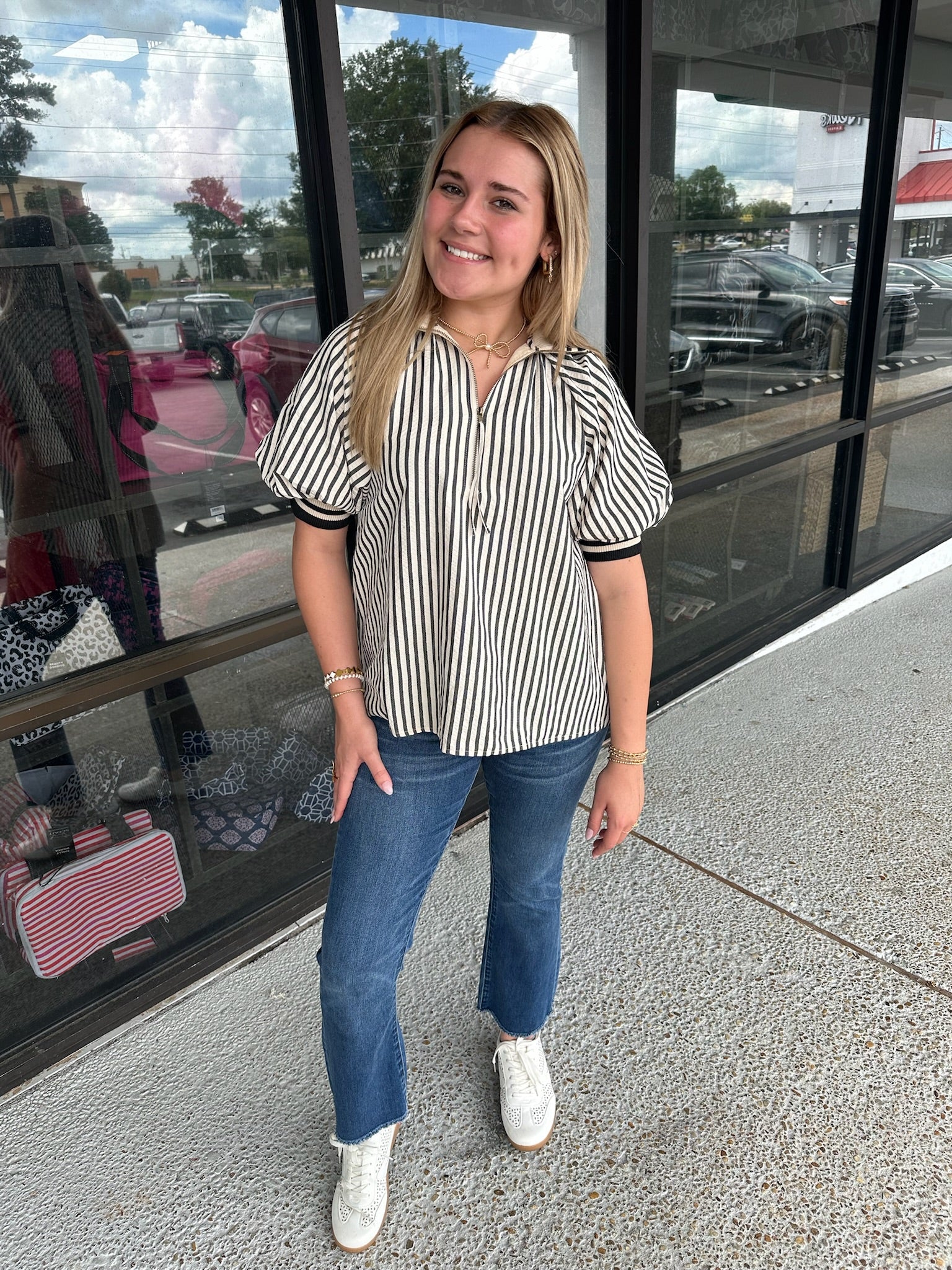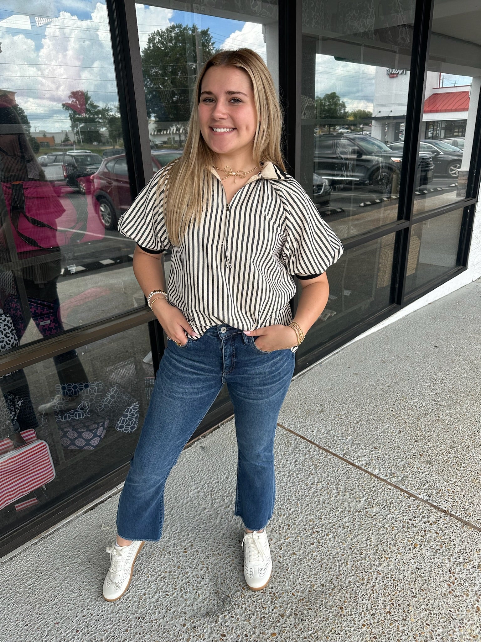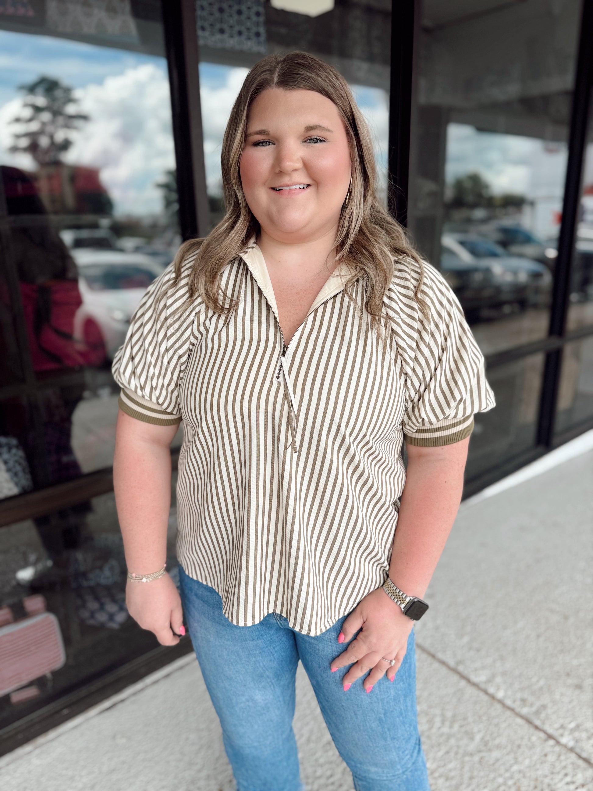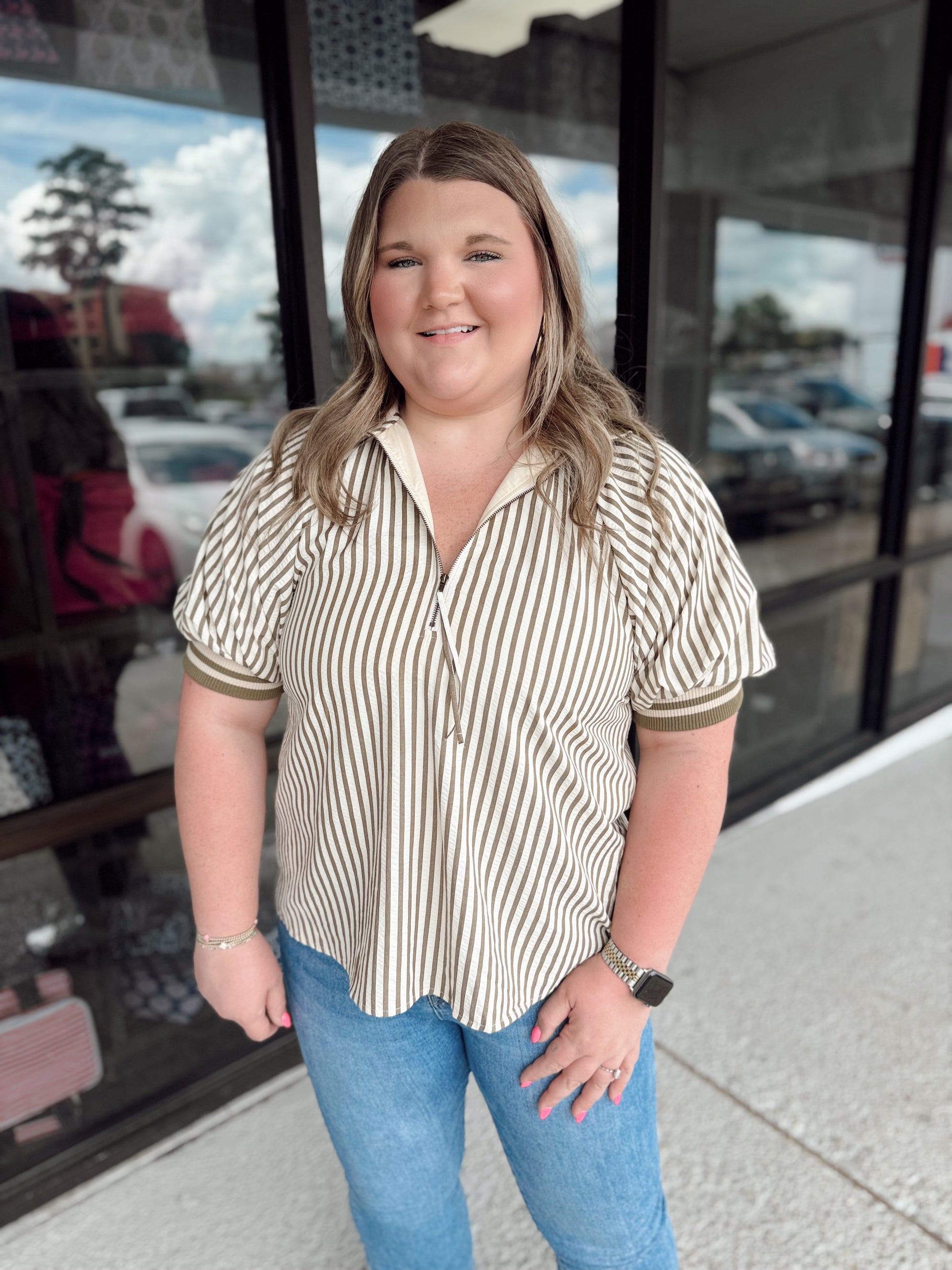 Stripe pattern half-zip closure short puff sleeve top featuring multicolor accent band. Unlined. Woven. Non-sheer. Lightweight.