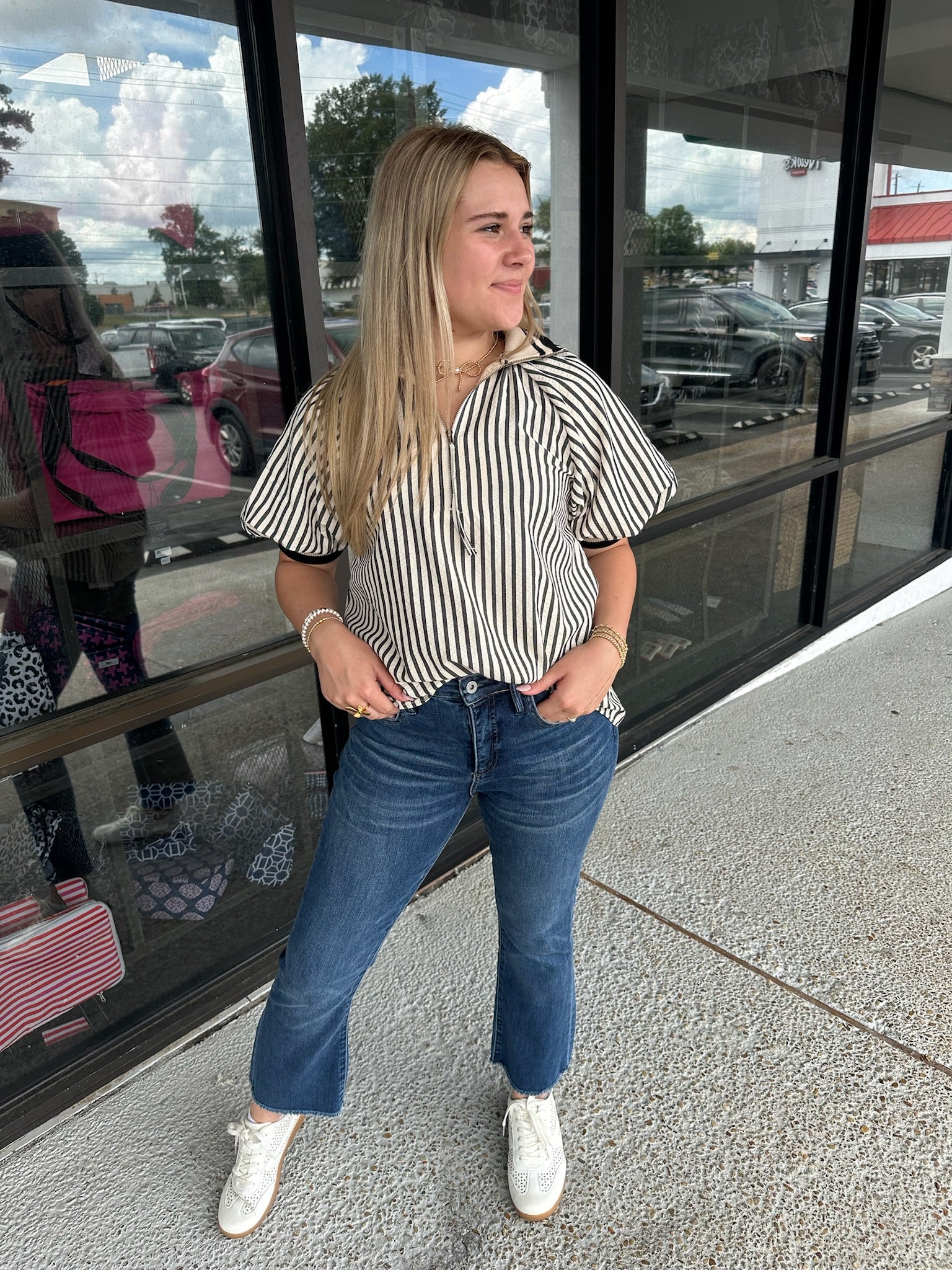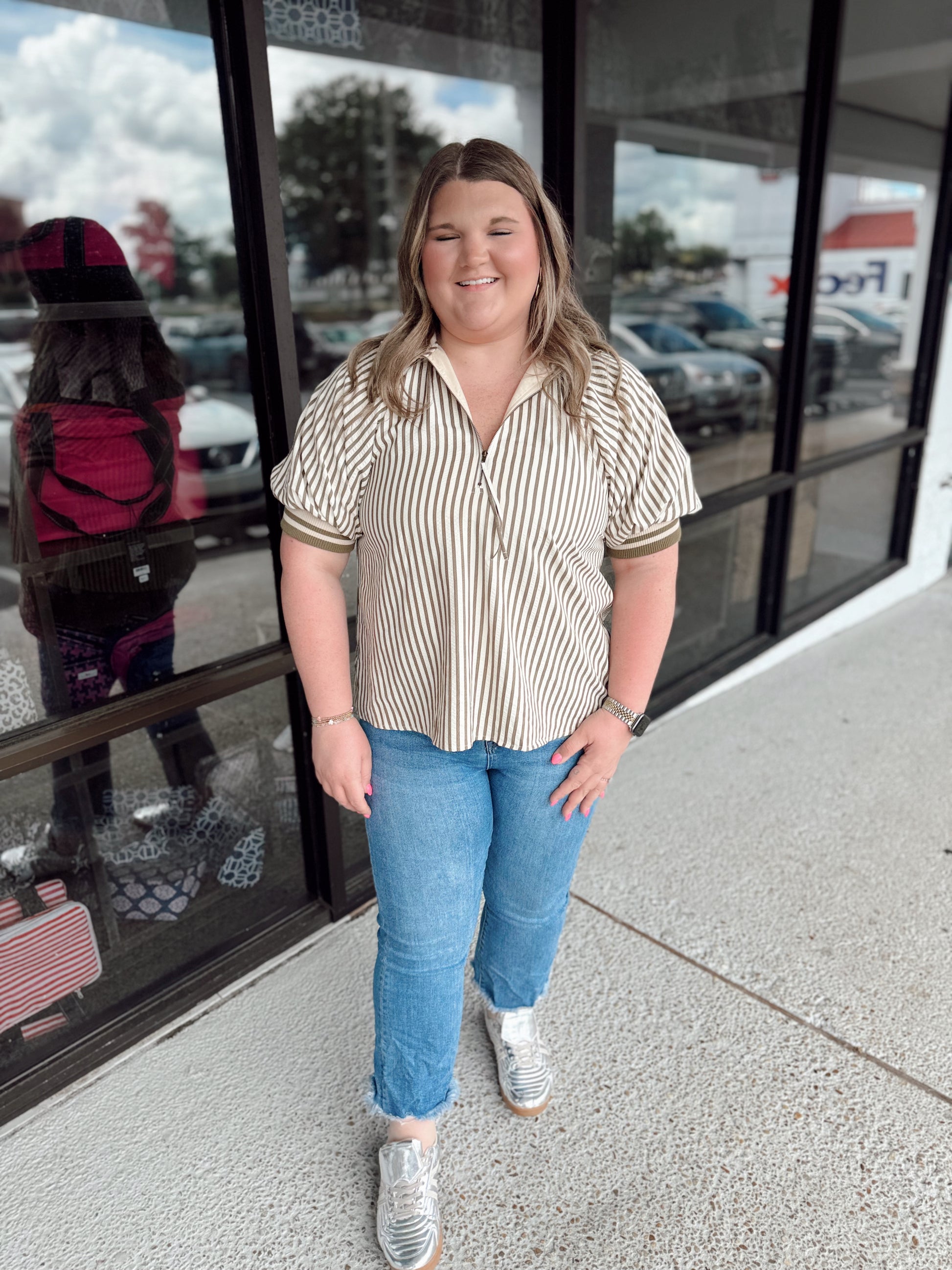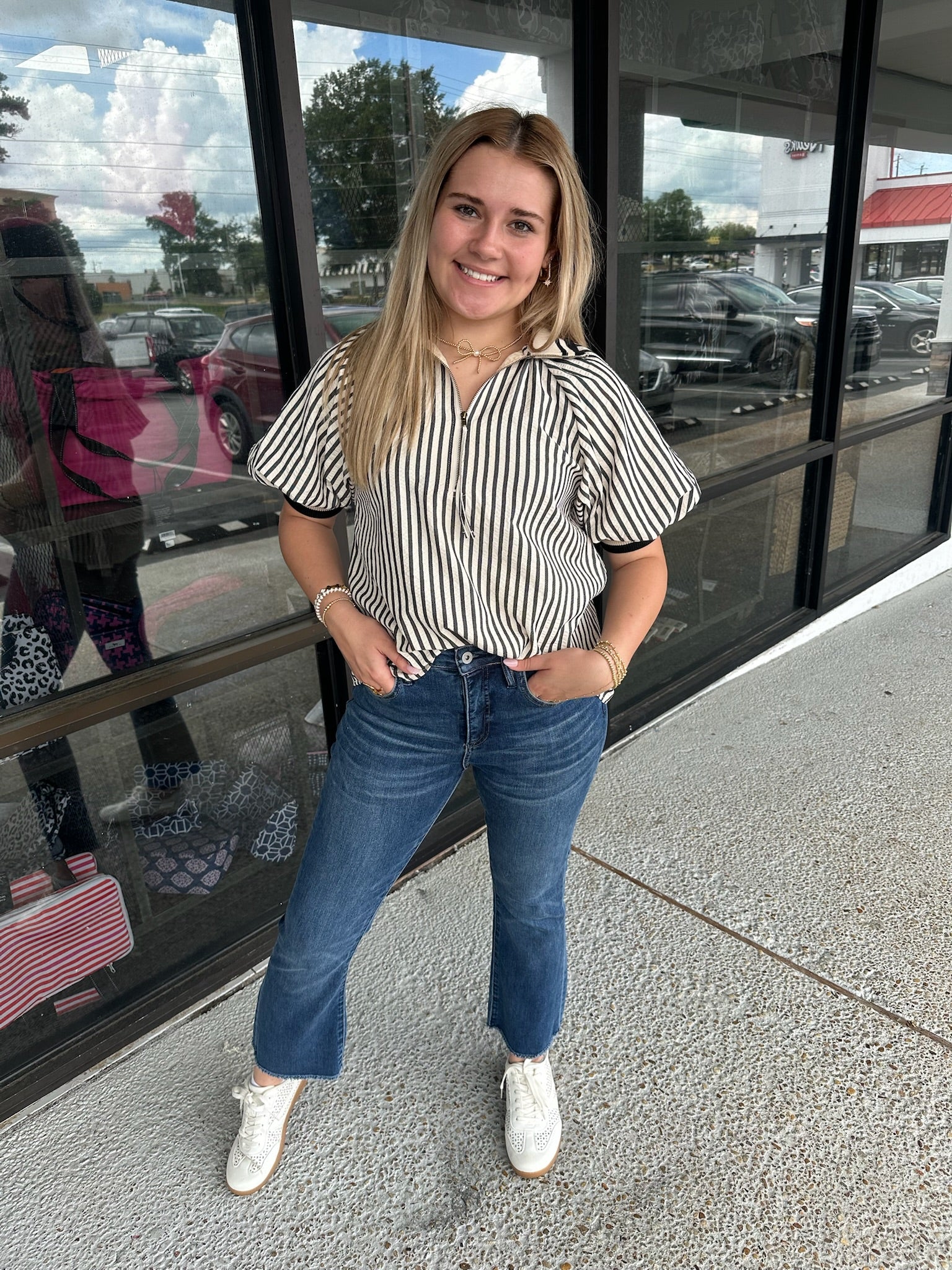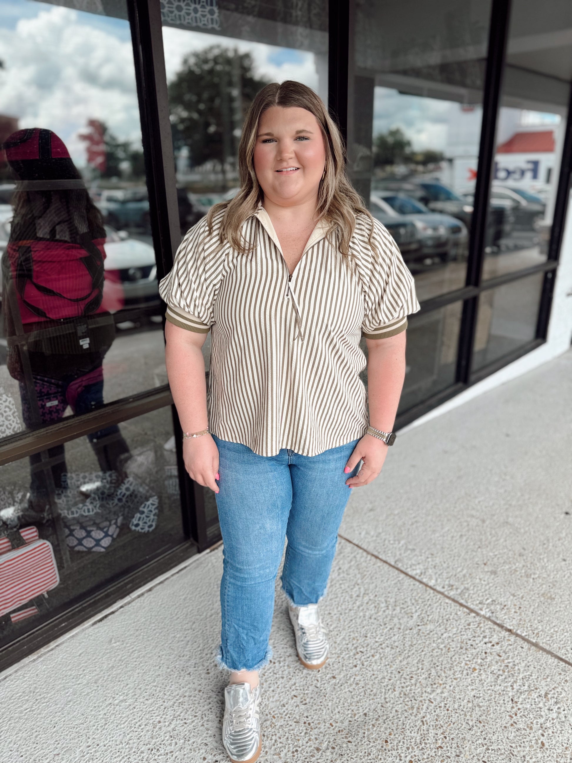 Stripe pattern half-zip closure short puff sleeve top featuring multicolor accent band. Unlined. Woven. Non-sheer. Lightweight.