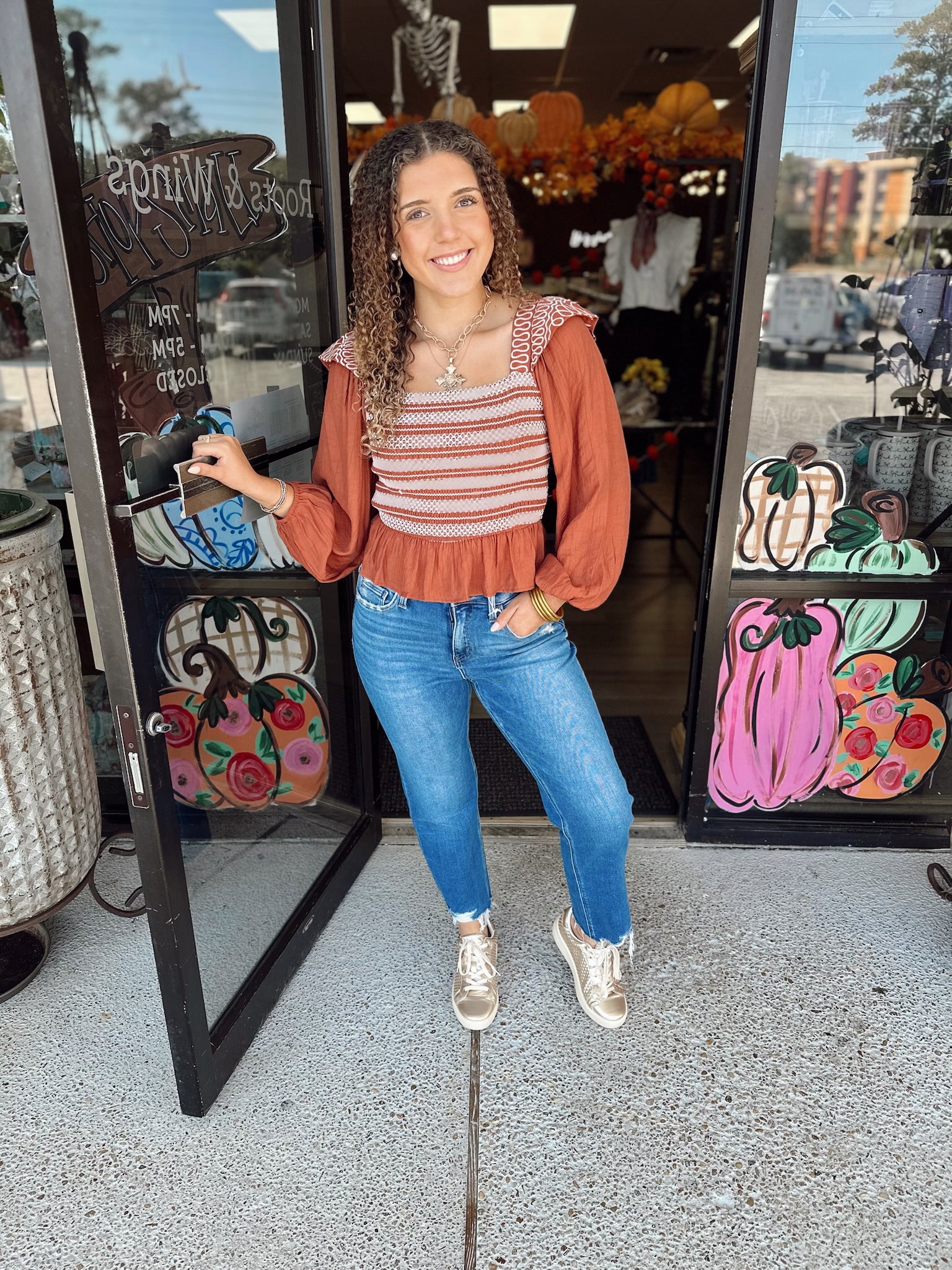 - Fabric Detail: Lightweight cotton blend with contrast embroidered panel and textured weave - Neckline: Wide square neckline framed by intricate loop embroidery on the shoulder flaps - Sleeves: Voluminous long sleeves with elasticized cuffs for a soft balloon shape - Waist Detail: Smocked bodice with a gathered peplum hem adds feminine flair - Back Design: Square back neckline with matching embroidered shoulders