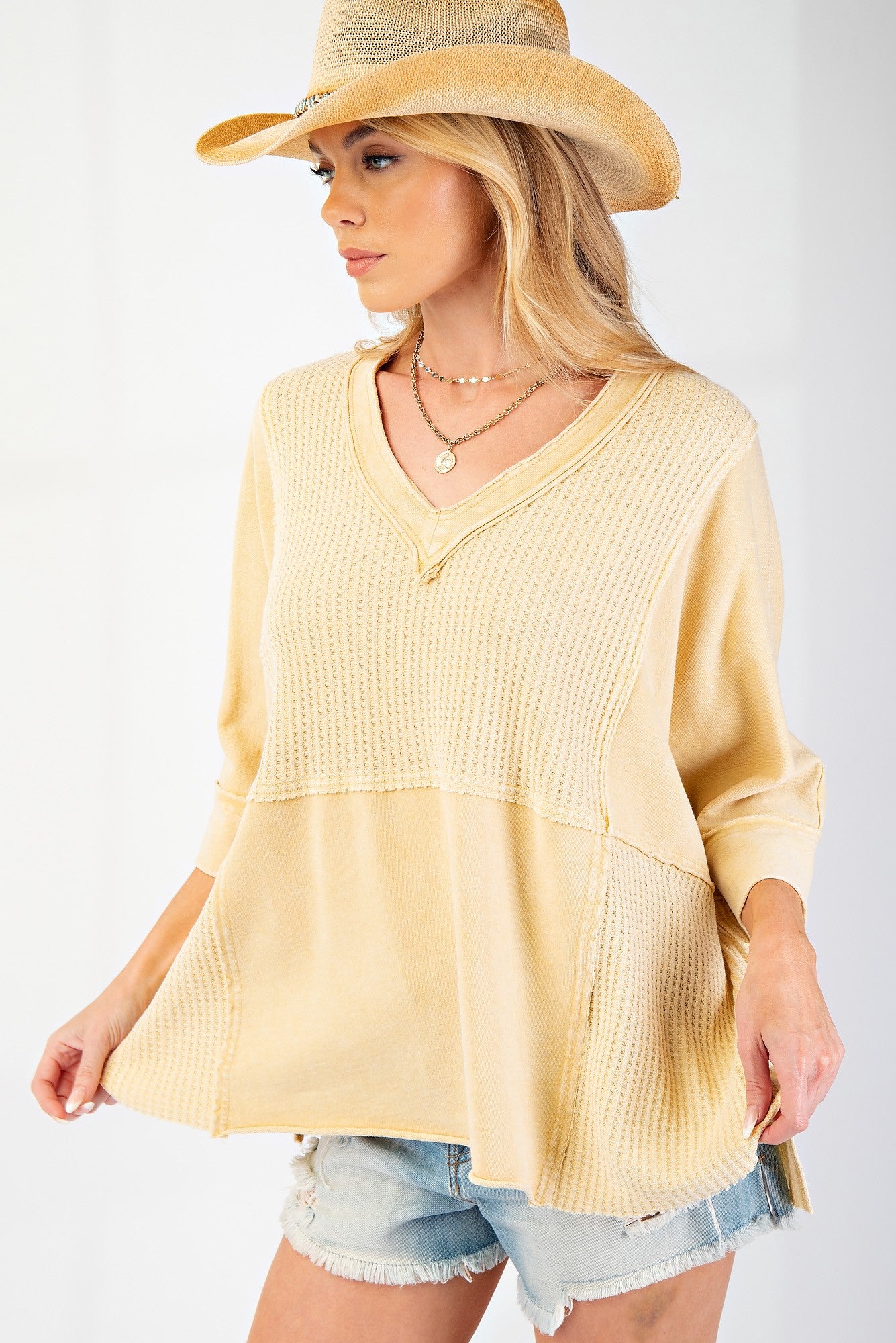 MINERAL WASHED THERMAL V NECK KNIT TOP -EMPHASIZED V NECK -WAFFLE KNIT PANEL DETAILING -SIDE SLITS -RAW CUT HEM