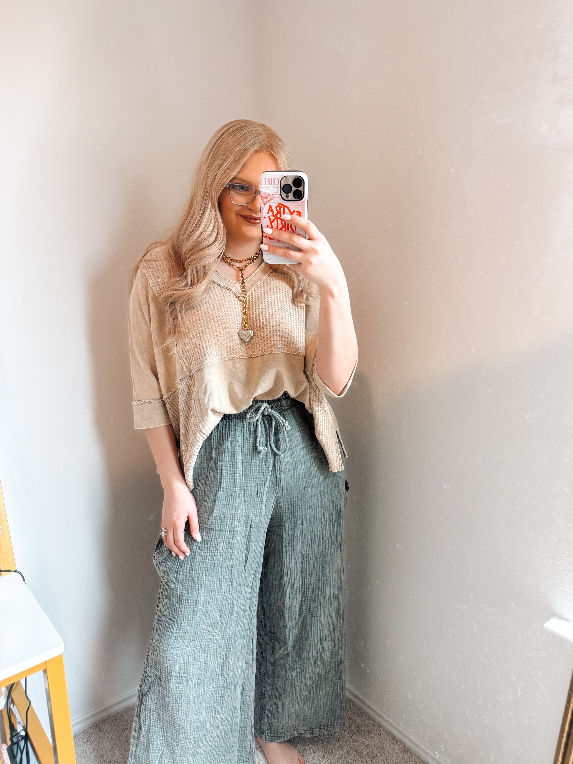 MINERAL WASHED THERMAL V NECK KNIT TOP -EMPHASIZED V NECK -WAFFLE KNIT PANEL DETAILING -SIDE SLITS -RAW CUT HEM