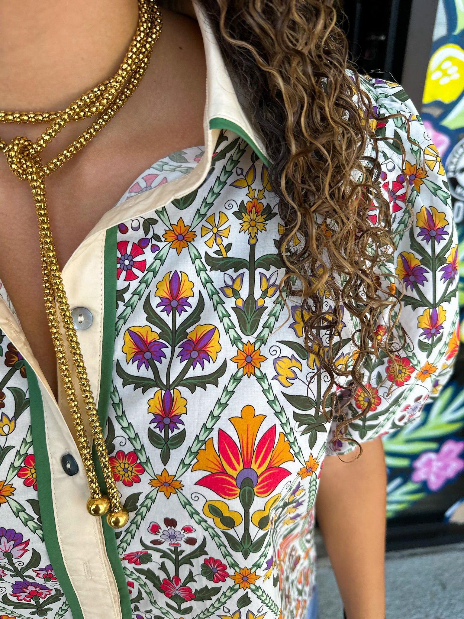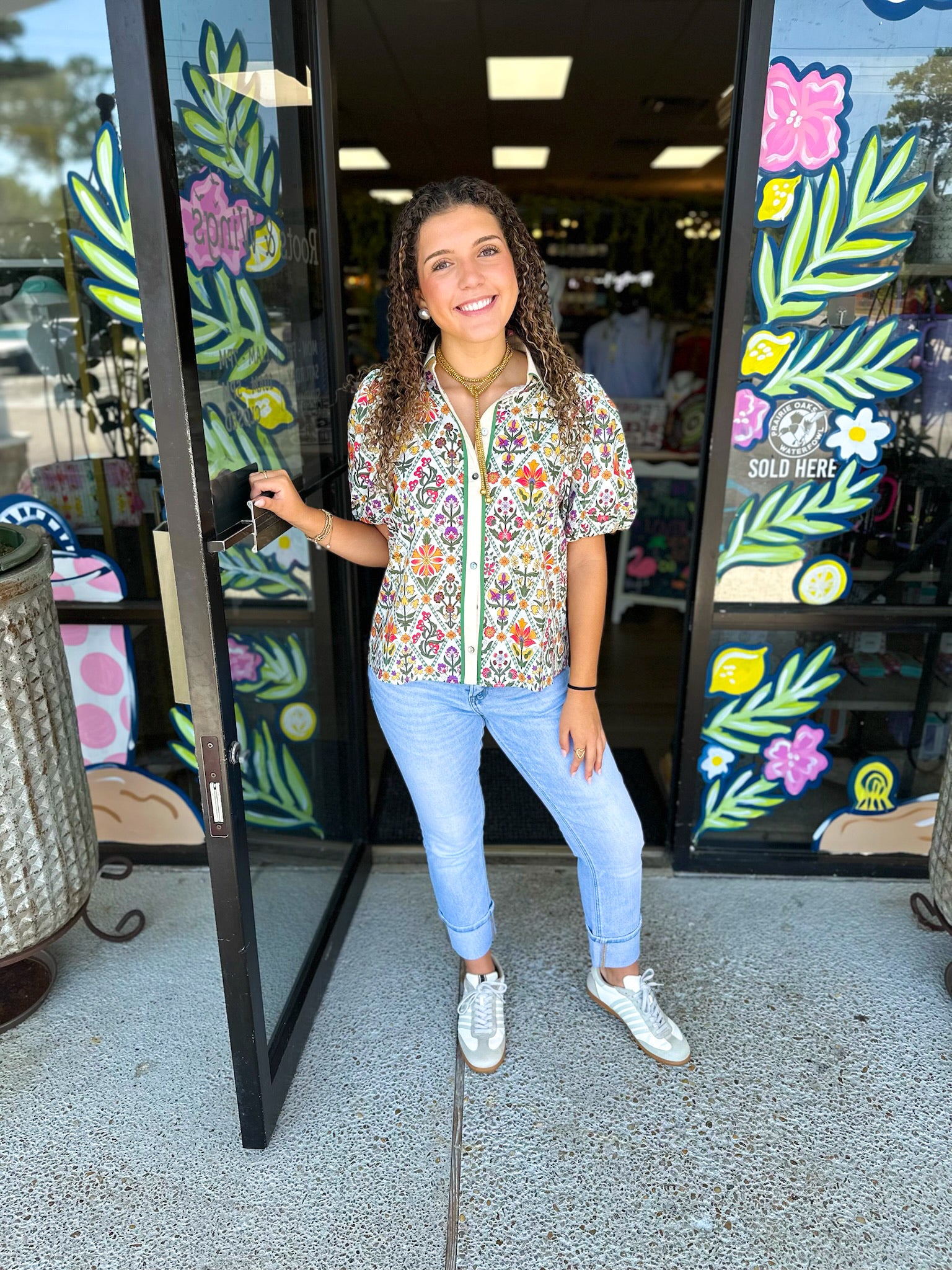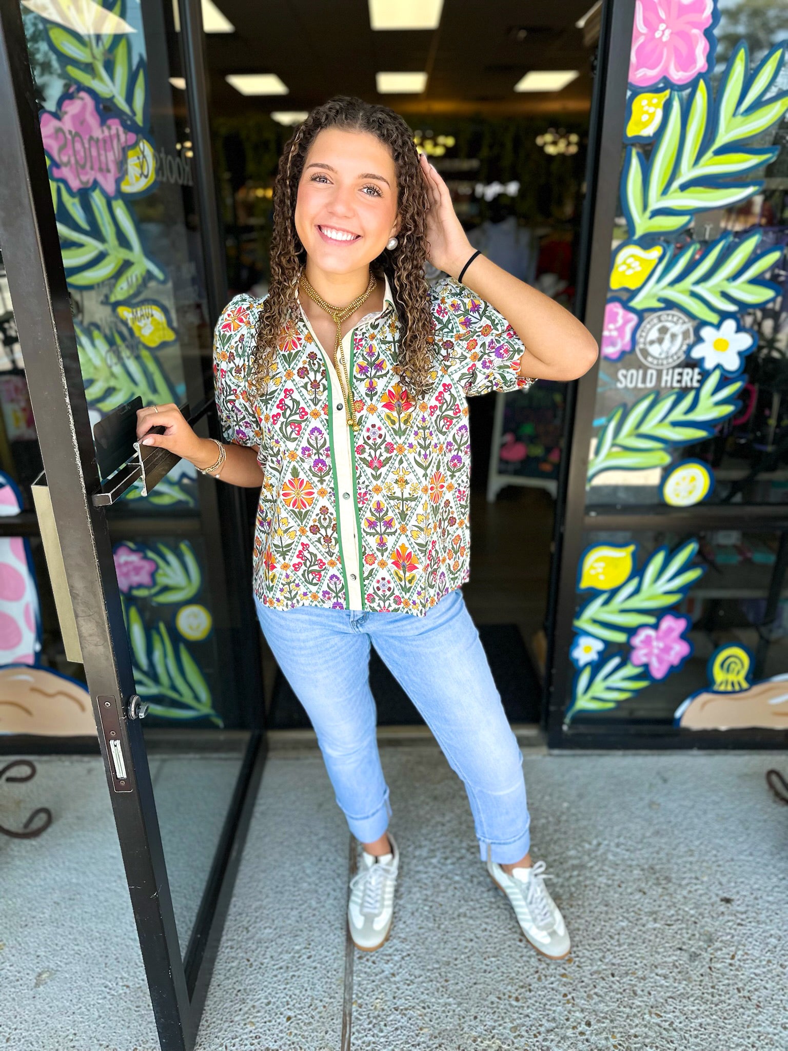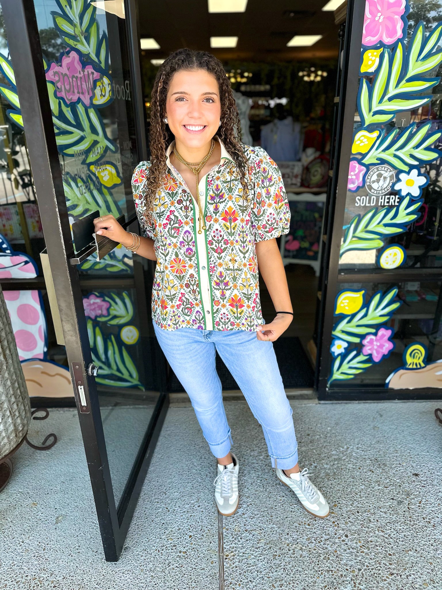 Floral print diamond pattern short bubble sleeve top featuring contrast accent collar placket button front closure. Unlined. Woven. Non-sheer. Lightweight.