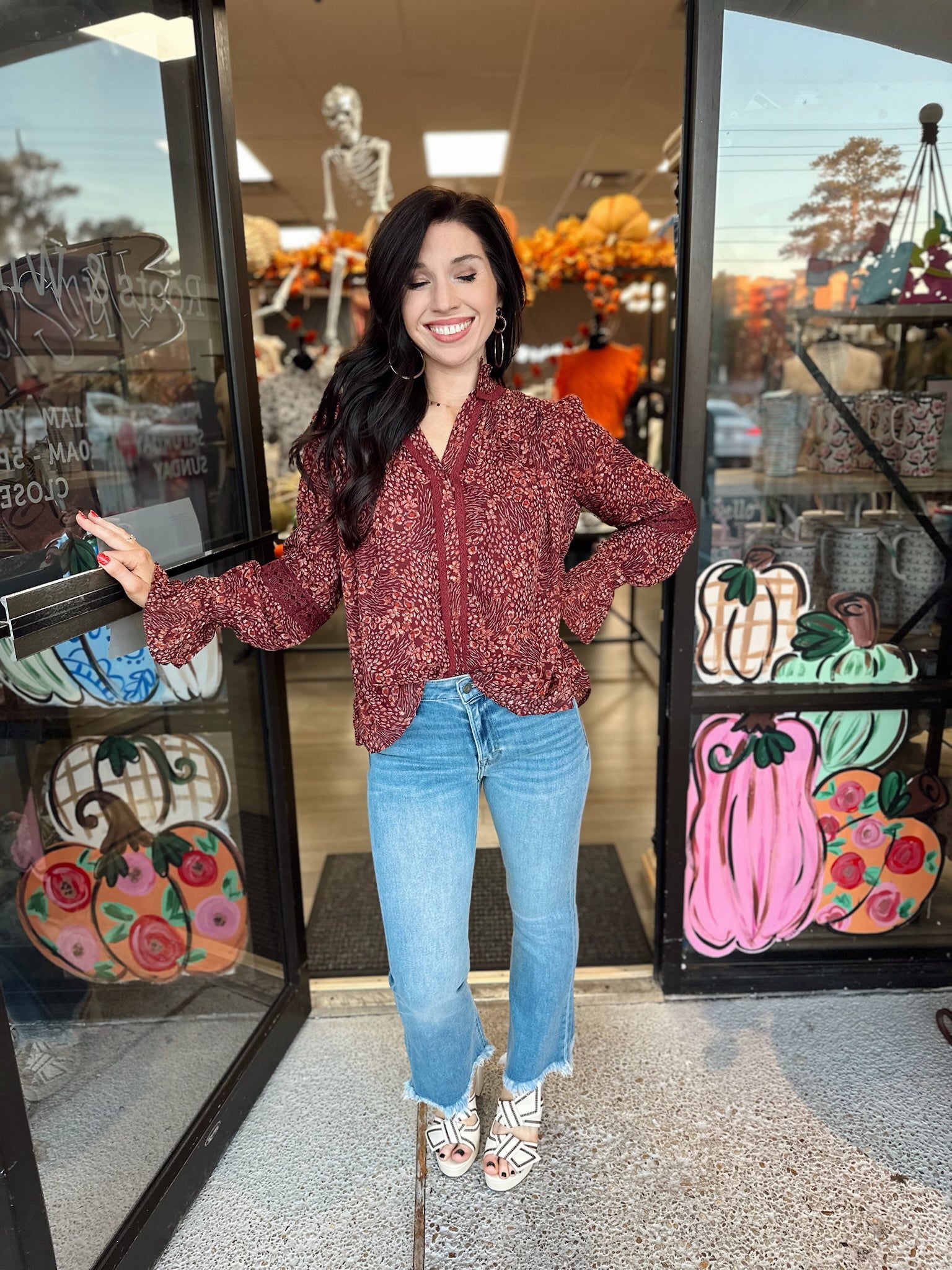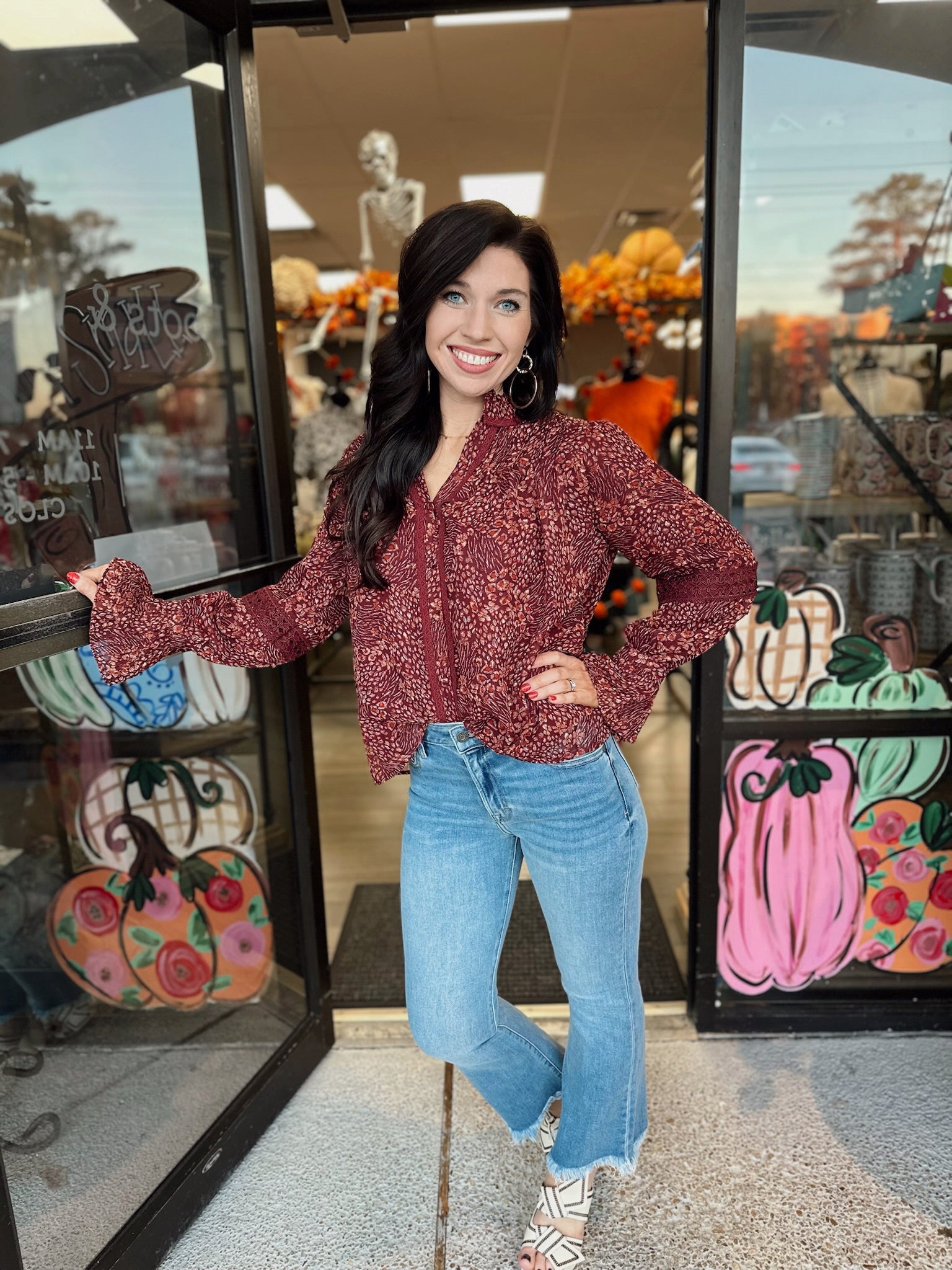 FLORAL PRINT LUREX CHIFFON LACE TRIMMED BLOUSE