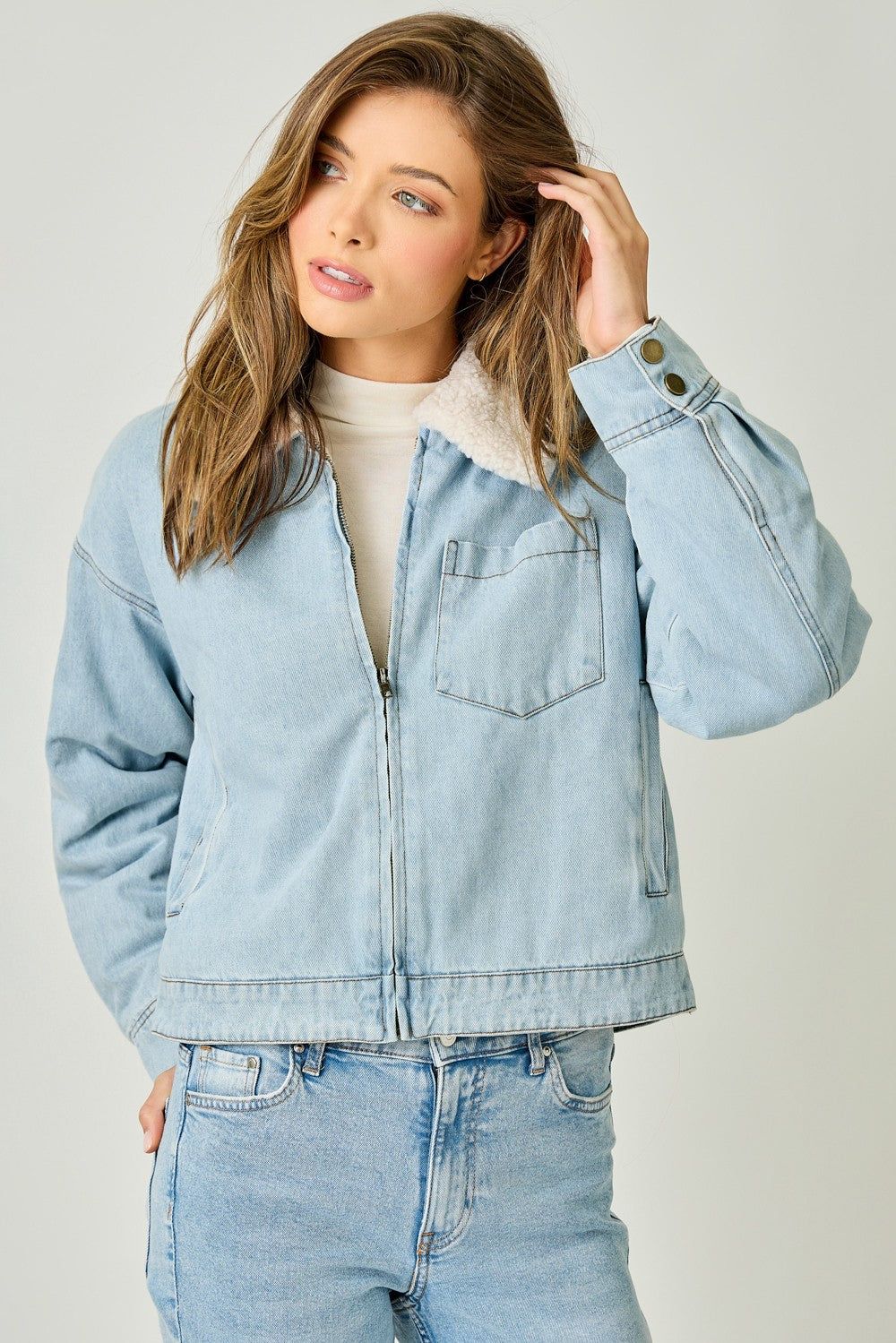 Blouson Denim Jacket Front zipper closure Chest pocket and side pockets Buttoned sleeve cuffs