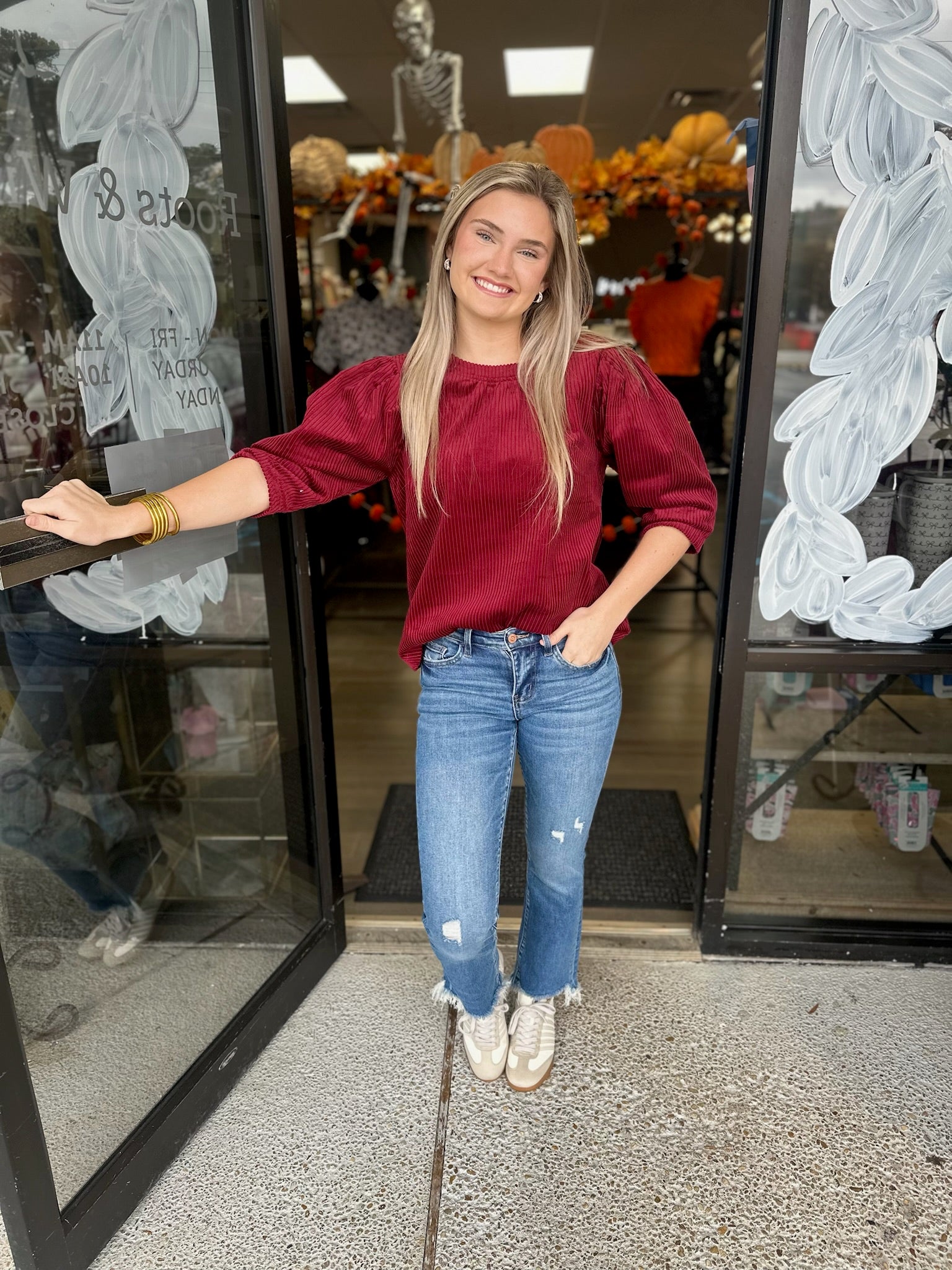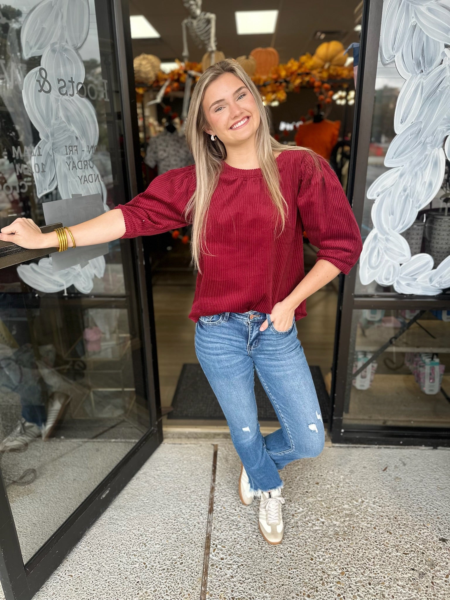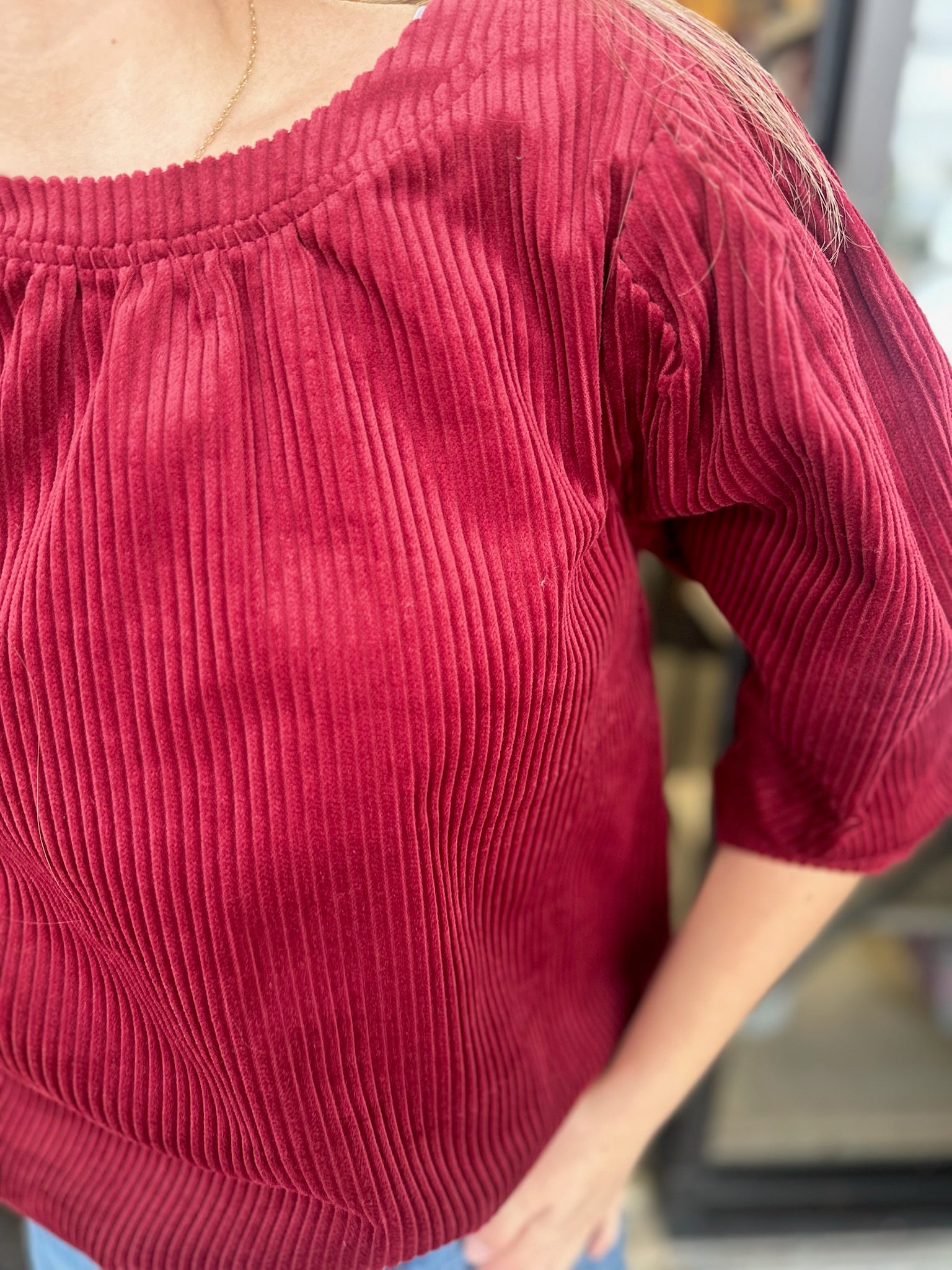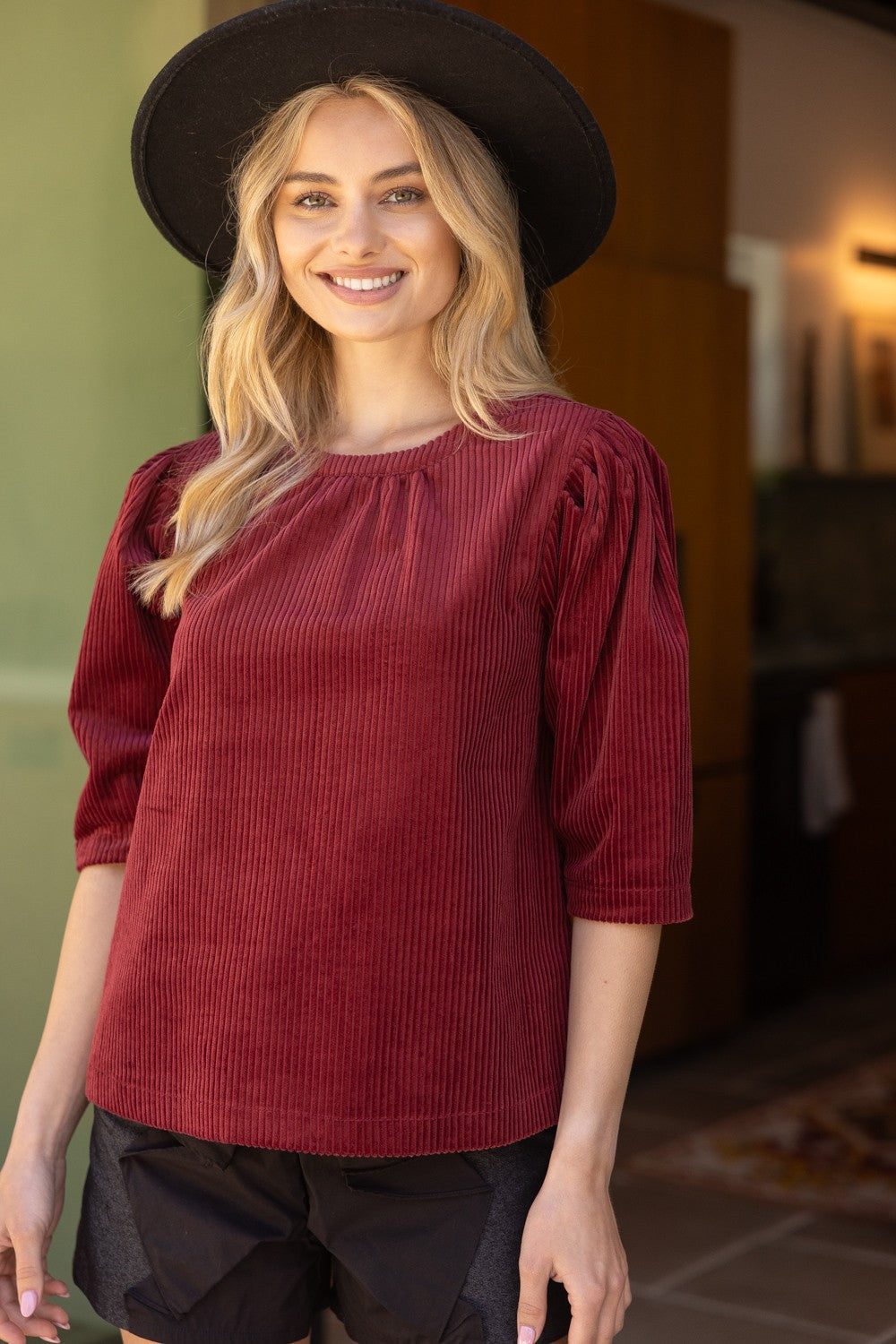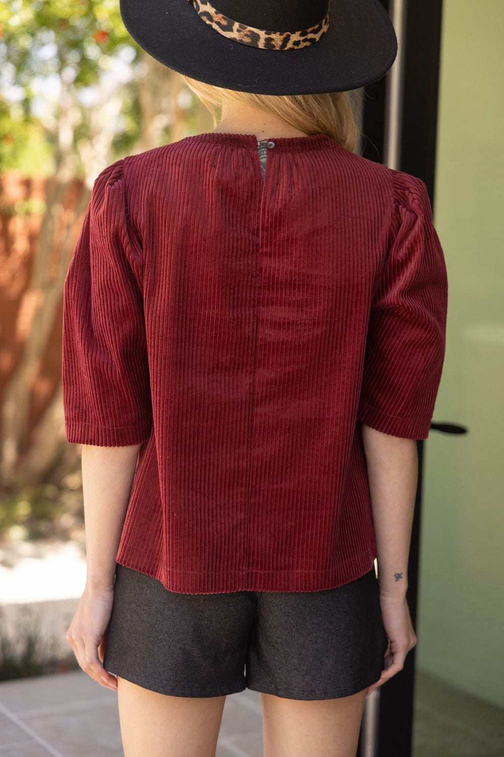 - Round neckline -Pleated half puff sleeve -Back neck button and loop closure - Ribbed corduroy woven fabric