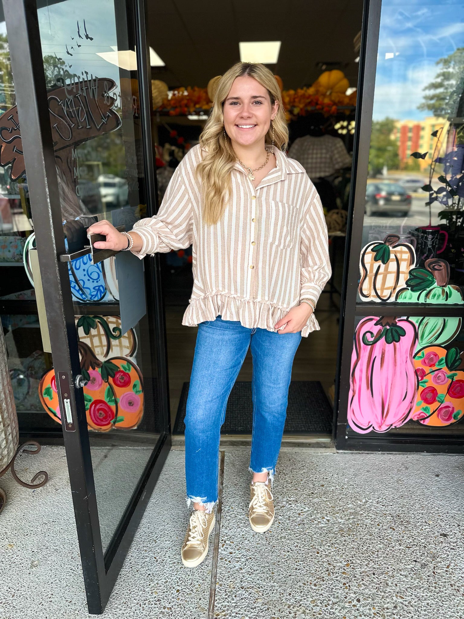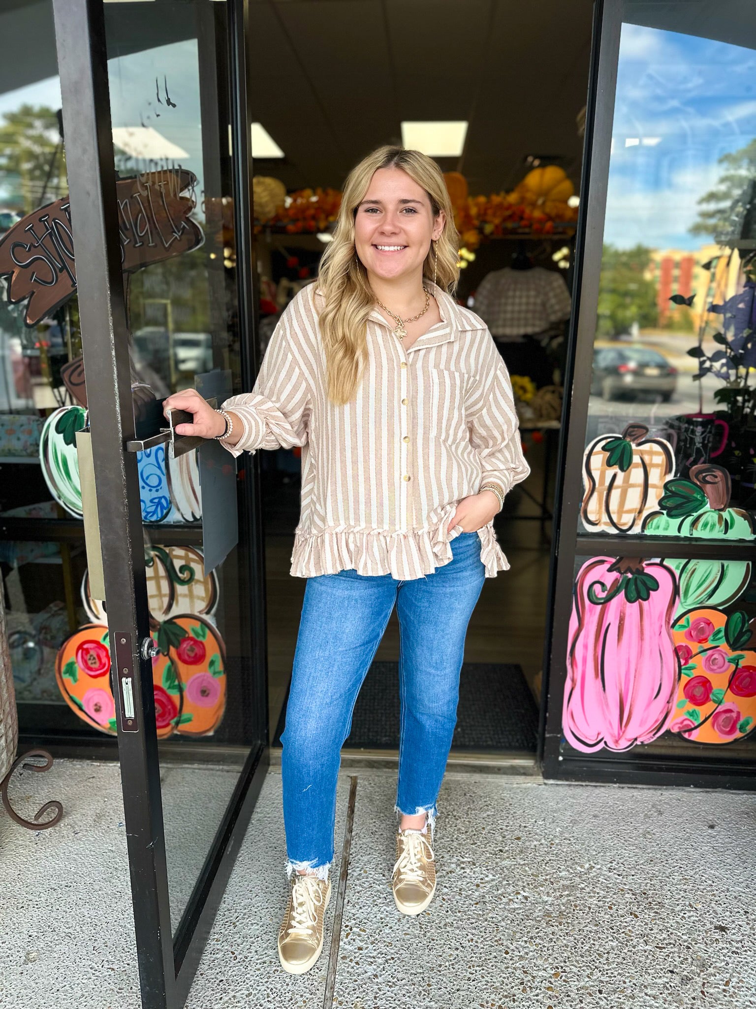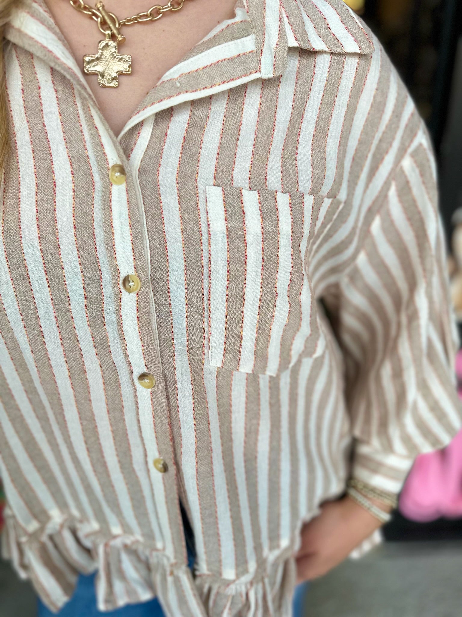 3/4 SLVS STRIPE LINEN SHIRT -BUTTON-DOWN FRONT CLOSURE -COLLARED NECKLINE -CHEST POCKET -STRIPED PATTERN