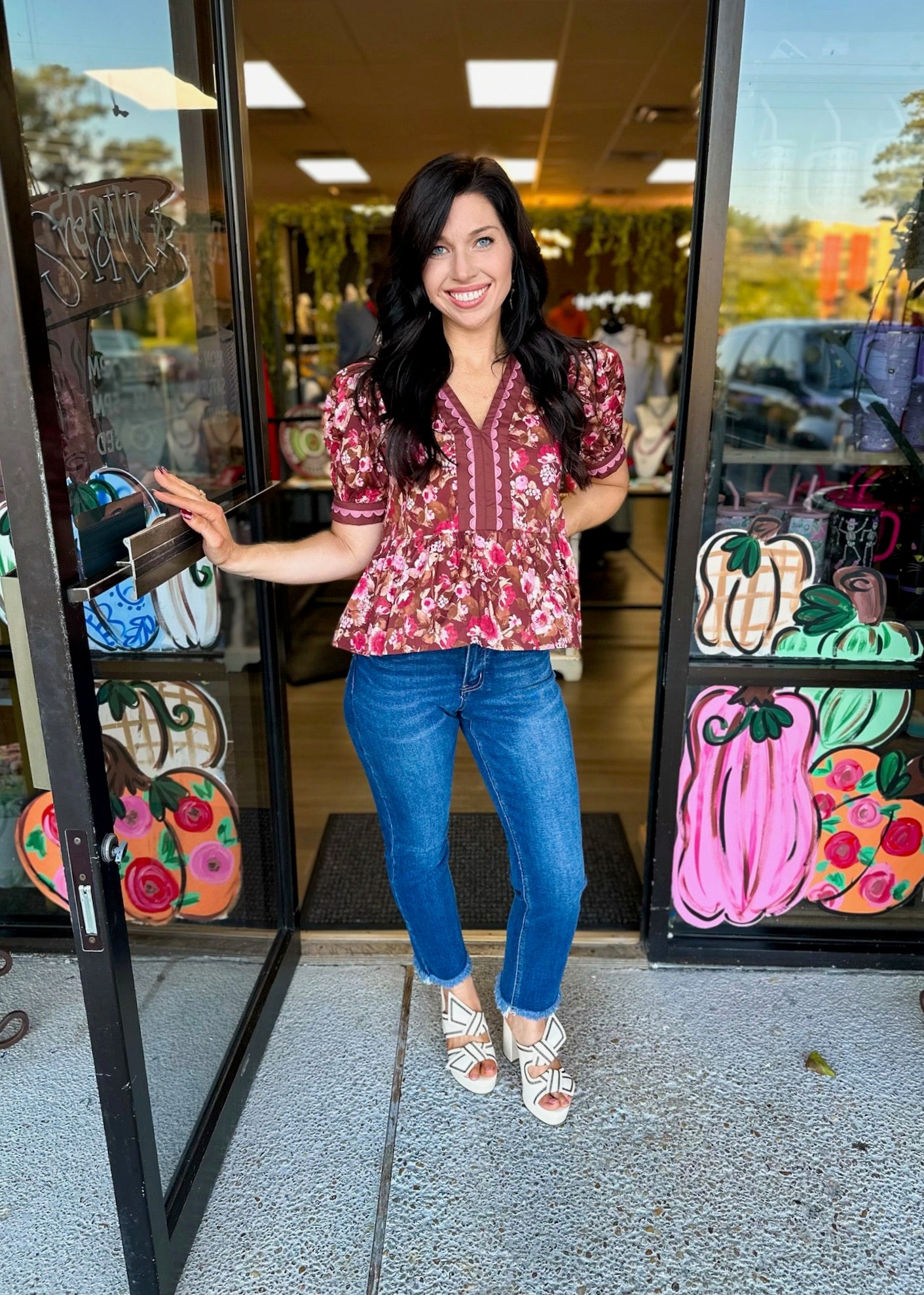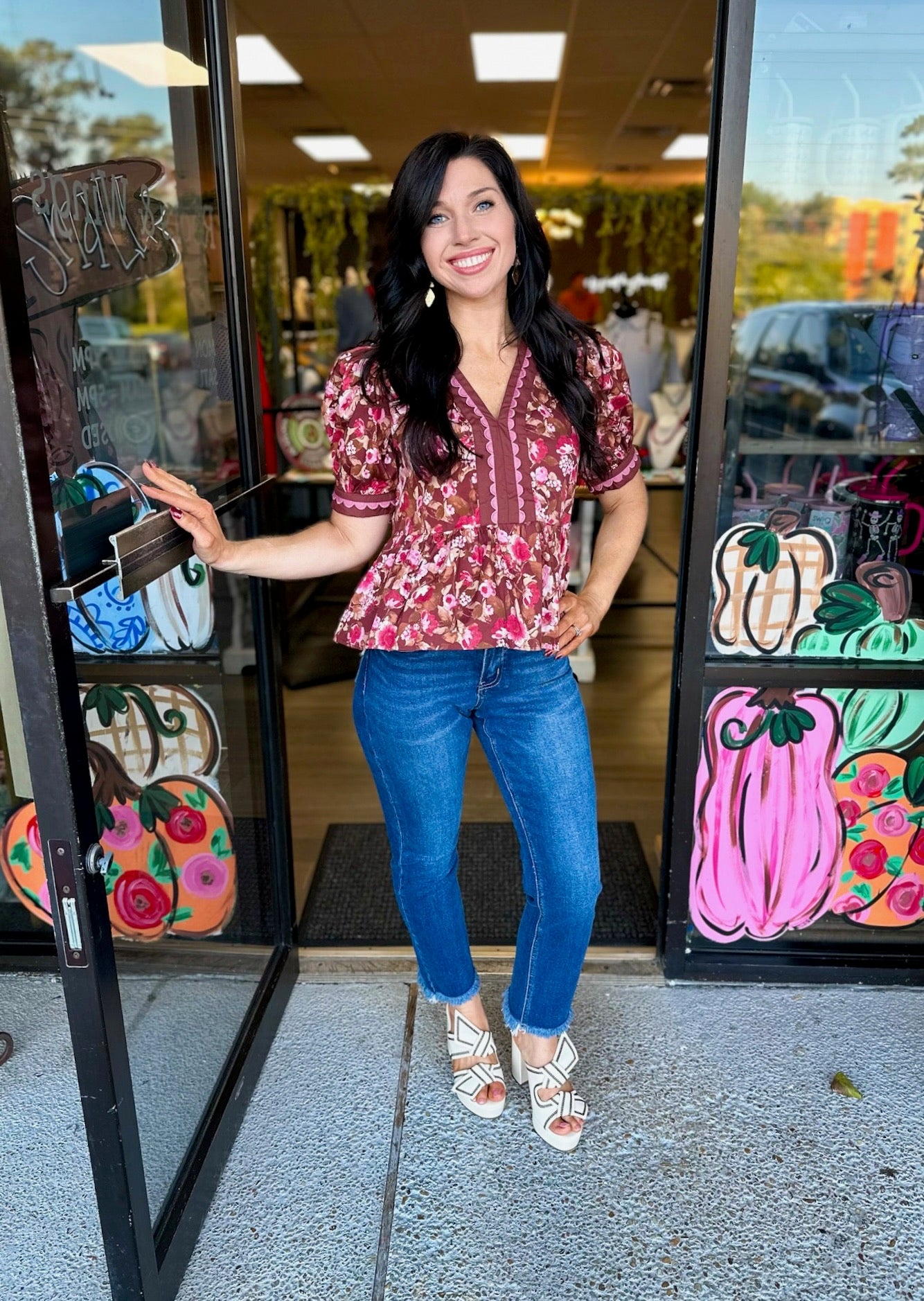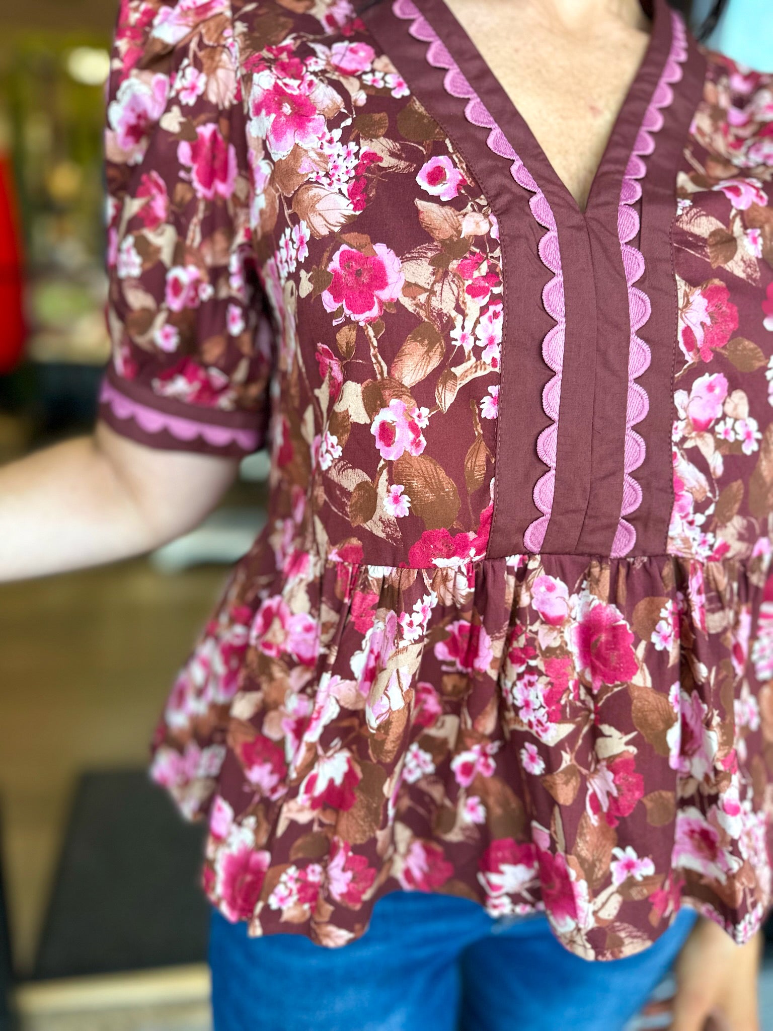 Floral print V-neck ruffle hem top featuring scallop trim accent contrast band detail. Unlined. Woven. Non-sheer. Lightweight.