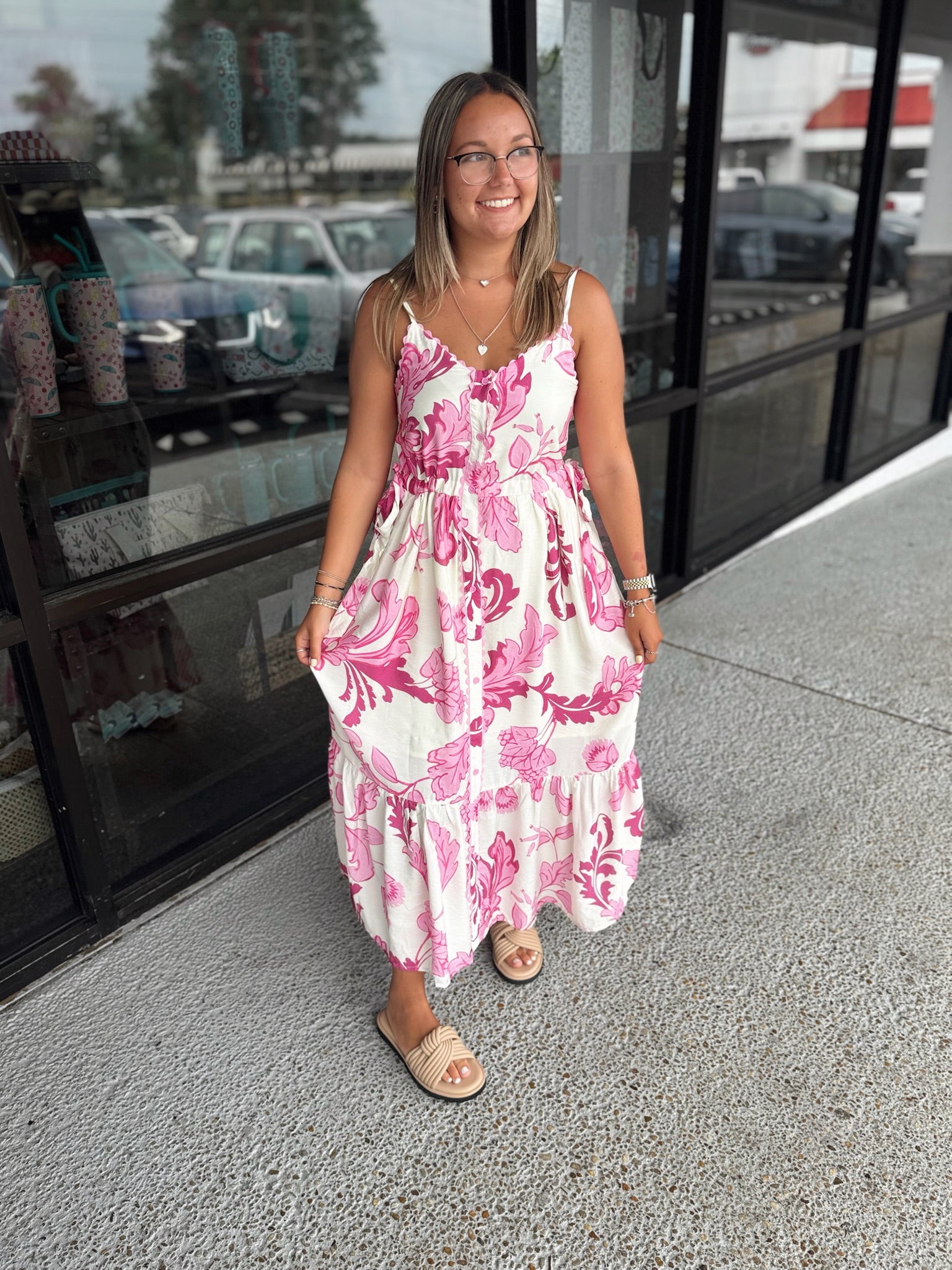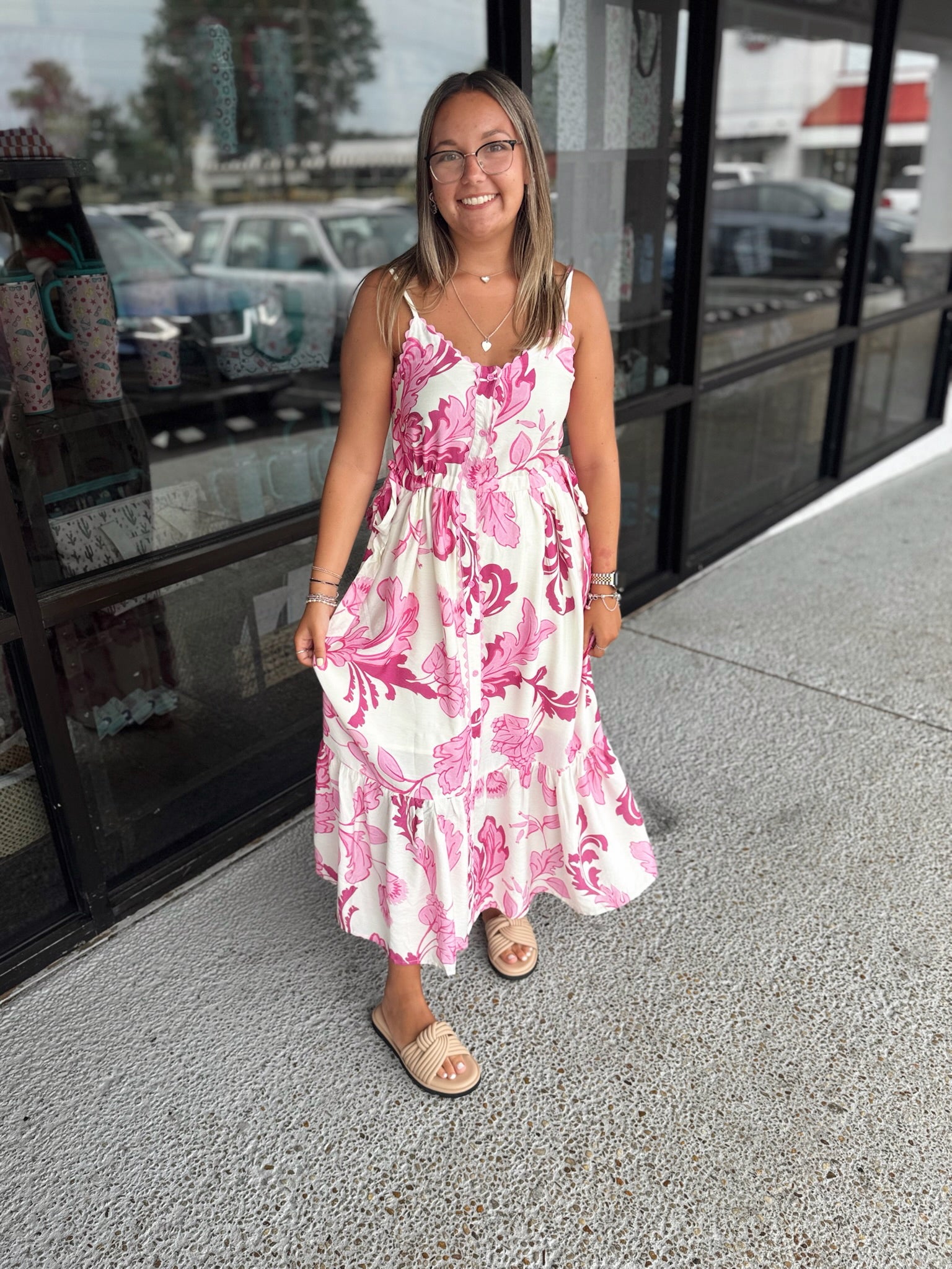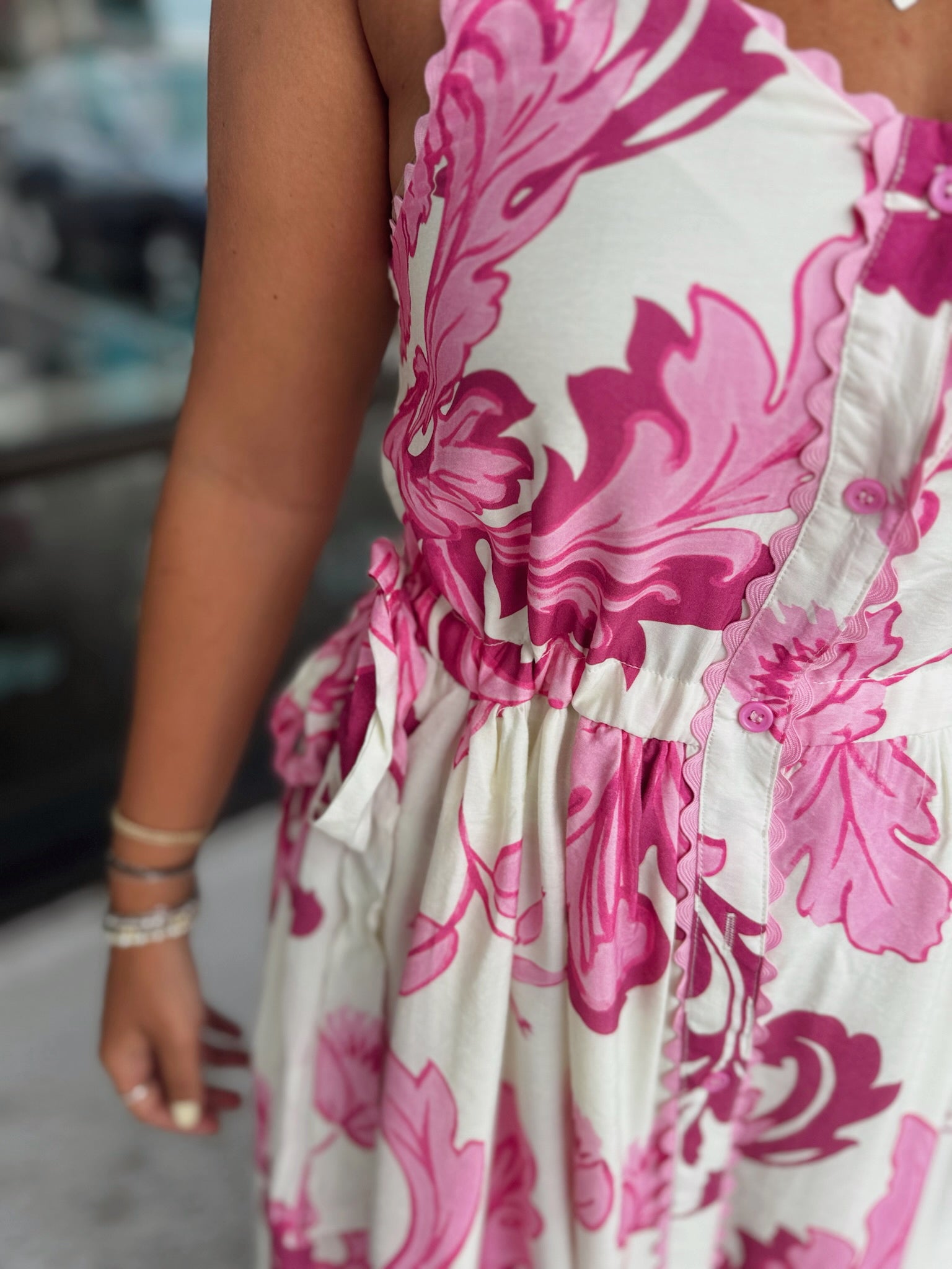 Details: Botanical print adjustable shoulder strap tiered midi dress with adjustable waist. Trim accent button front closure. Pockets at sides. Lined. Woven. Non-sheer. Lightweight.