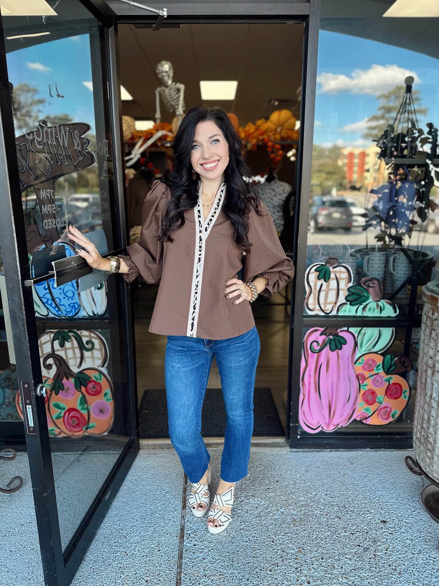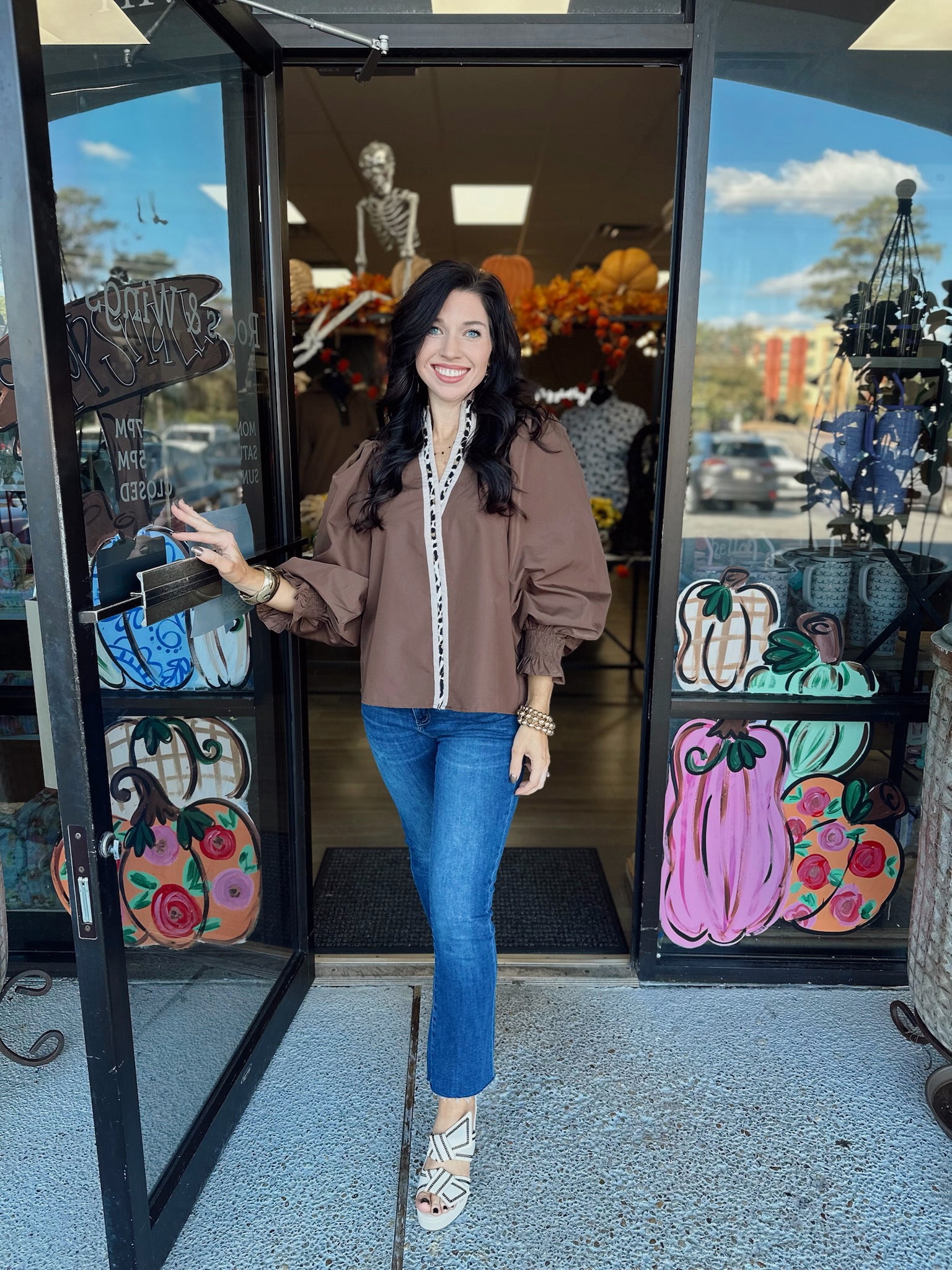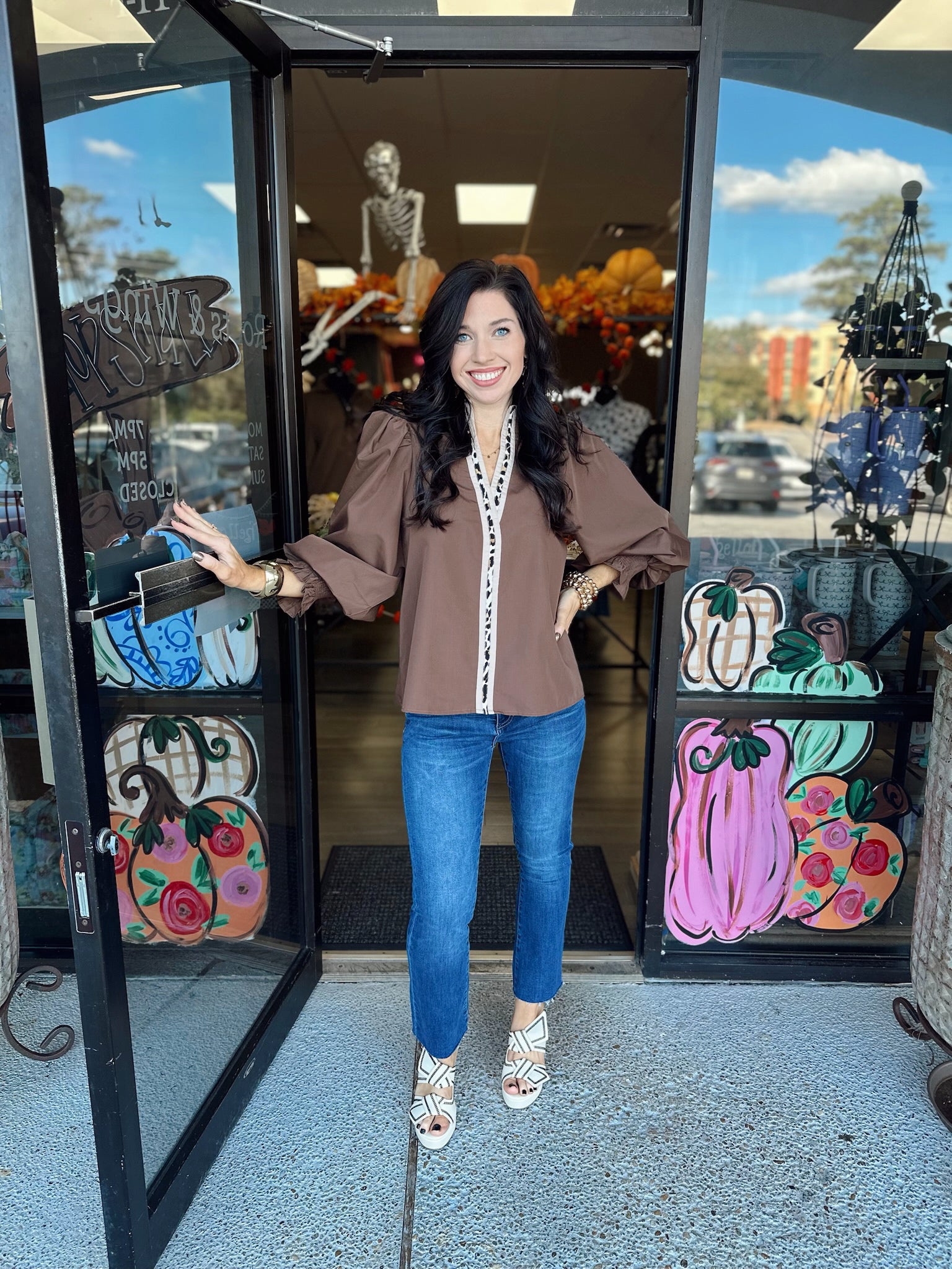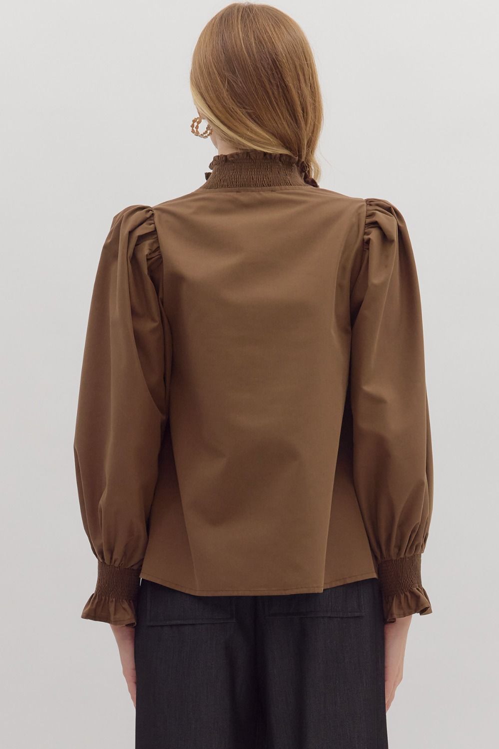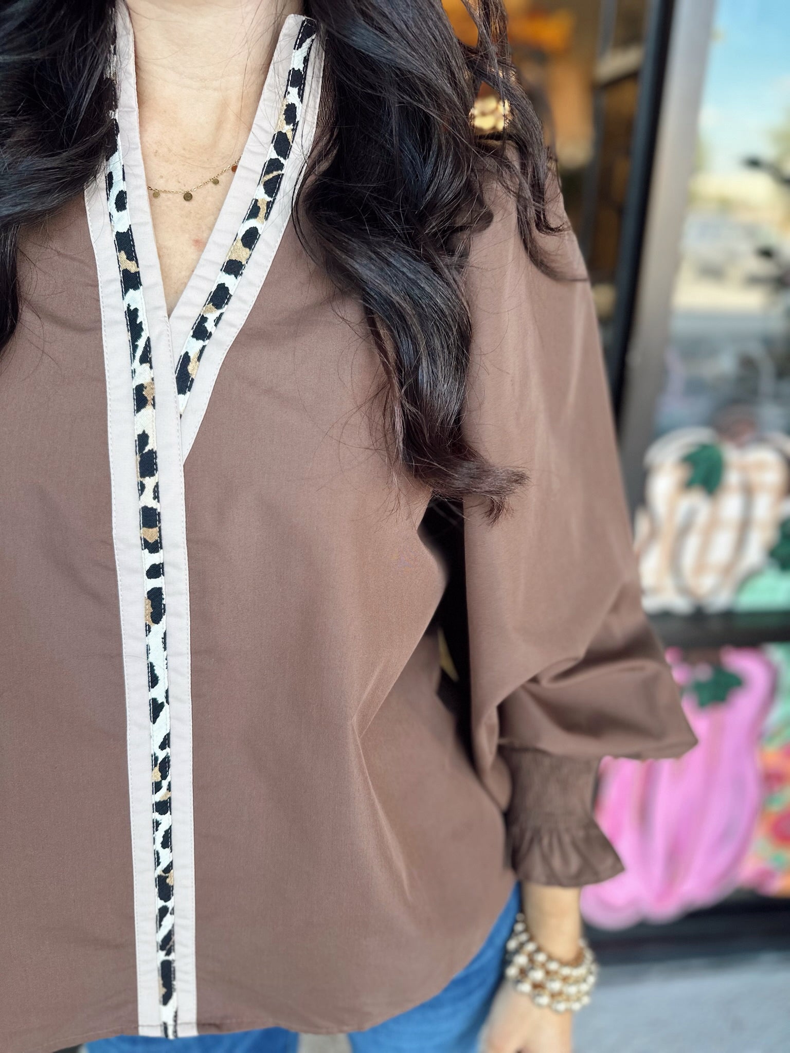 Solid long sleeve top featuring animal printed contrast at front placket and neckline. Smocked cuffs. Ruffled mock neck. Unlined. Non-sheer. Woven. Lightweight.