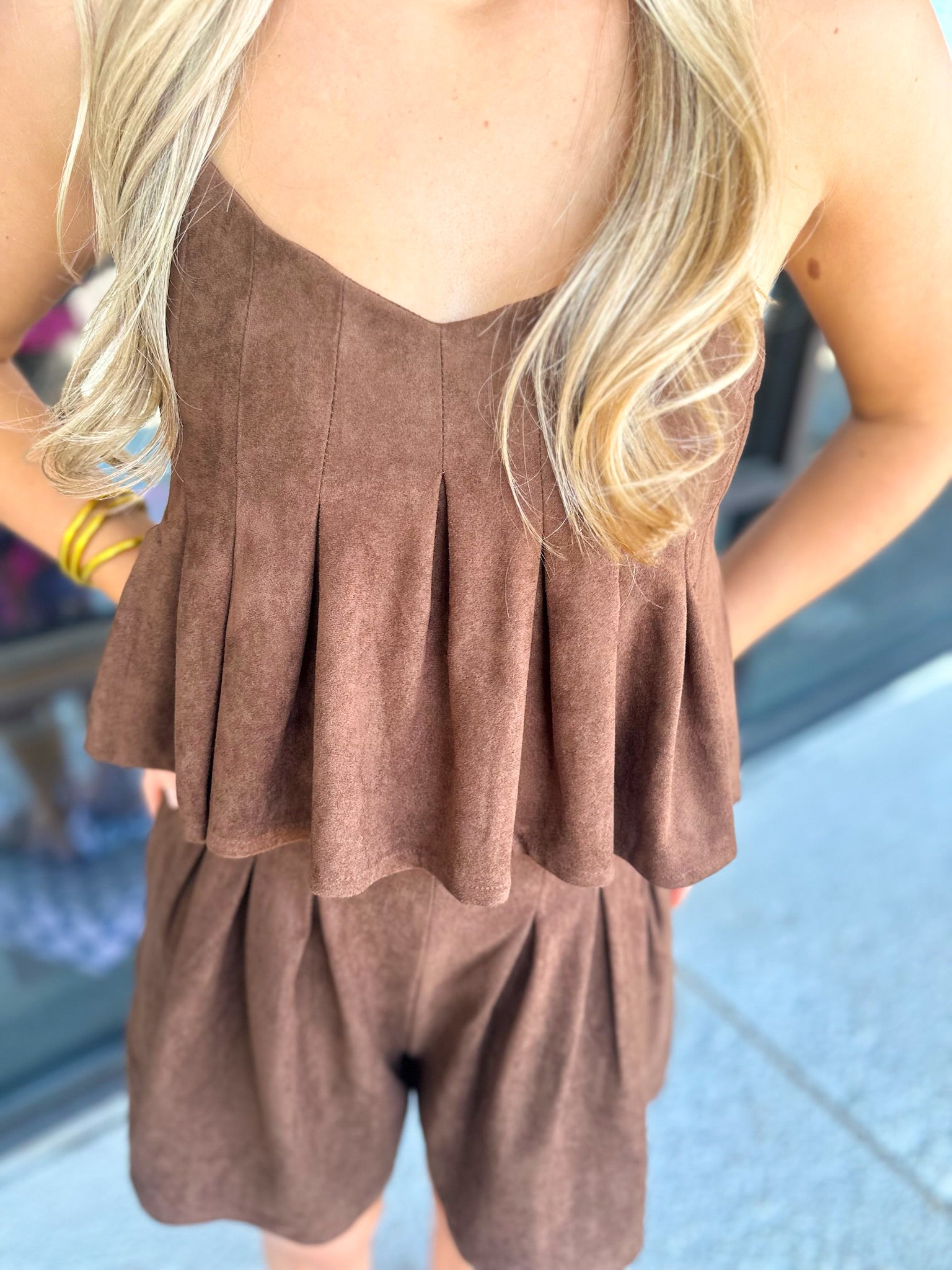 SUEDE PLEATED SLEEVELESS TOP AND SHORTS SET