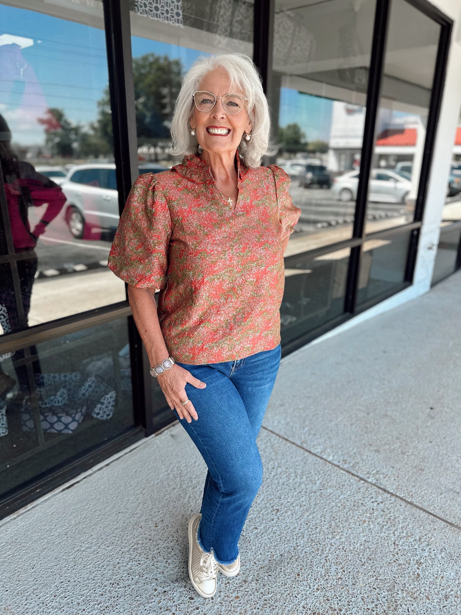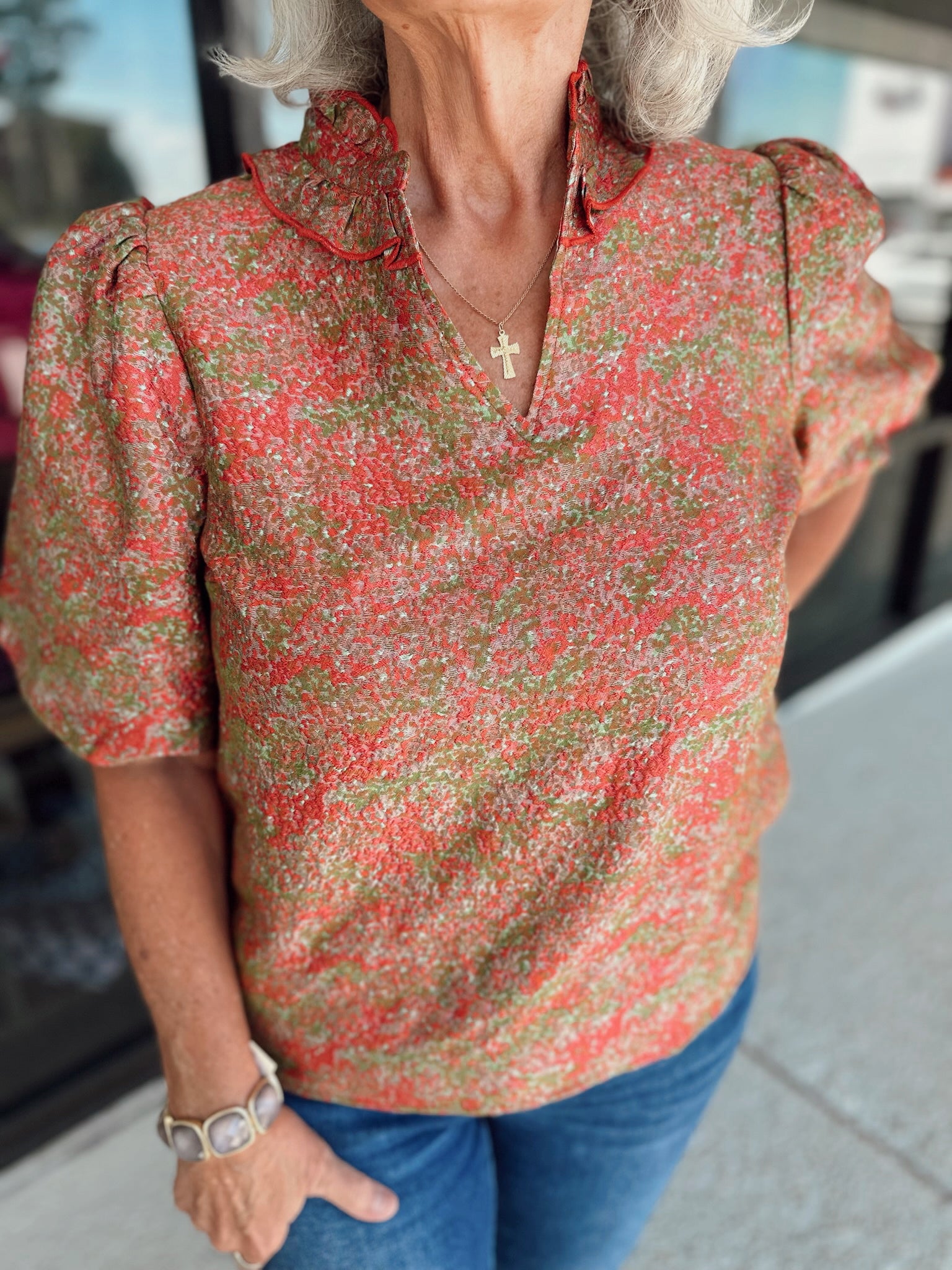 V-neckline - Short bubble sleeve - Ruffled collar detail - Jaquard abstract print woven fabric