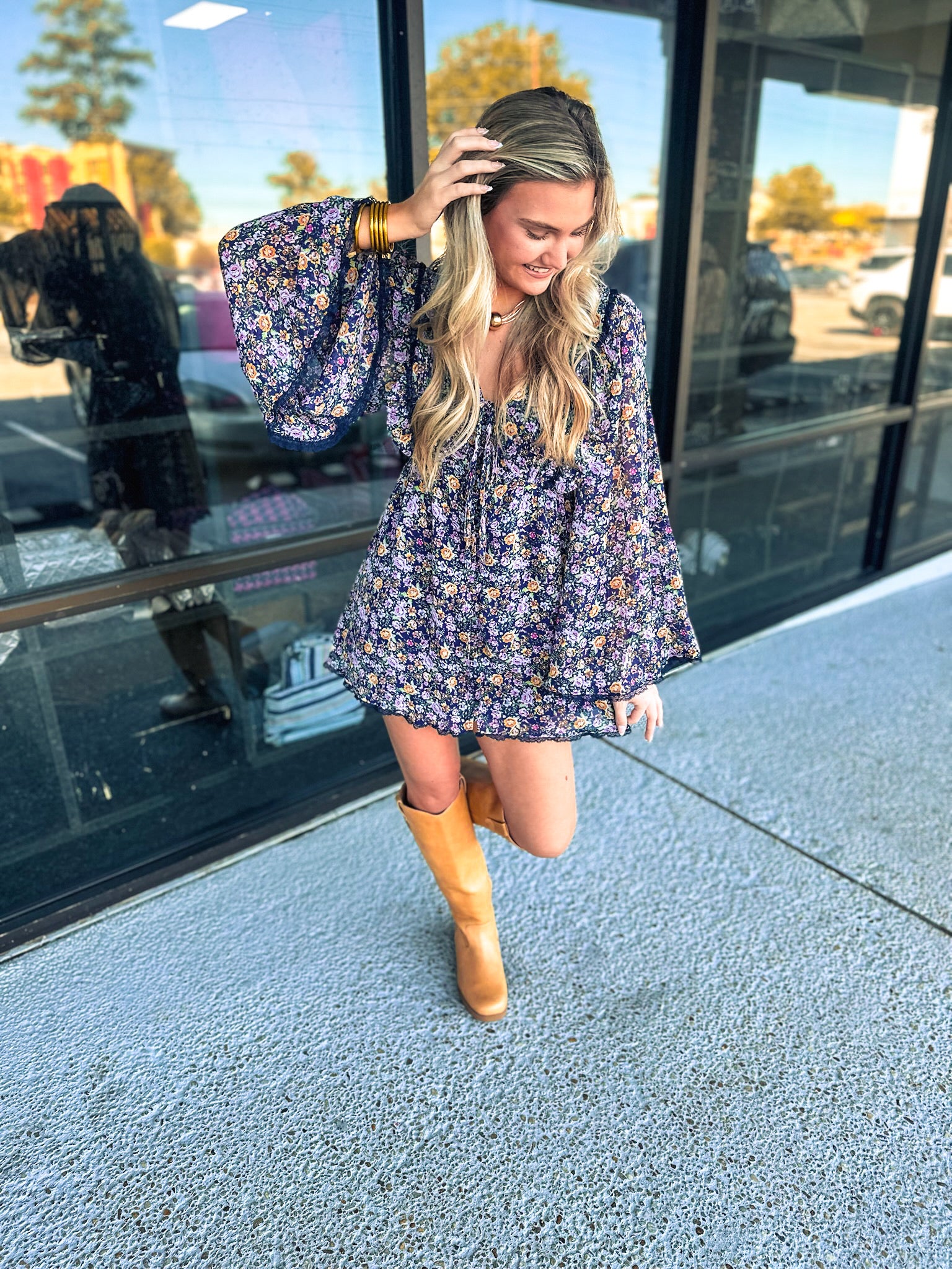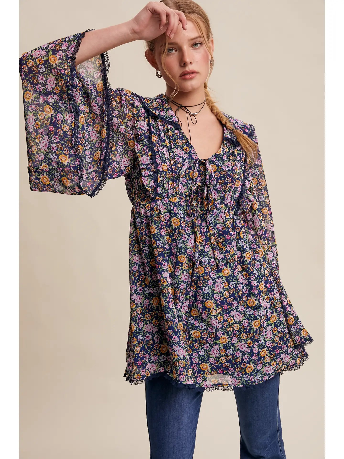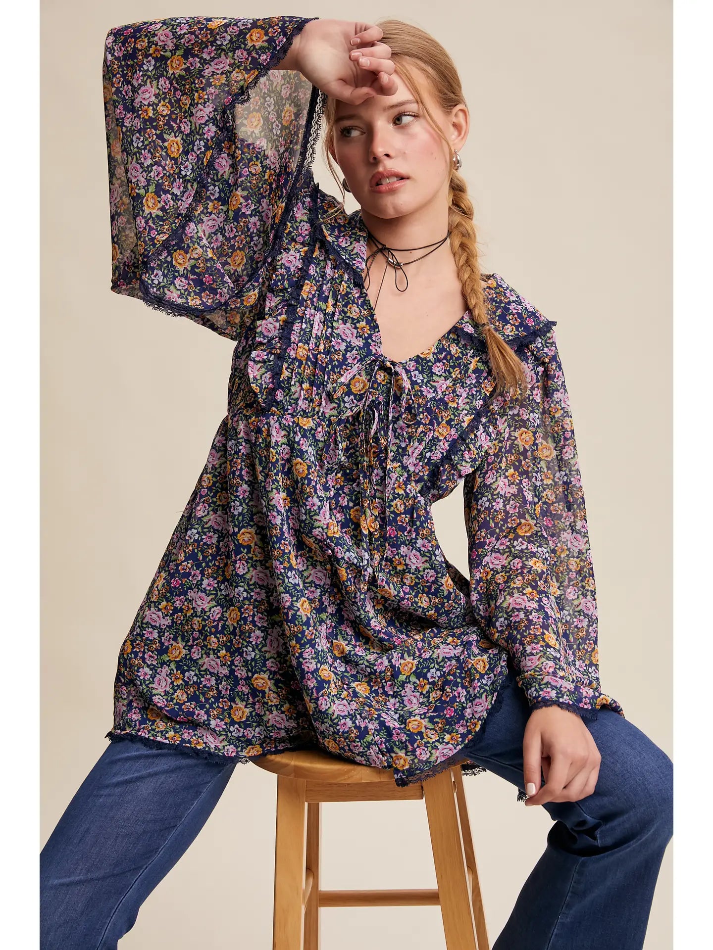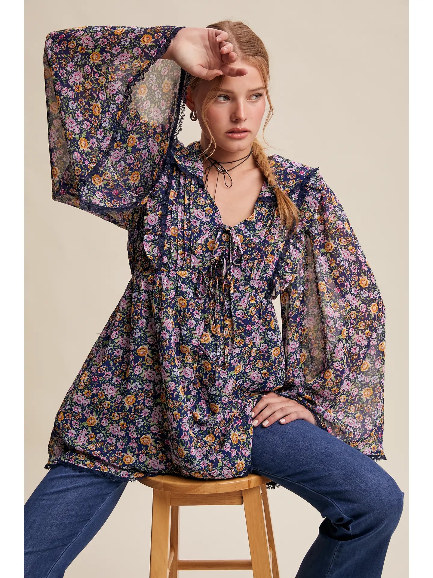Sheer Floral Chiffon: Lightweight woven fabric with a vintage-inspired rose print - Full Lining: Body is lined for comfortable coverage, sleeves remain sheer for flowy movement - Bell Sleeves: Dramatic wide sleeves create a soft, romantic silhouette - Lace Trim Details: Scalloped lace edges at the collar, hem, and sleeves add a delicate finish - Drawstring Waist & Bust: Adjustable tie at the bust for a flattering shape with subtle gathering - Button-Front Closure: Functional buttons allow for flexible styling