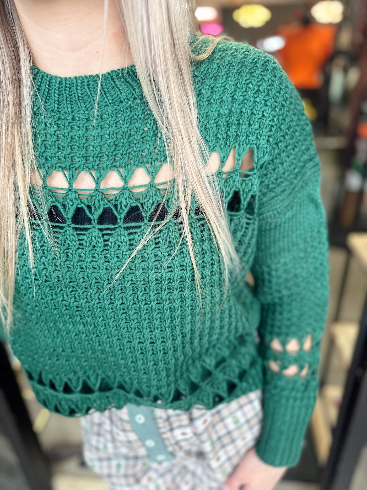 Textured Knit: Chunky open-knit construction for a cozy yet breathable feel - Cutout Detailing: Horizontal openwork rows across the bodice and sleeves add a bold, modern twist - Crew Neckline: Classic ribbed neckline for easy layering - Long Sleeves: Relaxed fit with ribbed cuffs to keep the shape - Ribbed Hem: Finished edge with subtle scallop for a polished touch - Relaxed Silhouette: Designed for an effortless drape, perfect with jeans, skirts, or layered over dresses