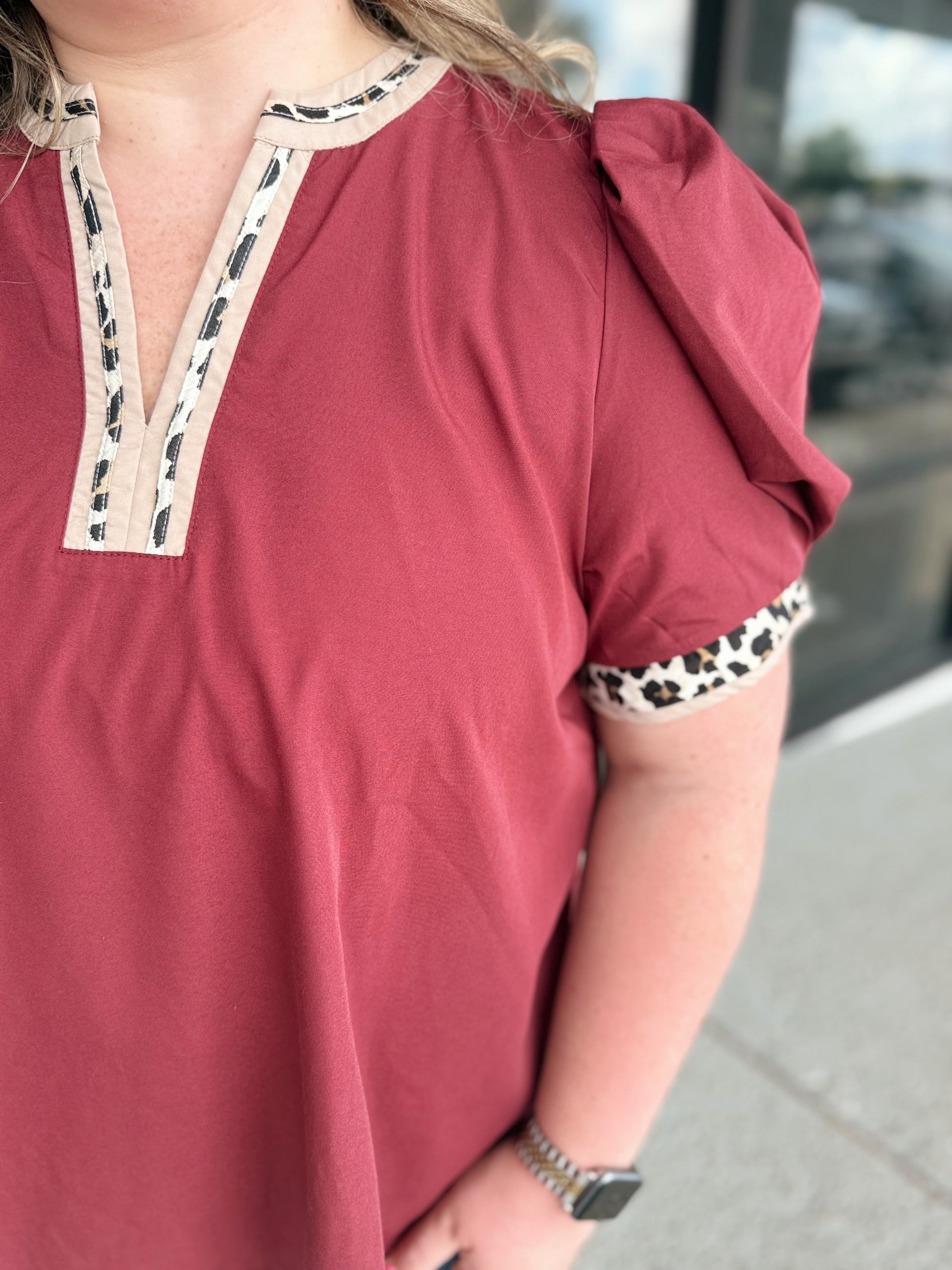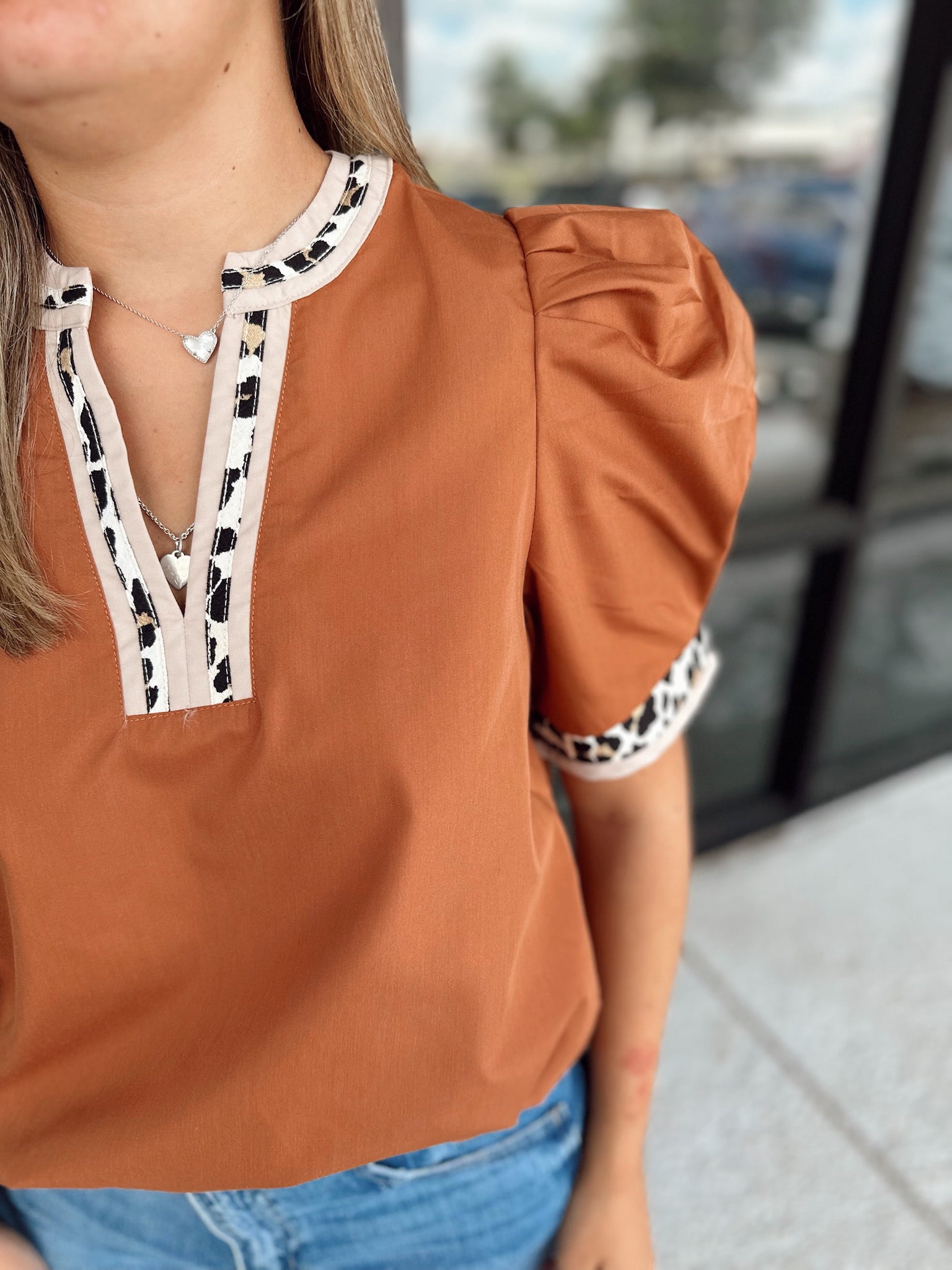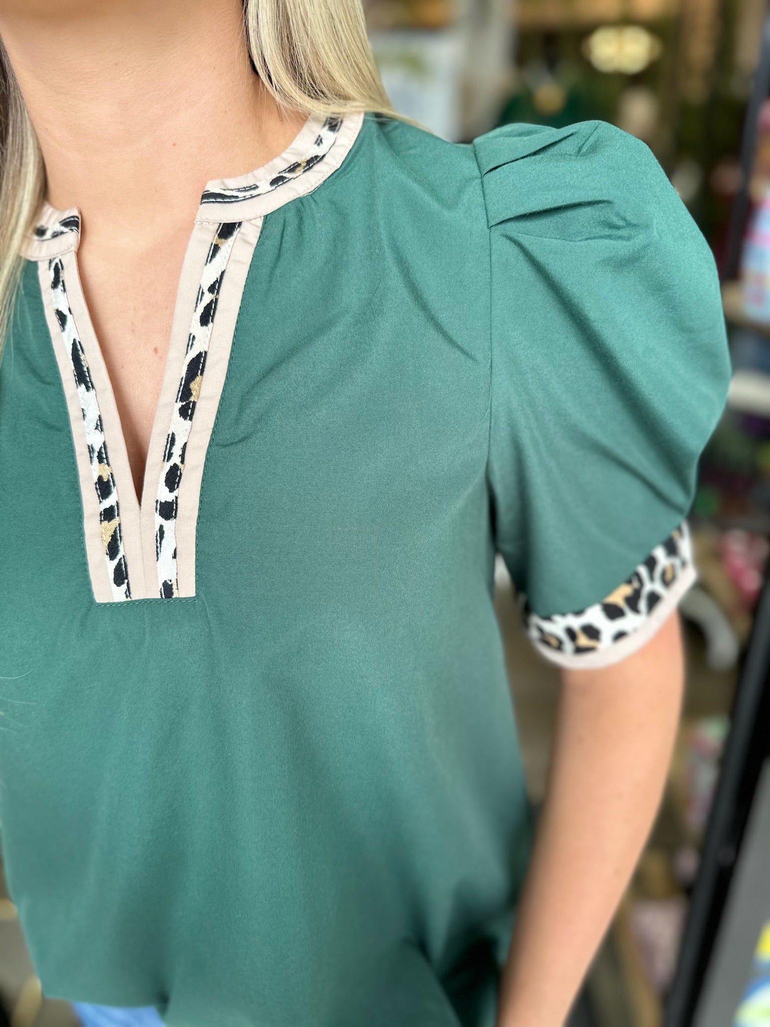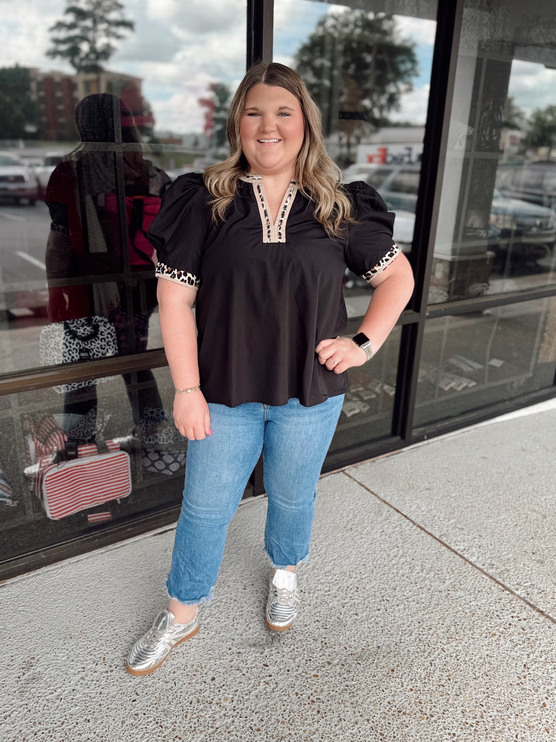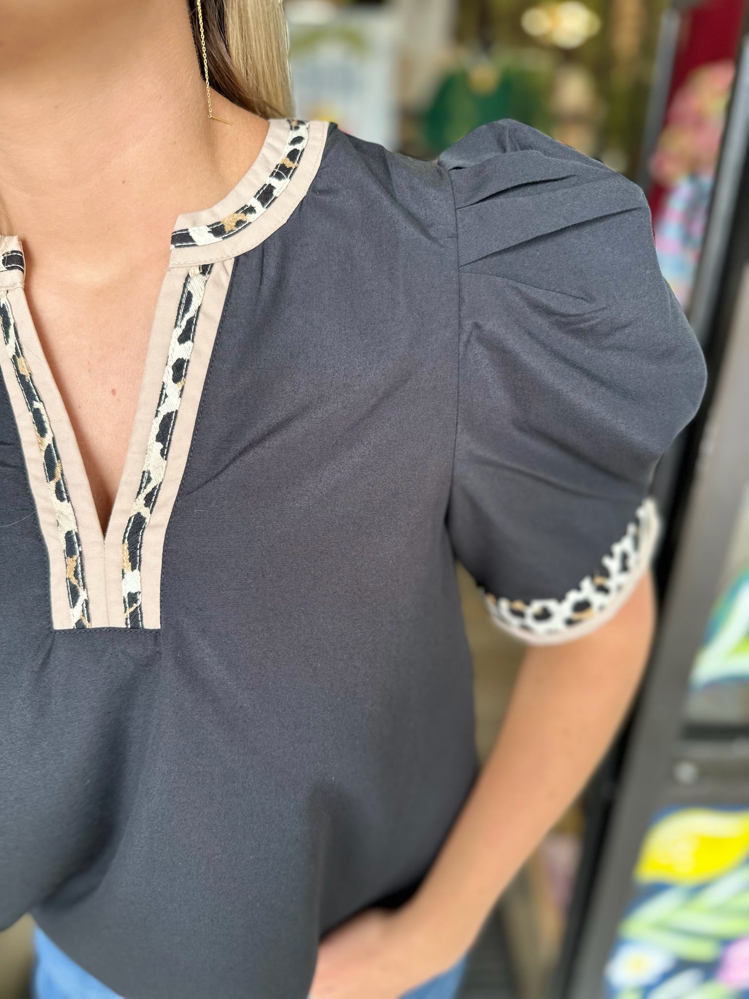 Solid band cuff short puff sleeve pullover top featuring scallop edge 3D floral applique chelsea collar. Lined. Woven. Non-sheer. Lightweight.