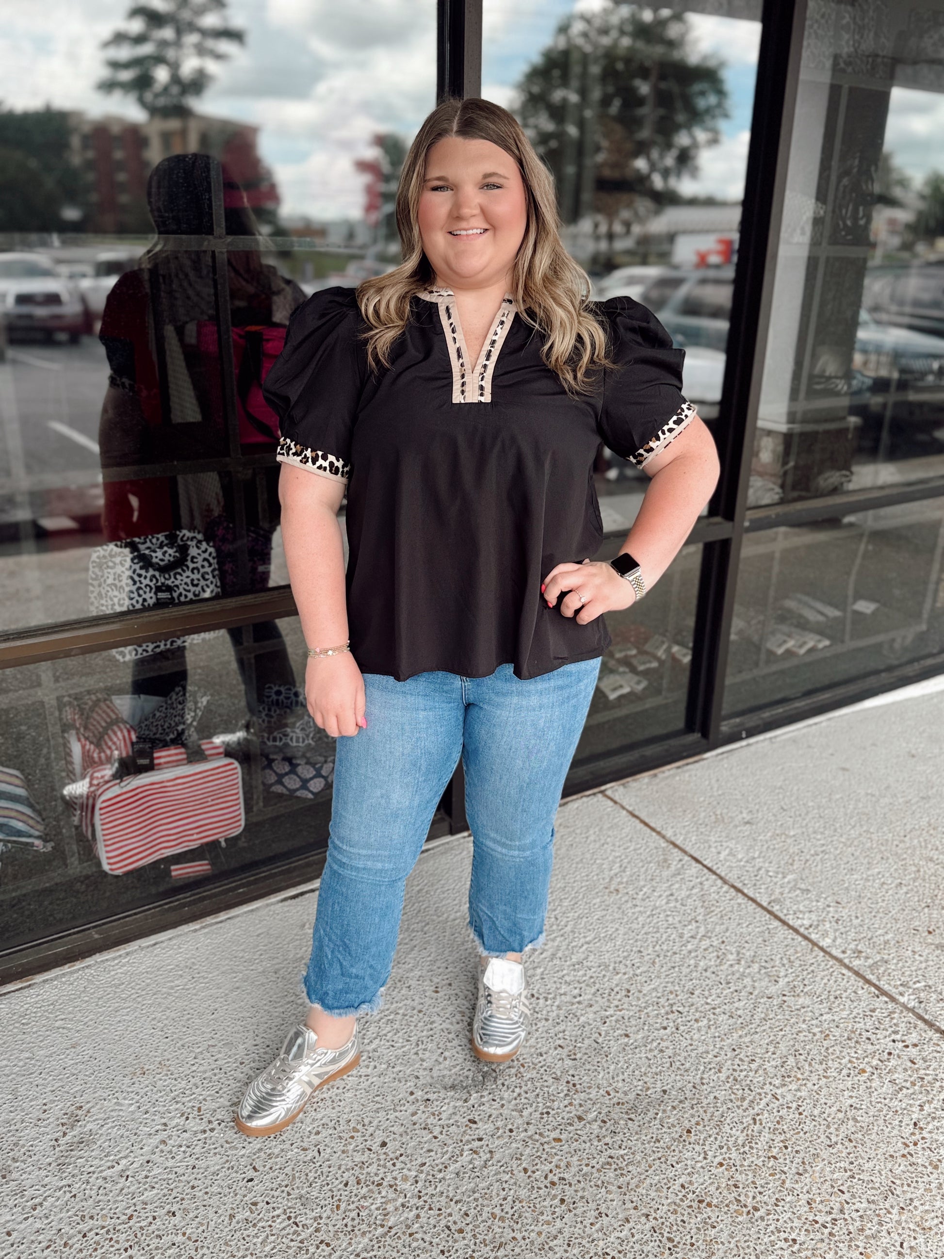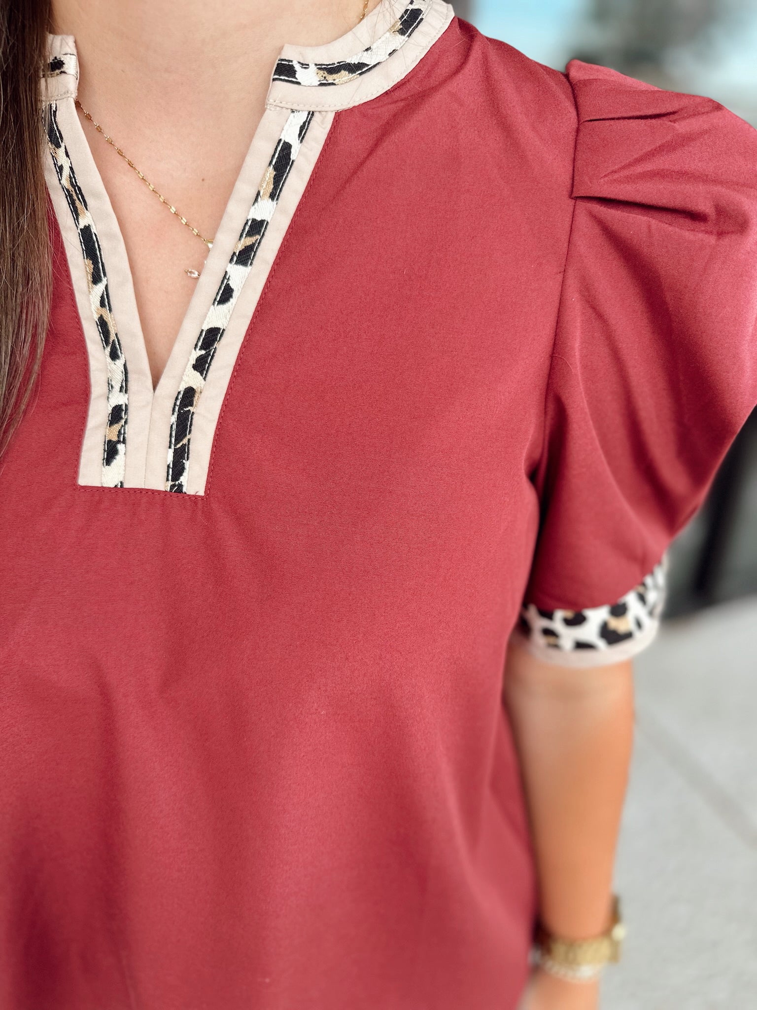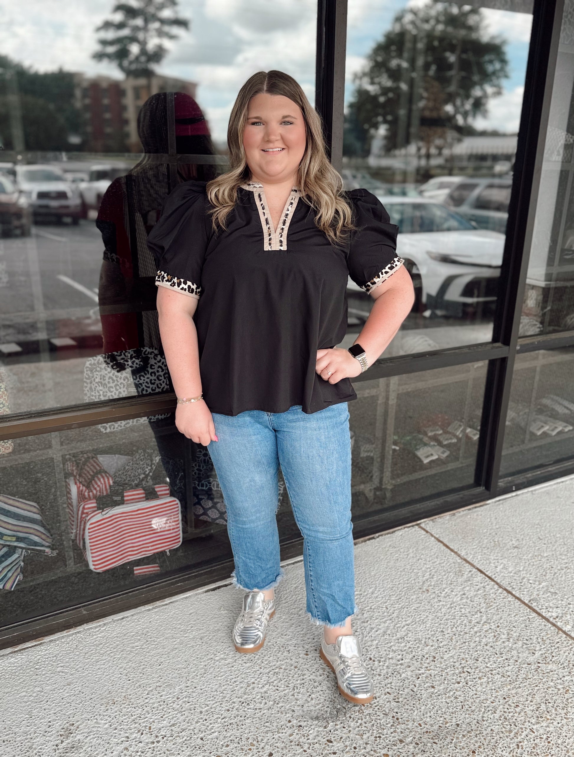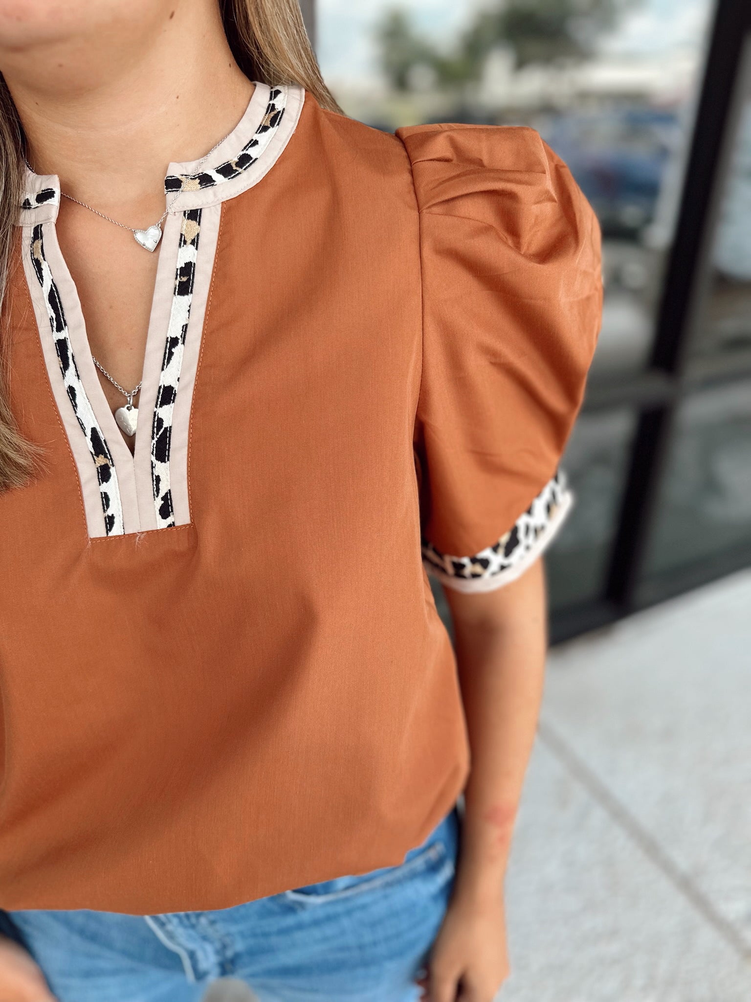 Solid band cuff short puff sleeve pullover top featuring scallop edge 3D floral applique chelsea collar. Lined. Woven. Non-sheer. Lightweight.