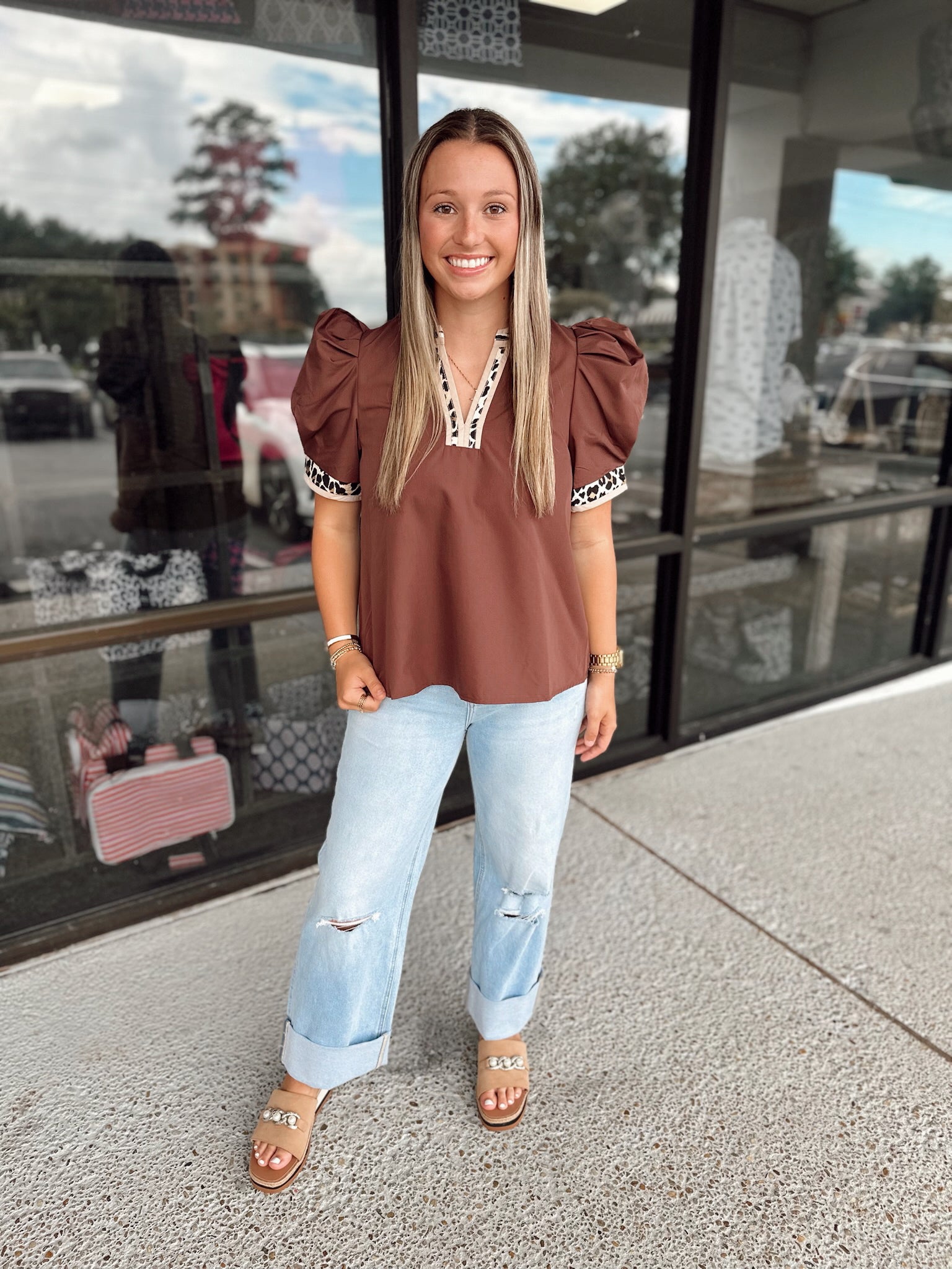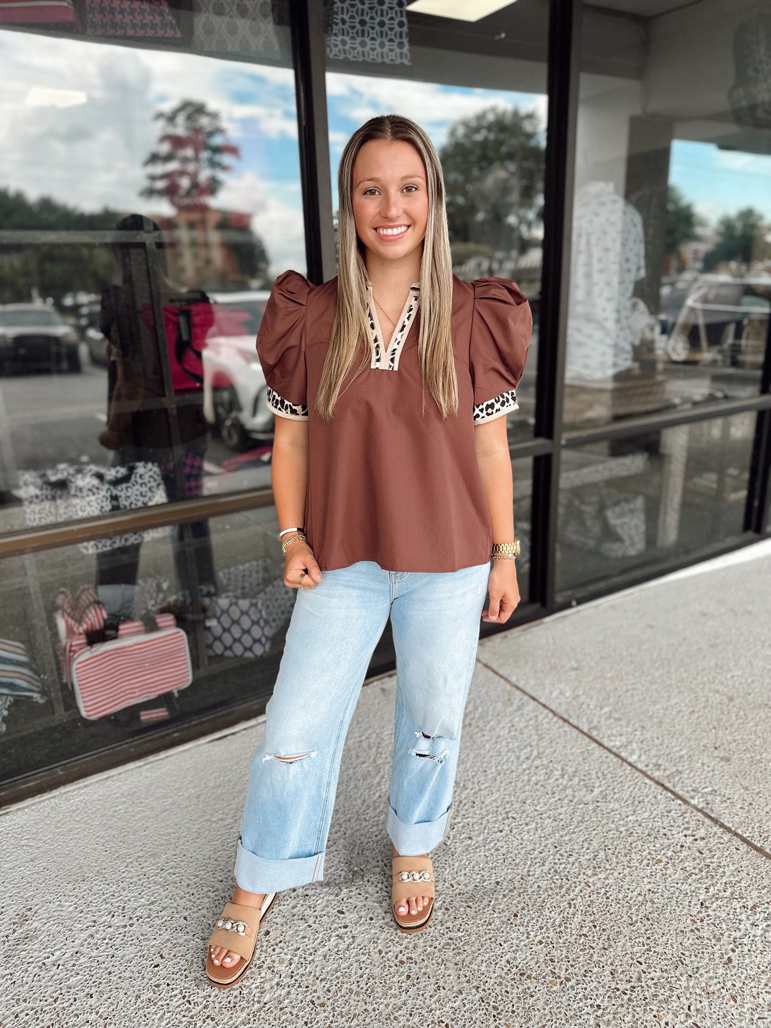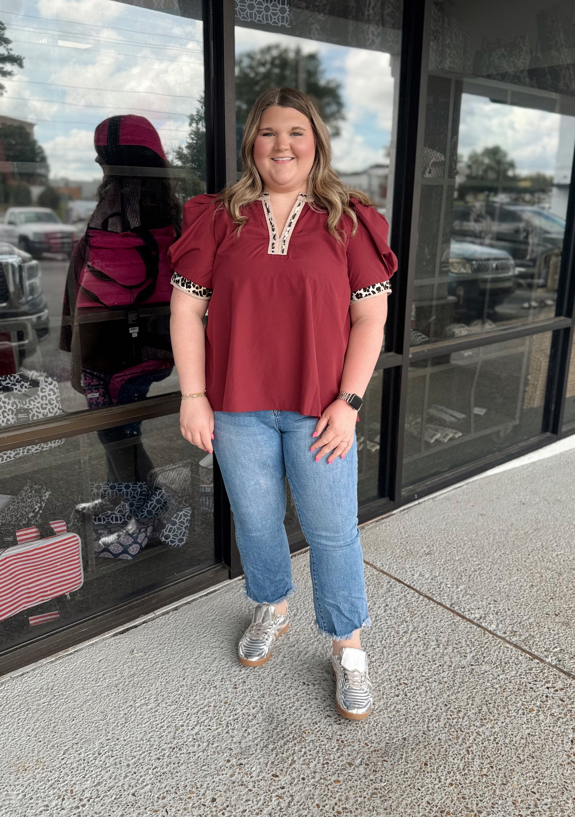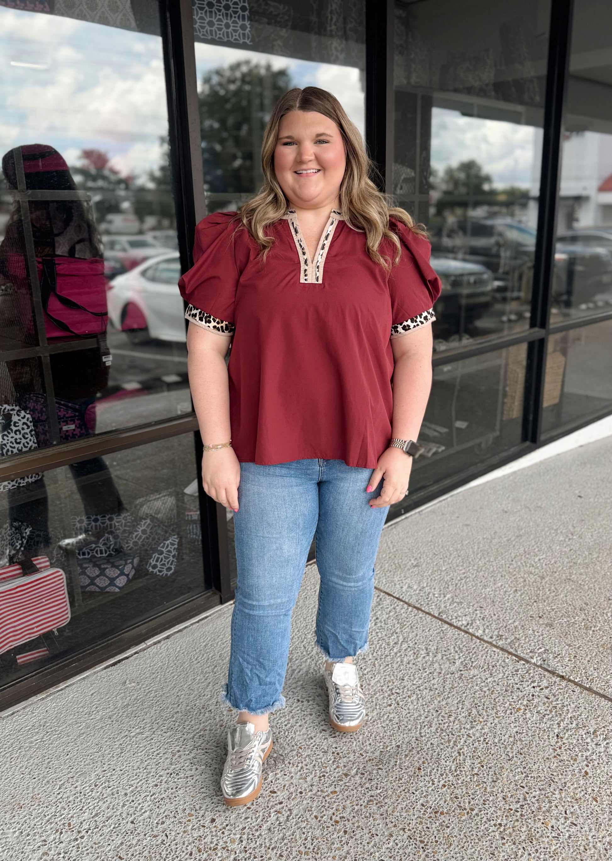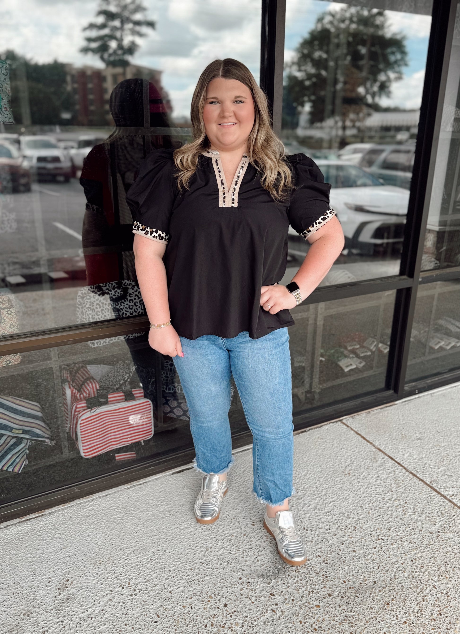 Solid band cuff short puff sleeve pullover top featuring scallop edge 3D floral applique chelsea collar. Lined. Woven. Non-sheer. Lightweight.
