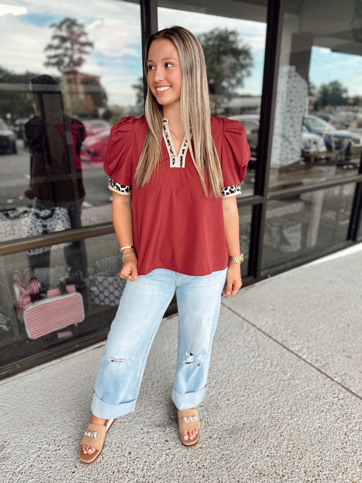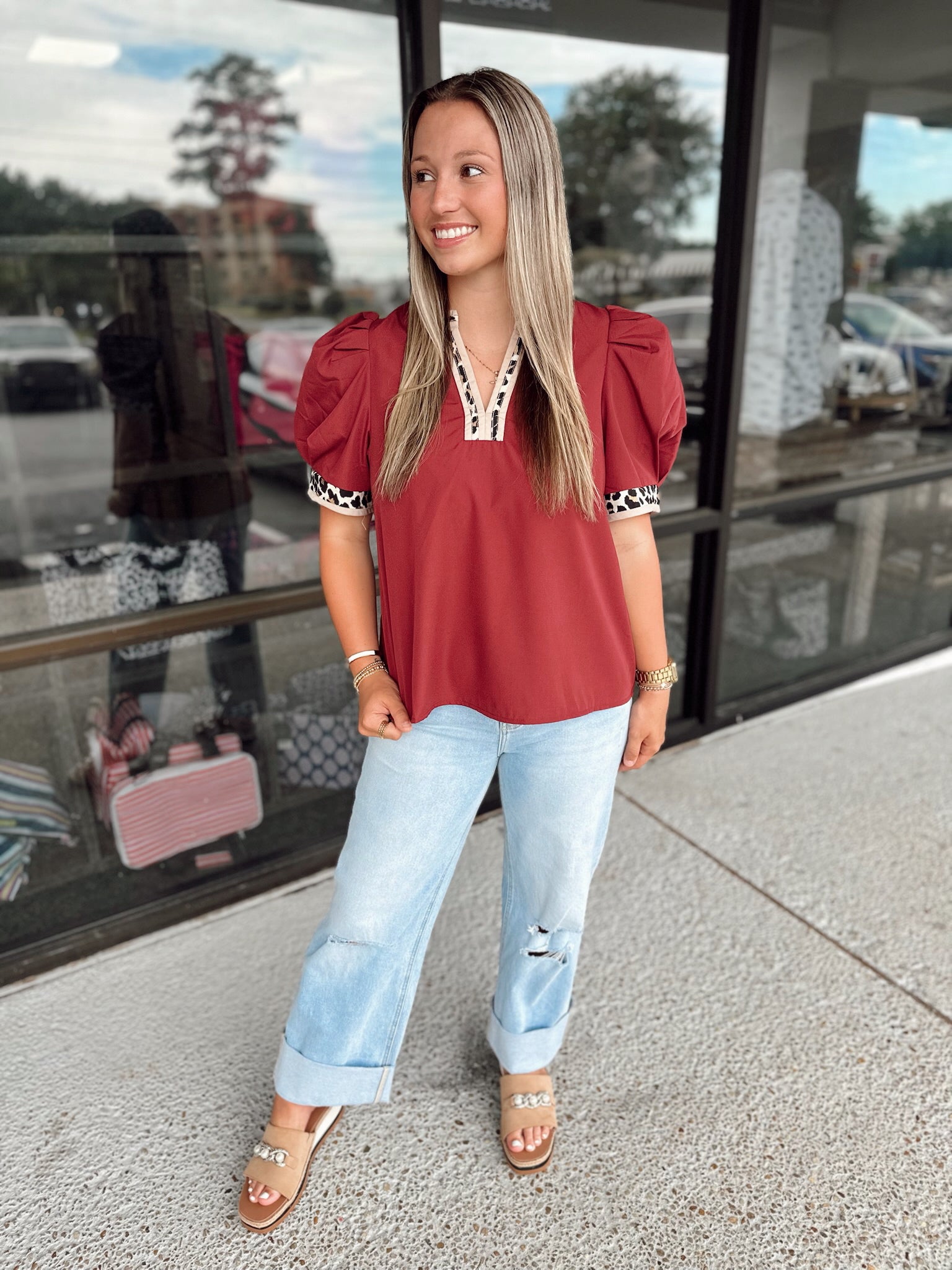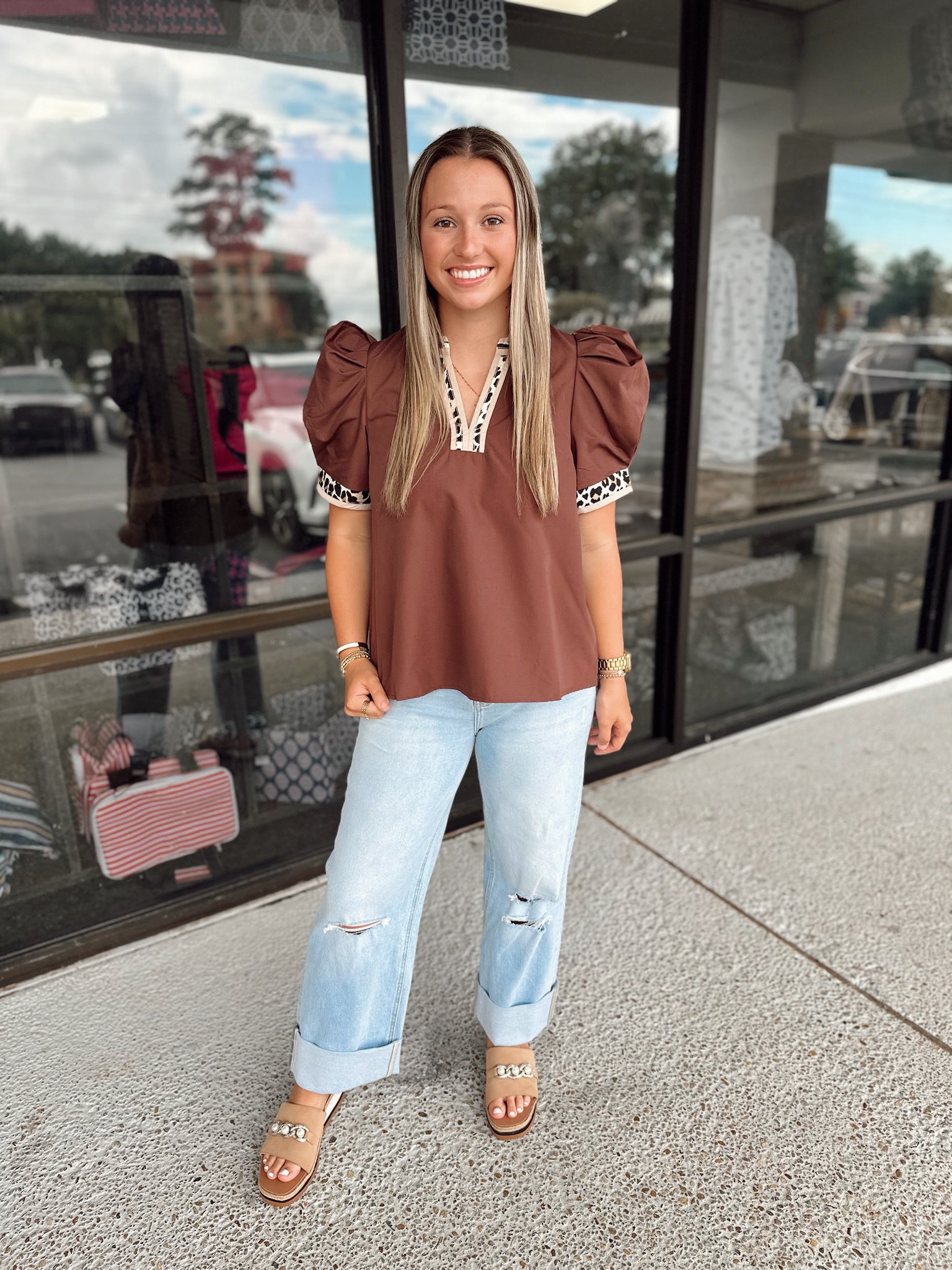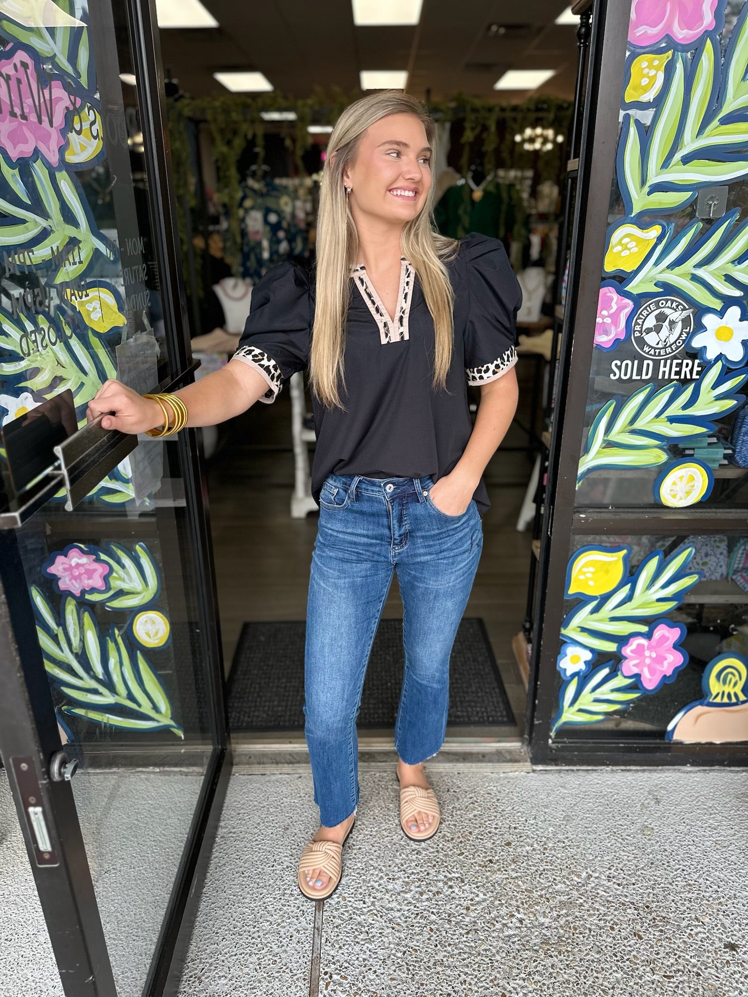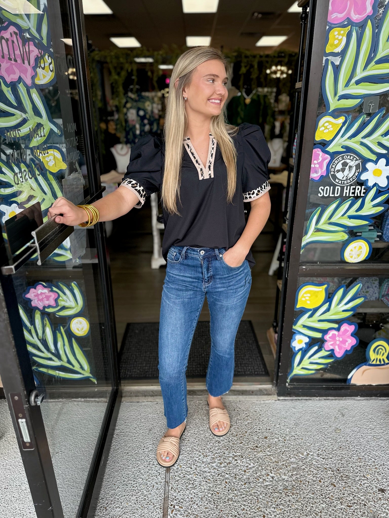 Solid band cuff short puff sleeve pullover top featuring scallop edge 3D floral applique chelsea collar. Lined. Woven. Non-sheer. Lightweight.