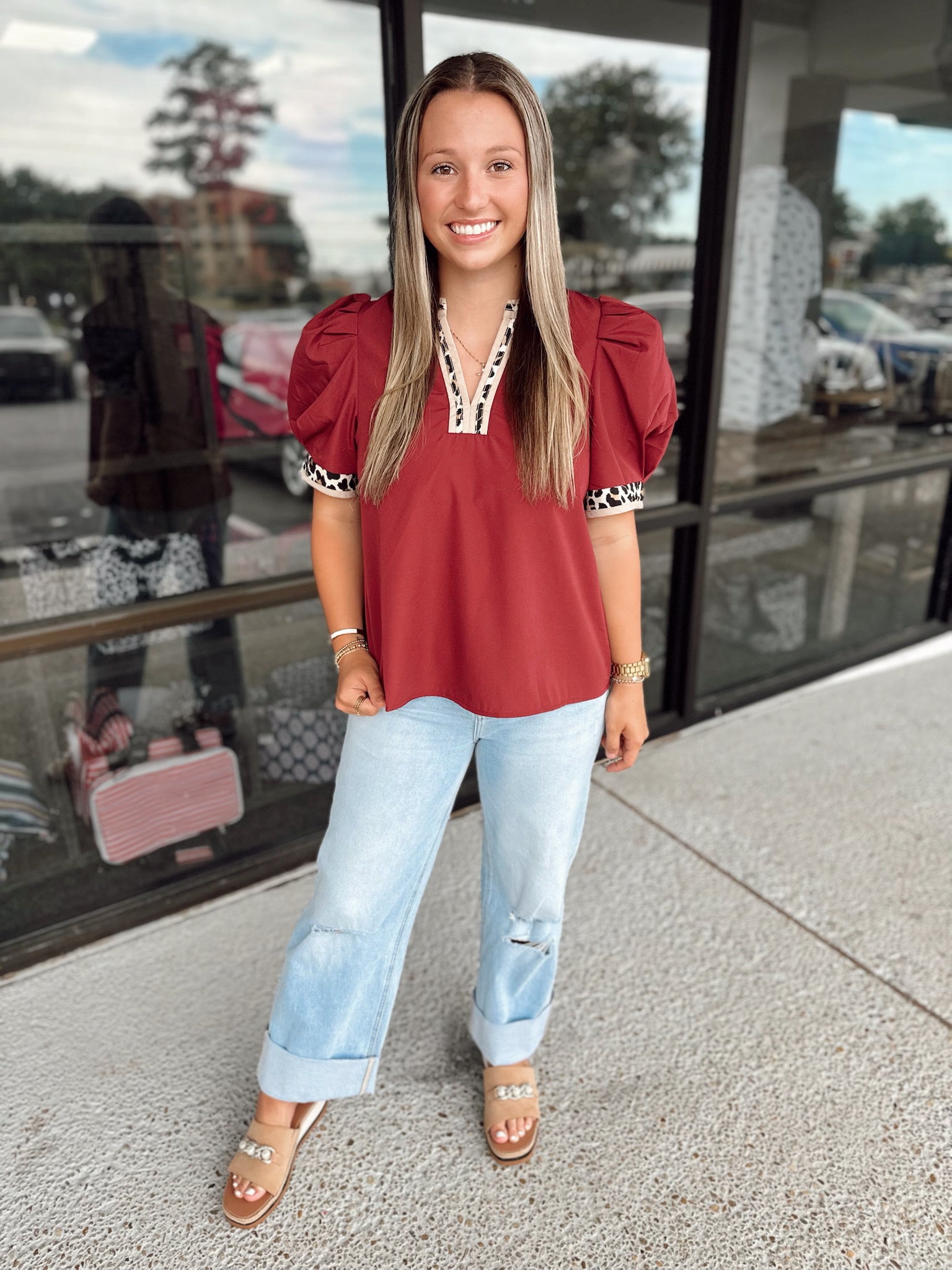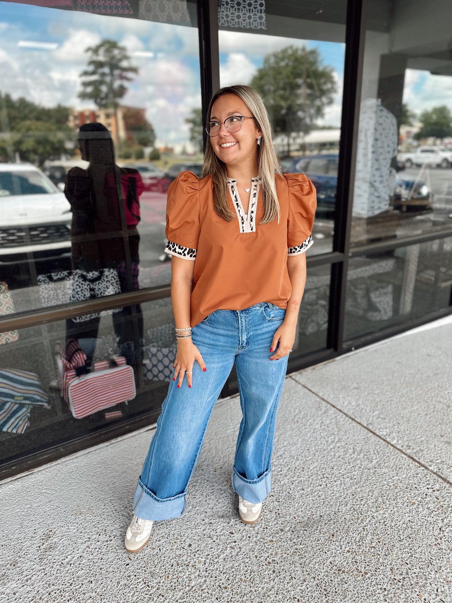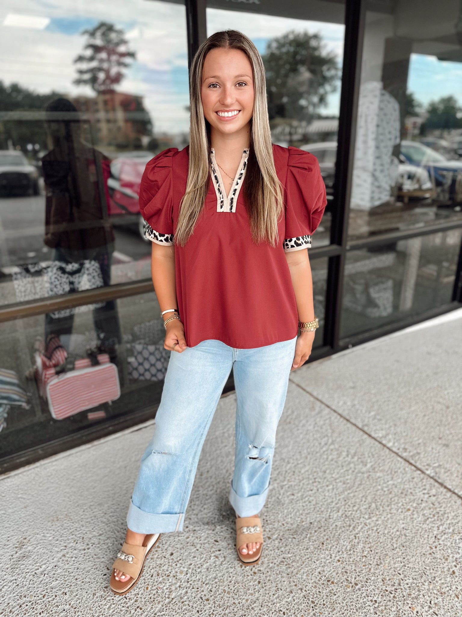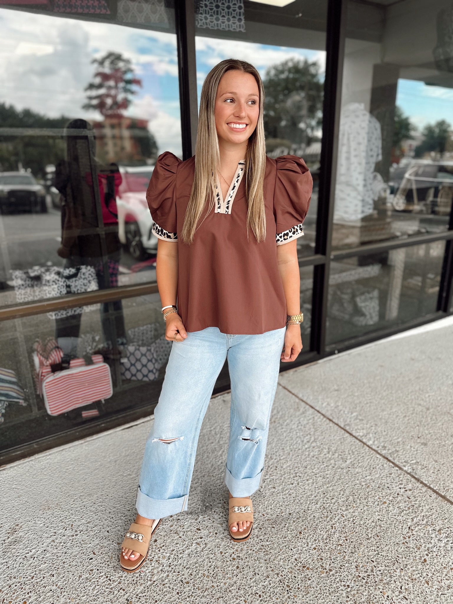 Solid band cuff short puff sleeve pullover top featuring scallop edge 3D floral applique chelsea collar. Lined. Woven. Non-sheer. Lightweight.