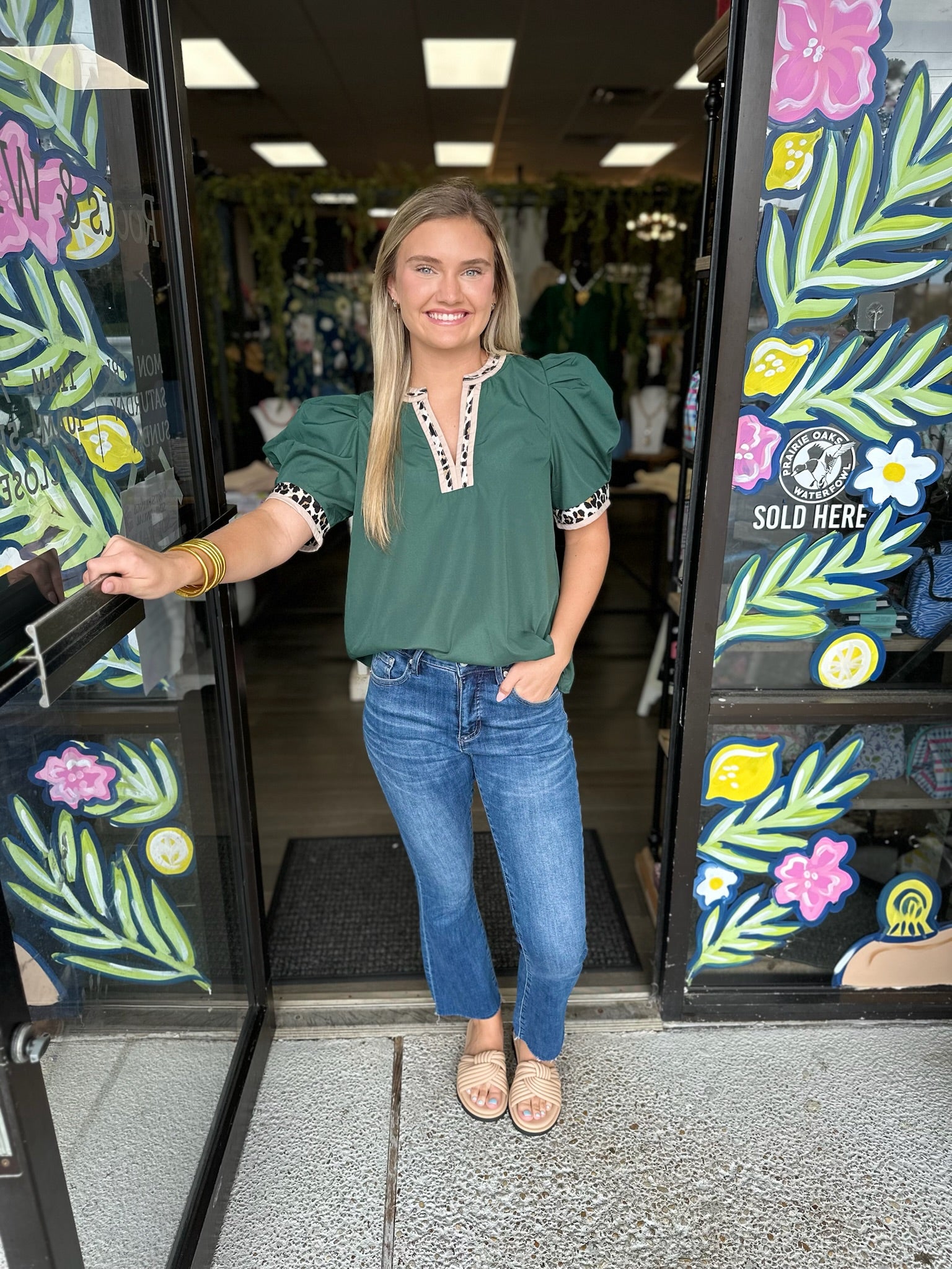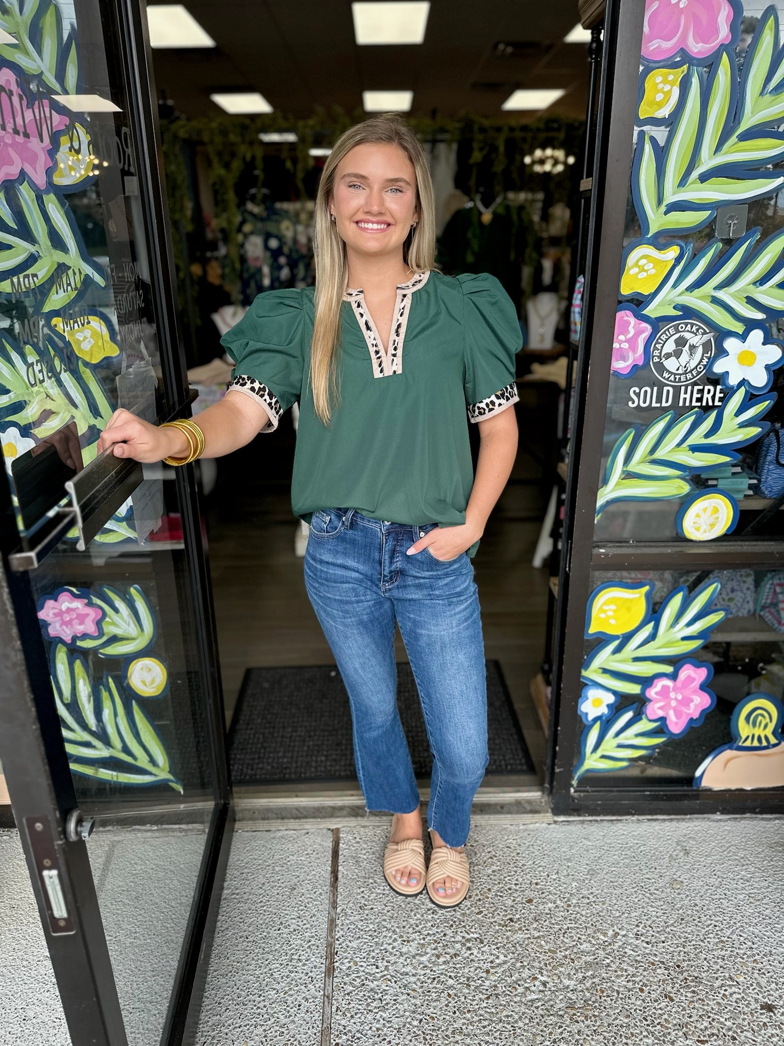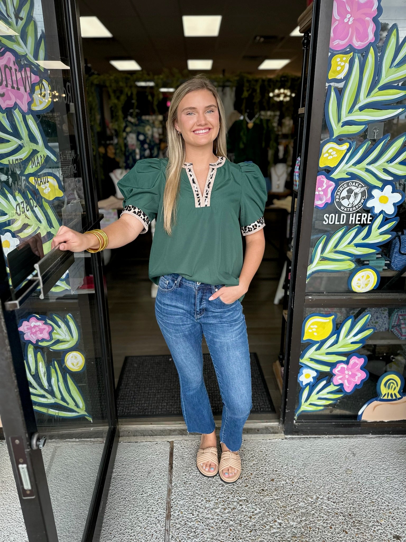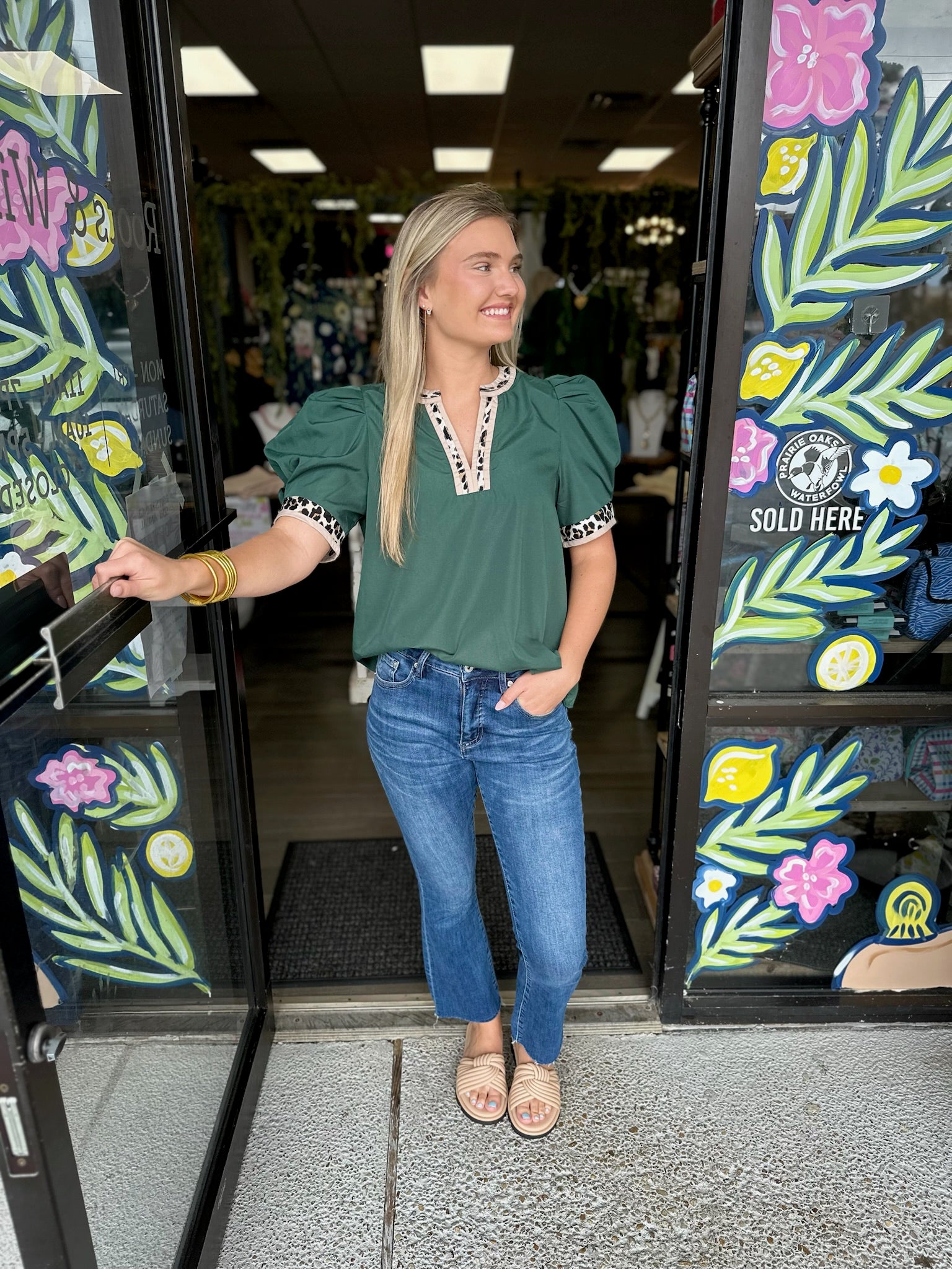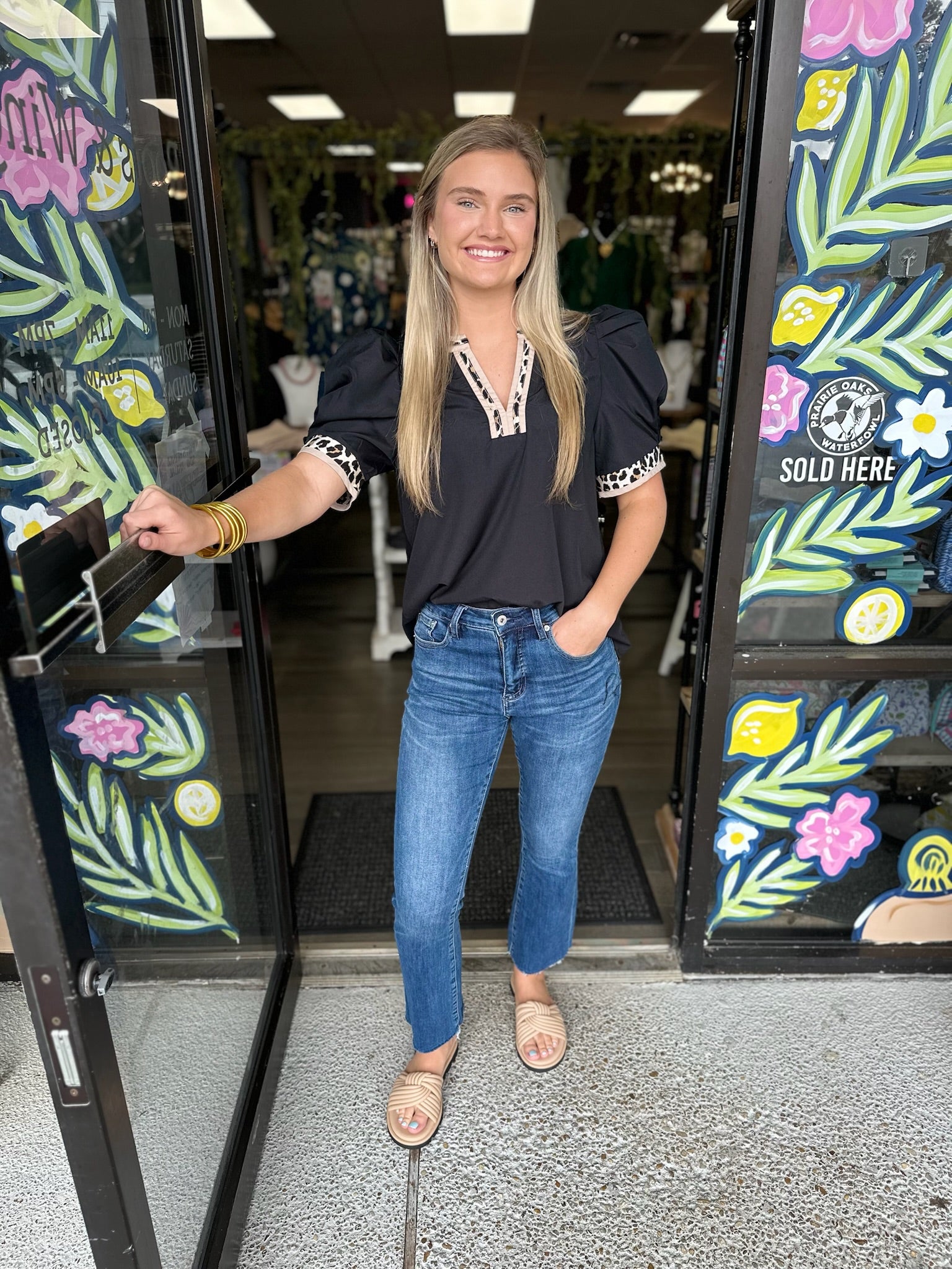 Solid band cuff short puff sleeve pullover top featuring scallop edge 3D floral applique chelsea collar. Lined. Woven. Non-sheer. Lightweight.