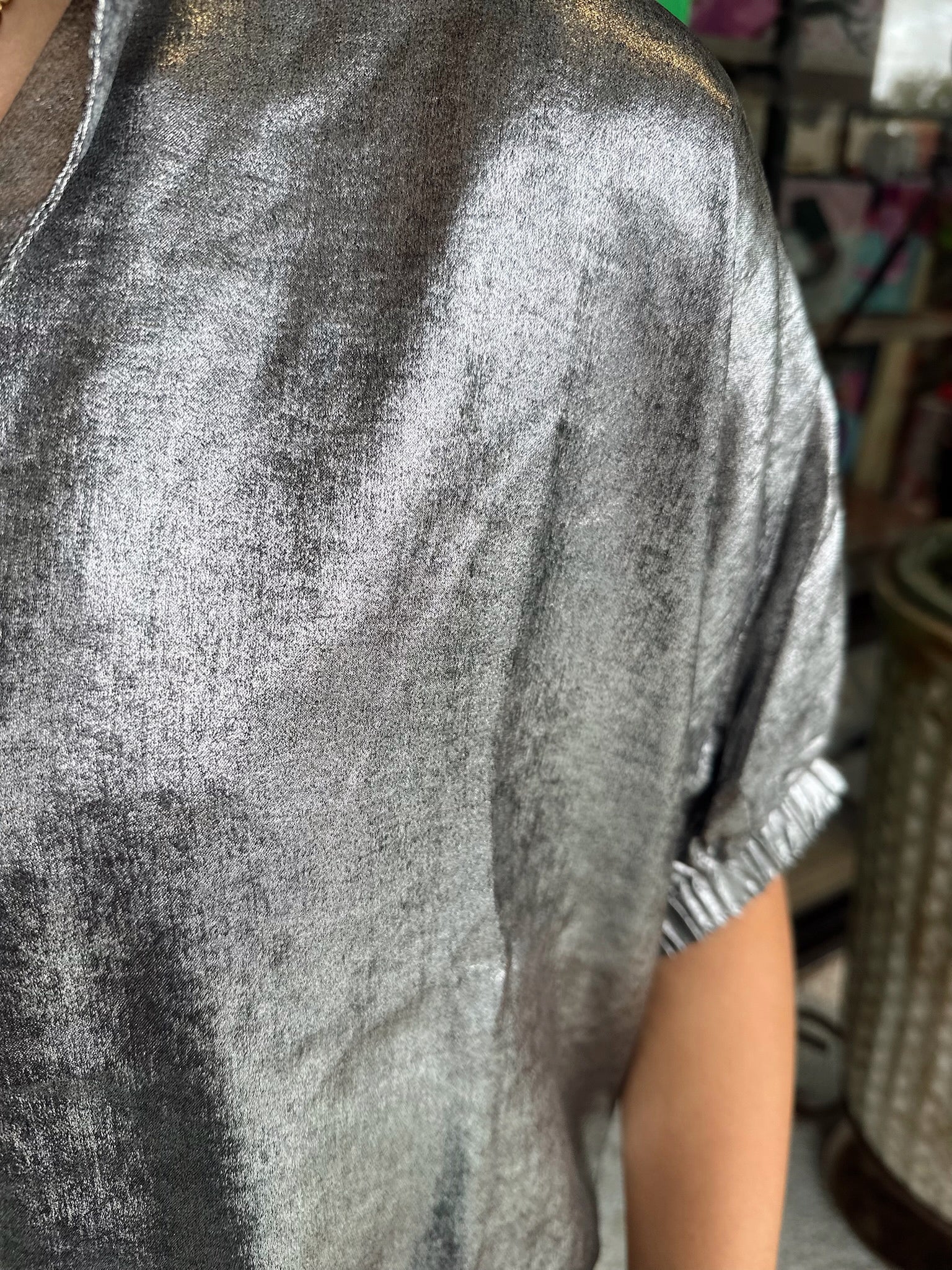Details: Metallic V-neck band collar short dolman sleeve top. Unlined. Woven. Non-sheer. Lightweight.