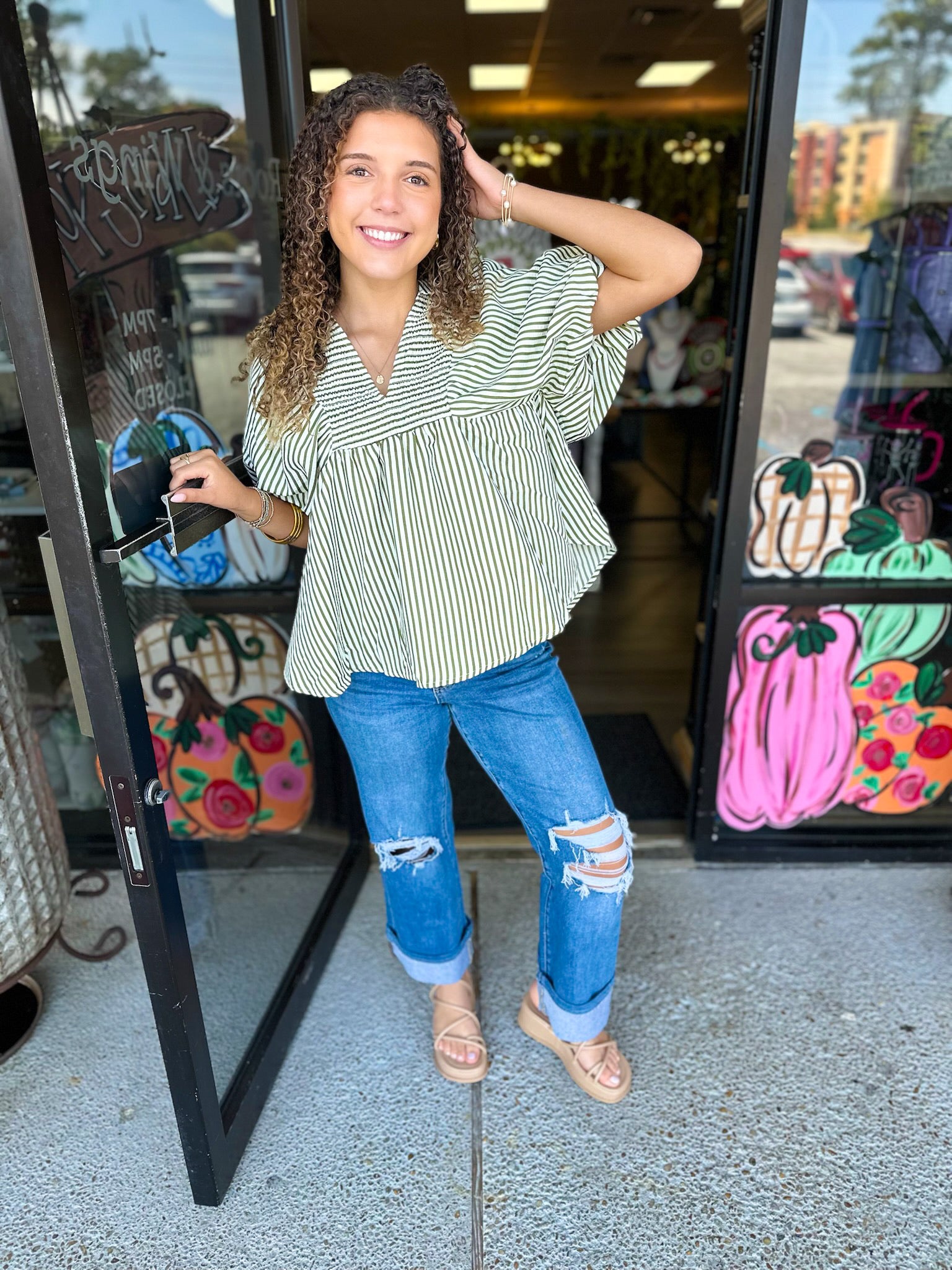 Striped short dolman sleeve top featuring smocked bodice and V-neck. Unlined. Woven. Non-sheer. Lightweight.