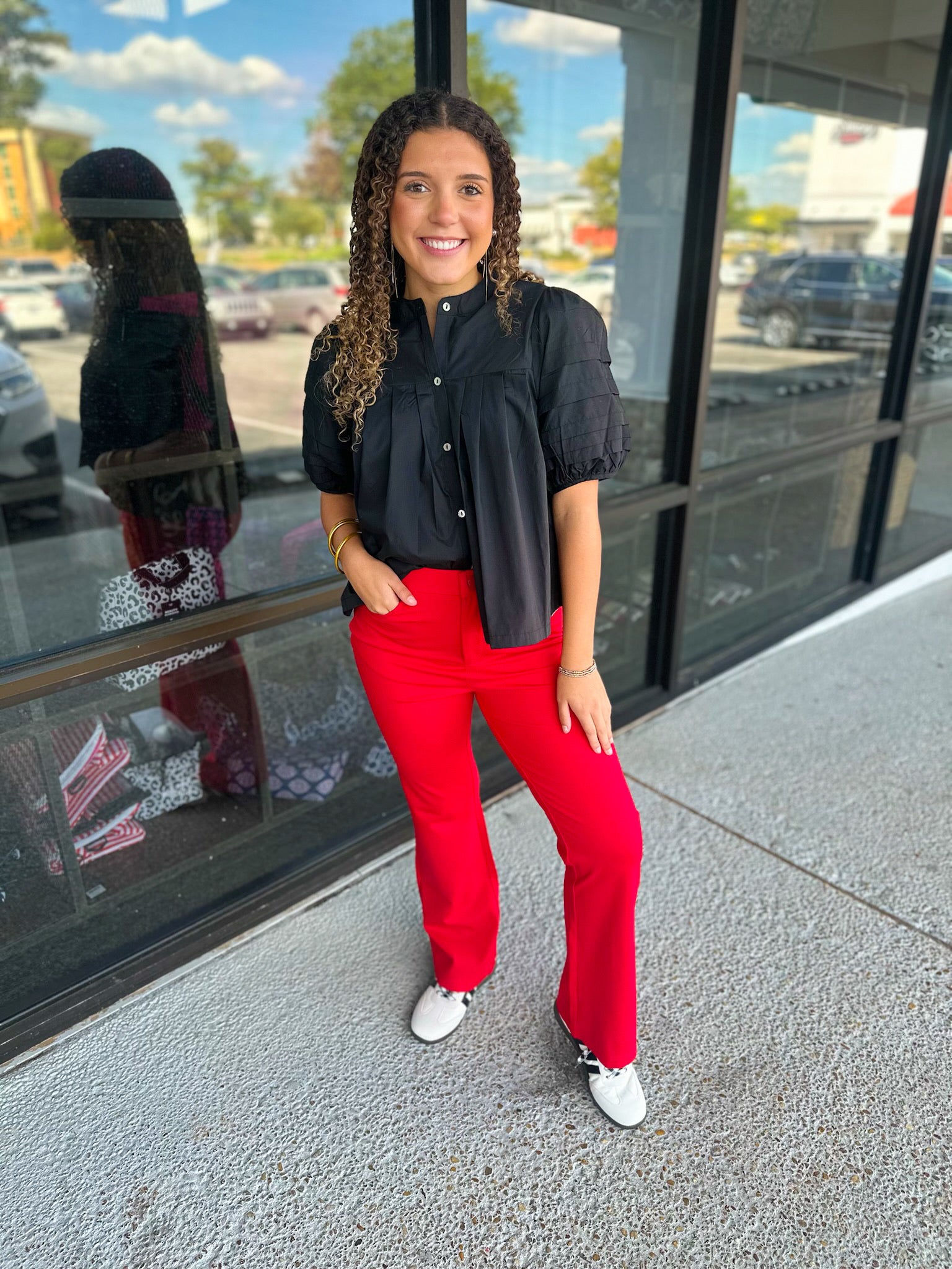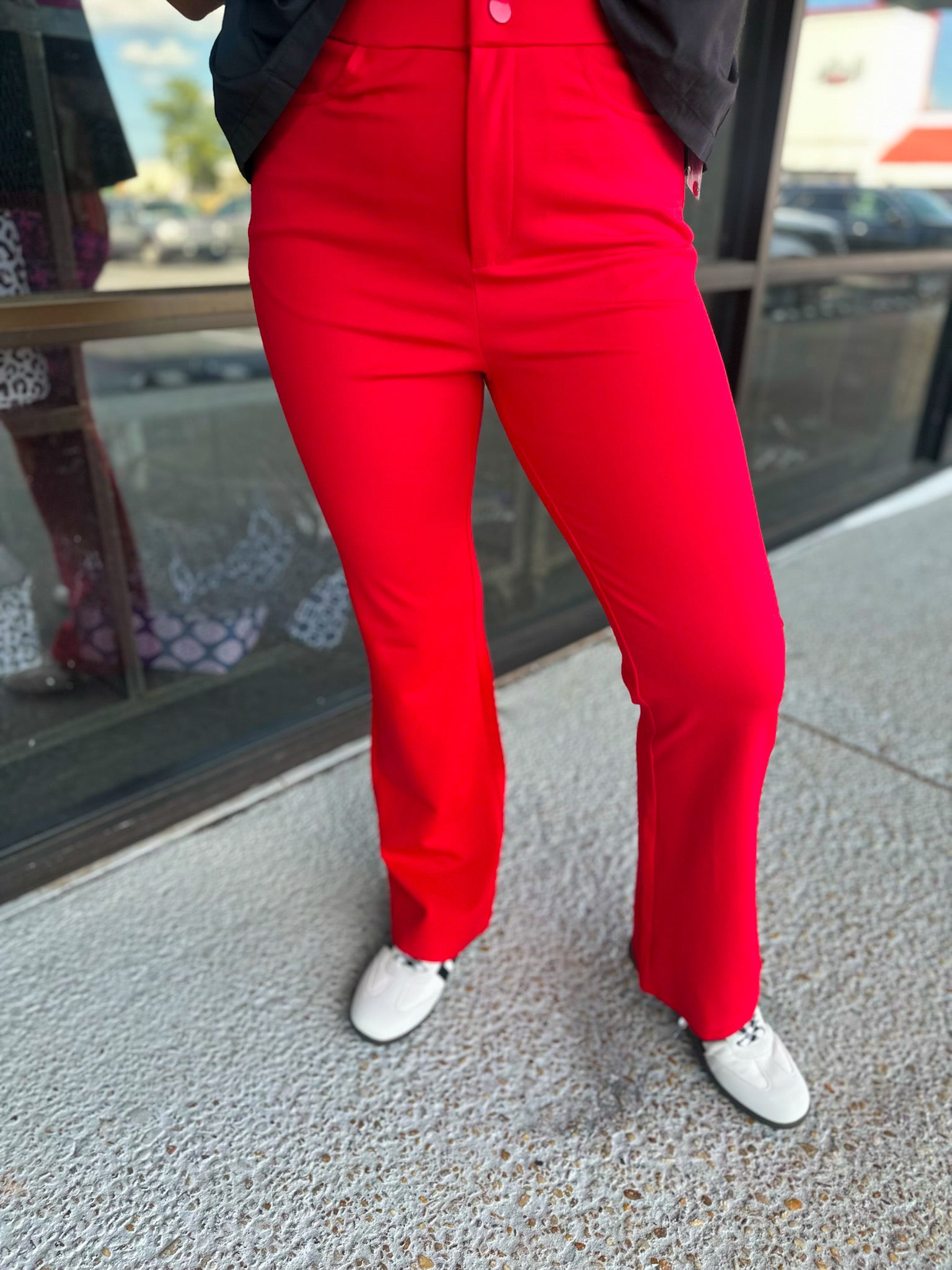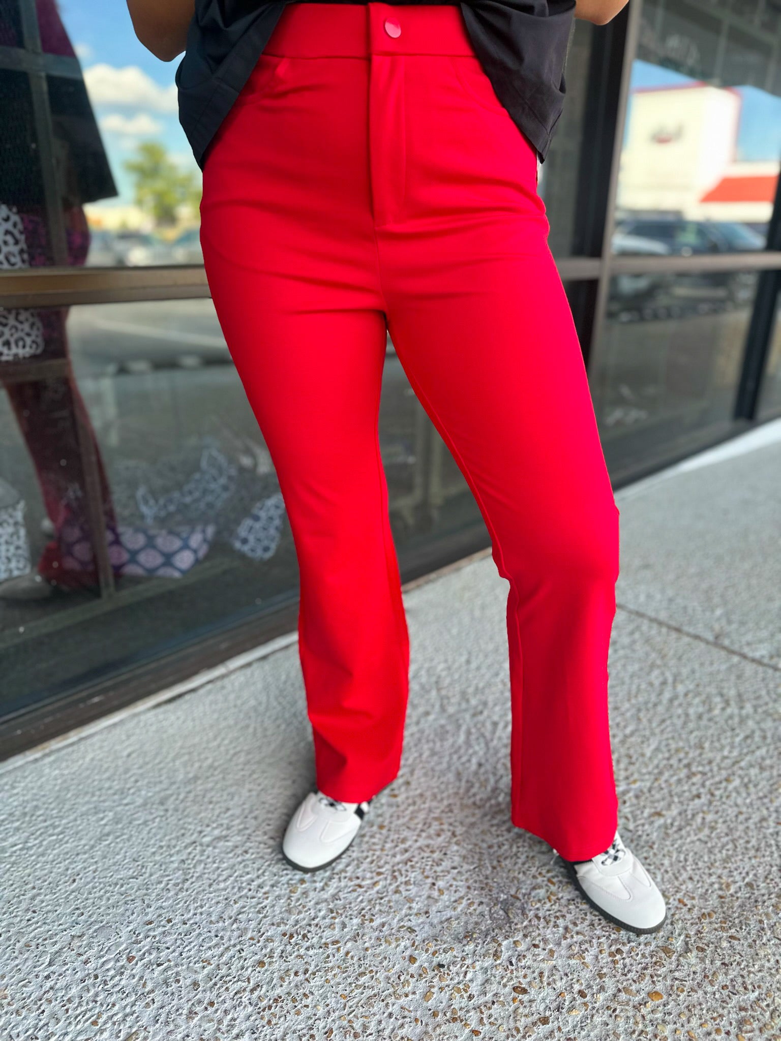 Solid bootcut slacks, one button closure, elastic waistband, slightly stretchable, side pockets.