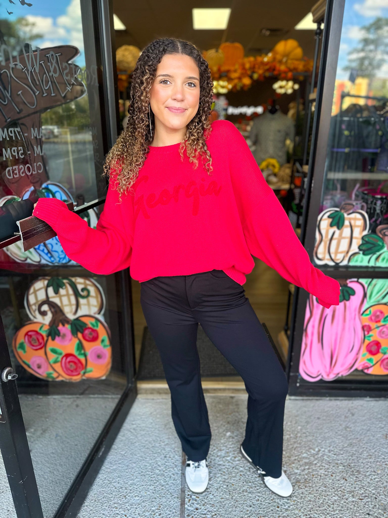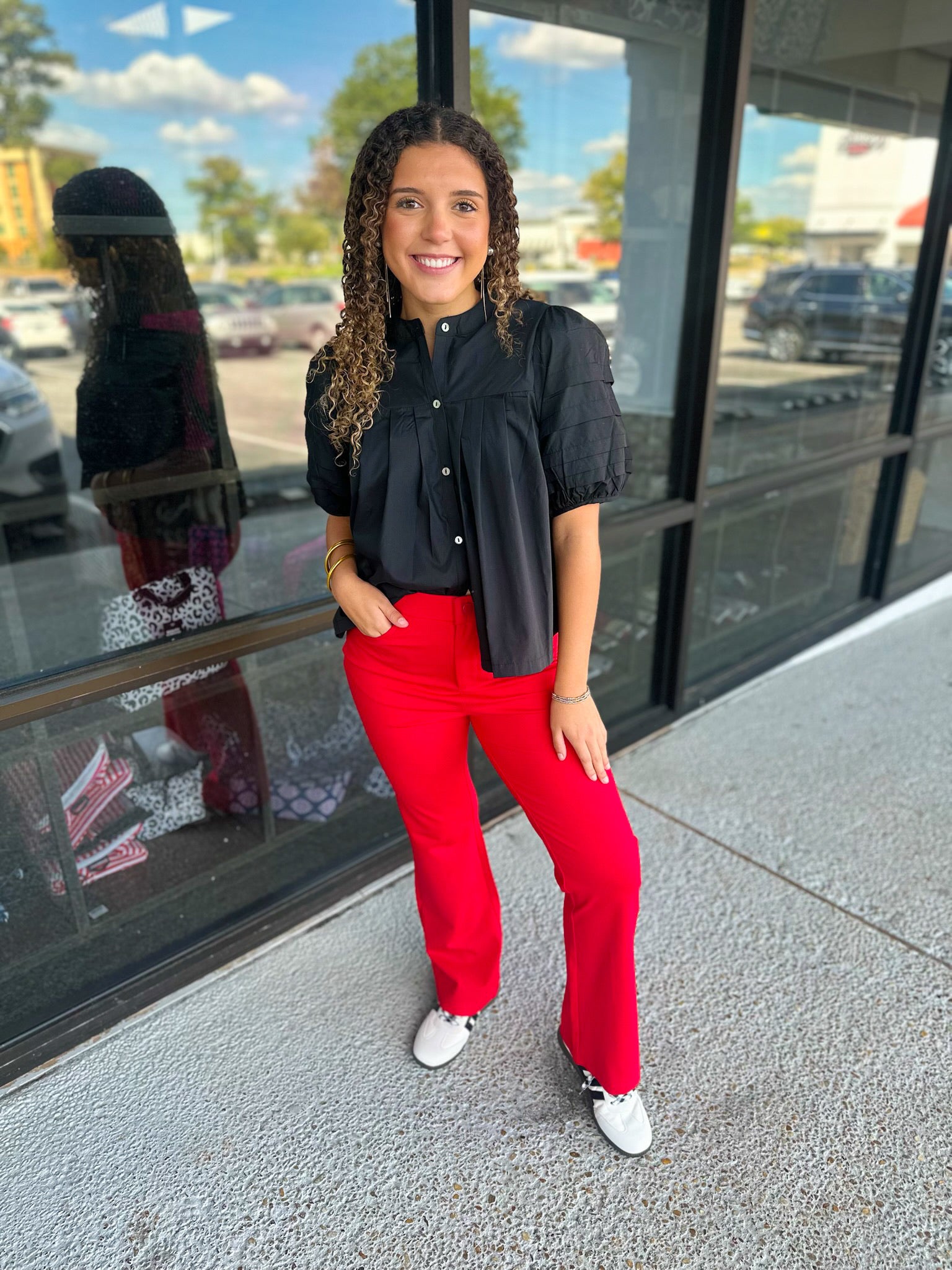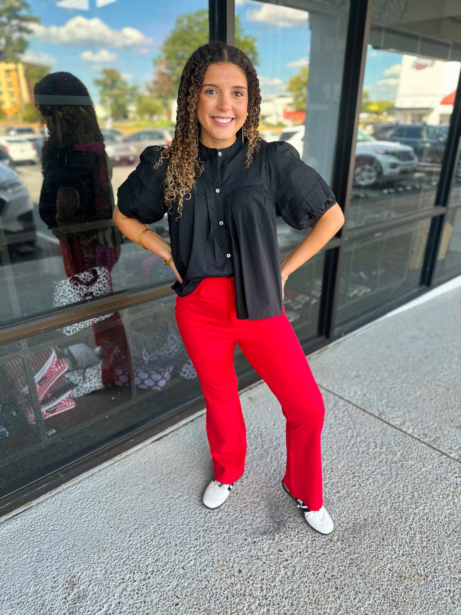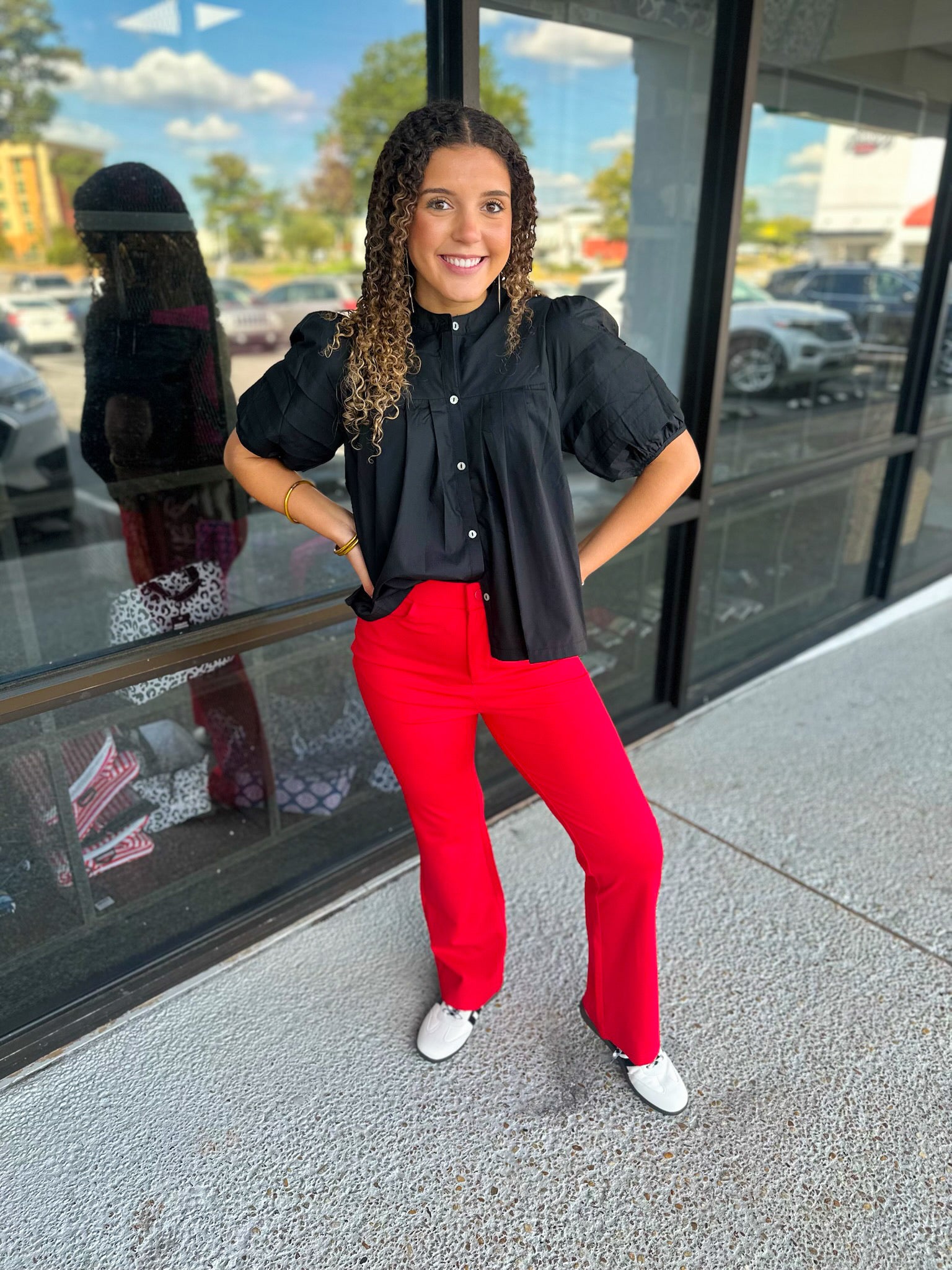 Solid bootcut slacks, one button closure, elastic waistband, slightly stretchable, side pockets.