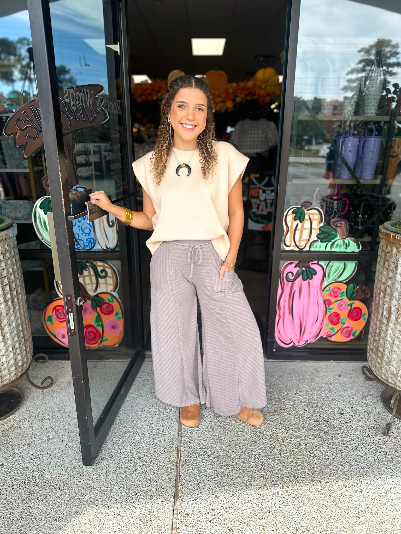 Spaghetti Tie Waist Stripe Patterned Wide Pants - High waist with elastic band - Side patched pockets - Irregular hemline - Wide legs