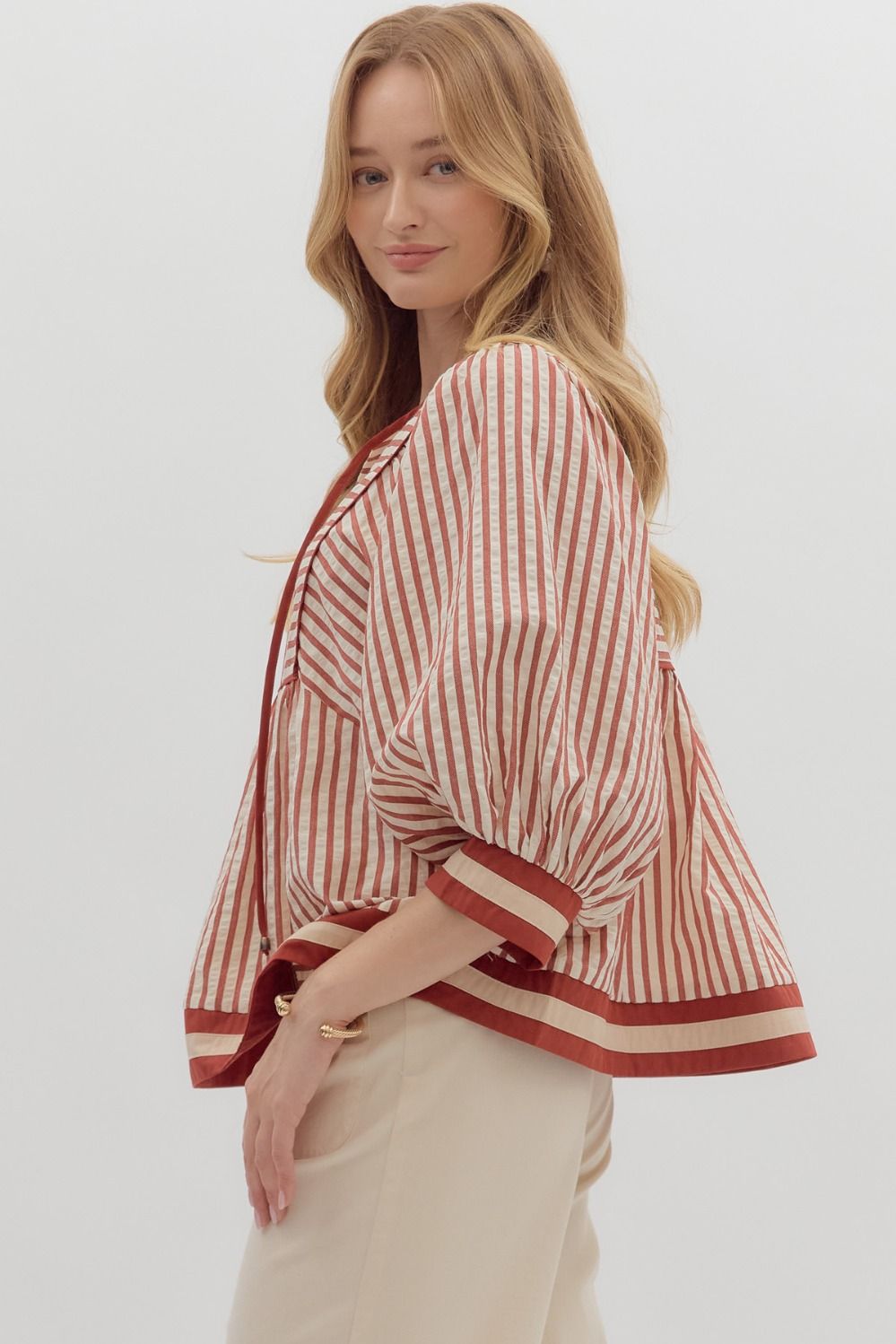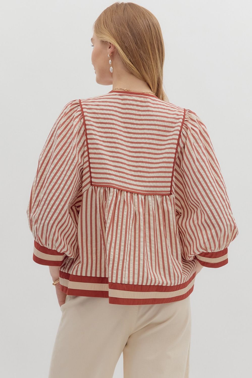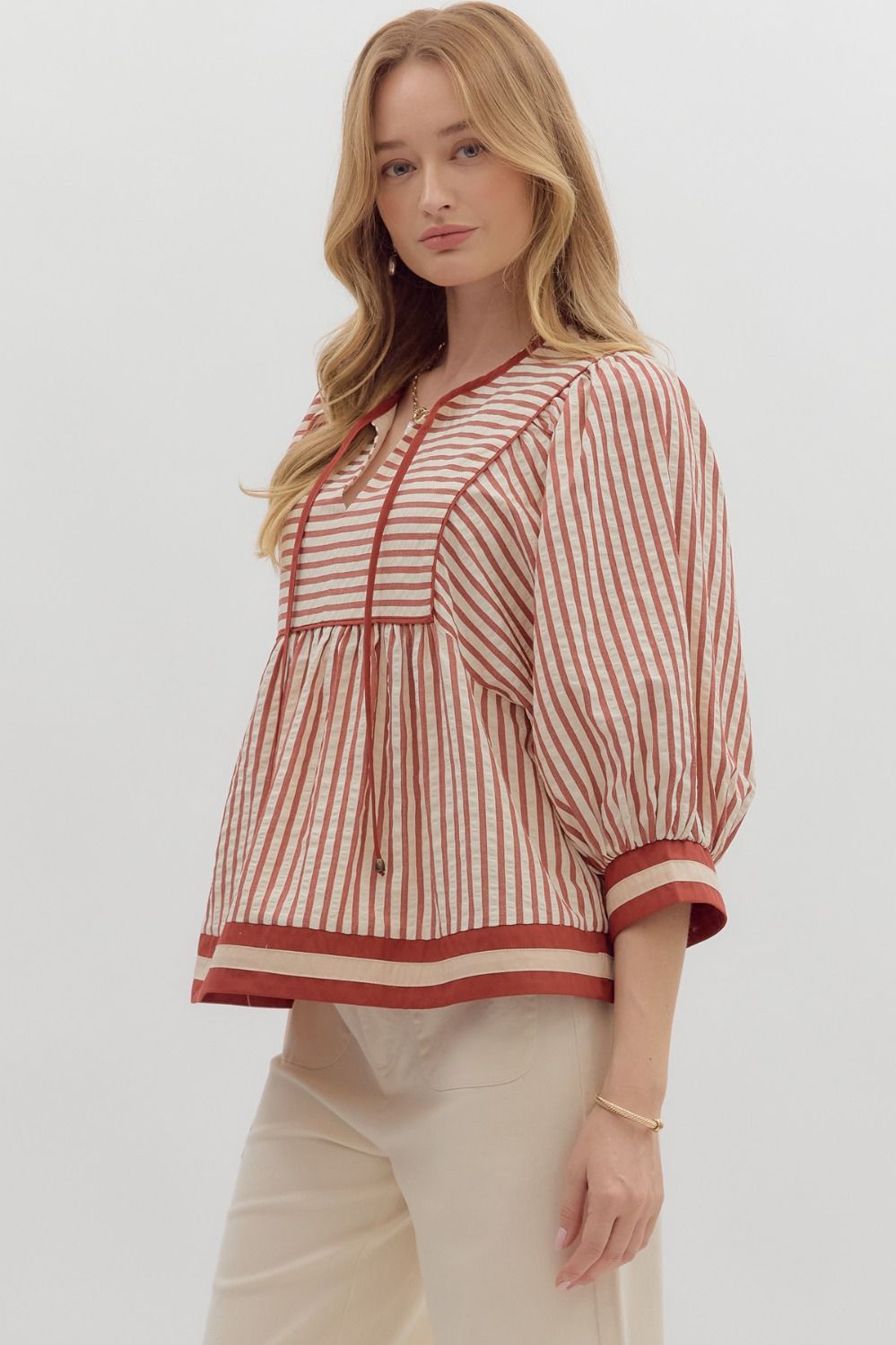 Stripe pattern ¾ sleeve top featuring multicolor band and hem detail. Unlined. Woven. Non-sheer. Lightweight.