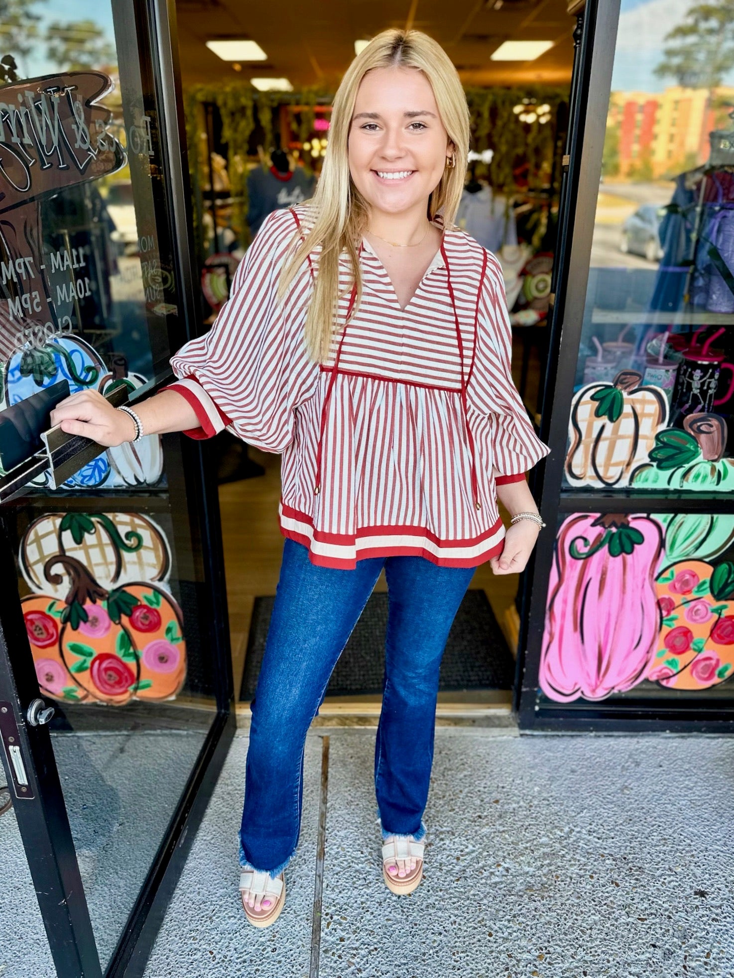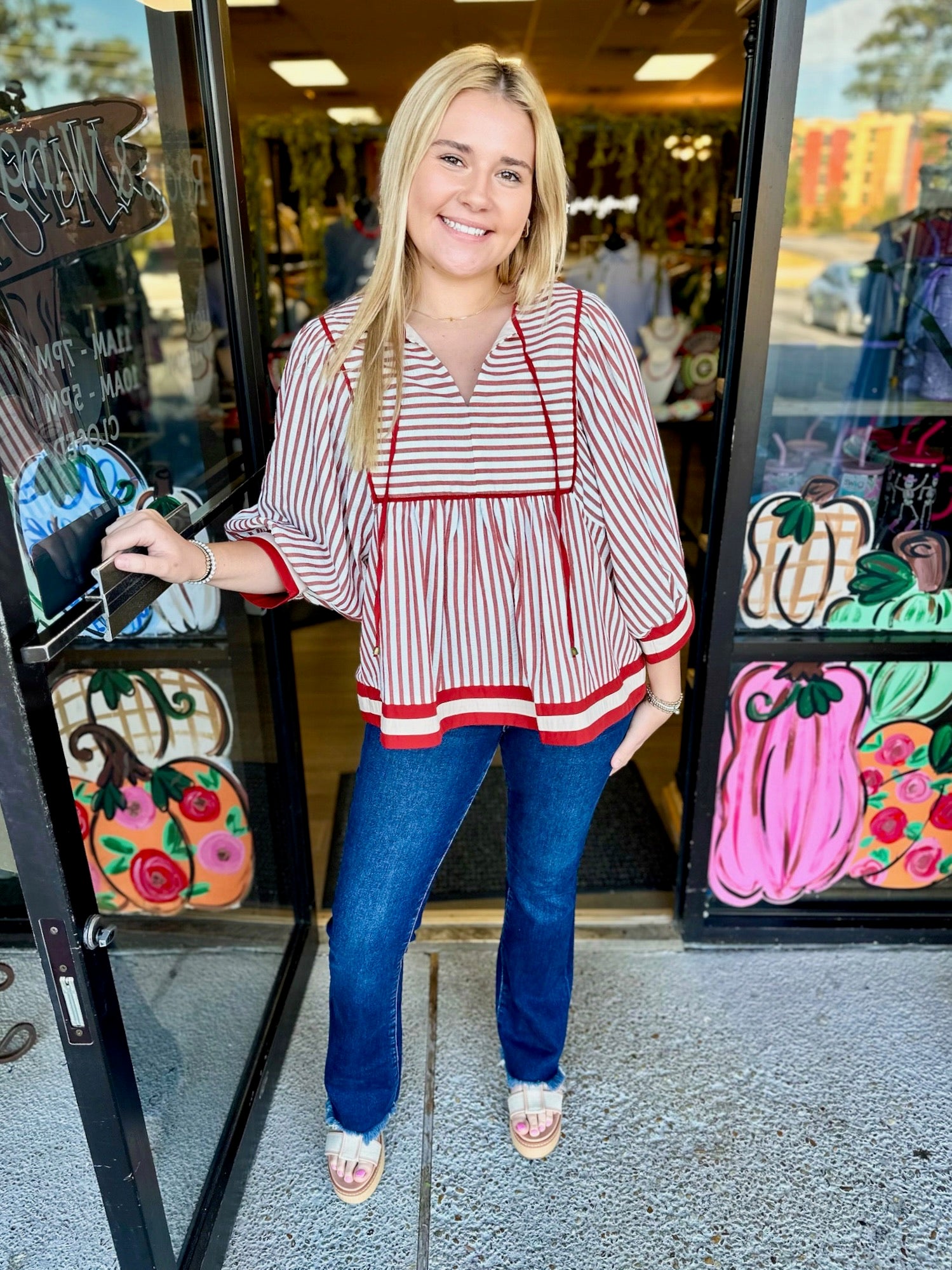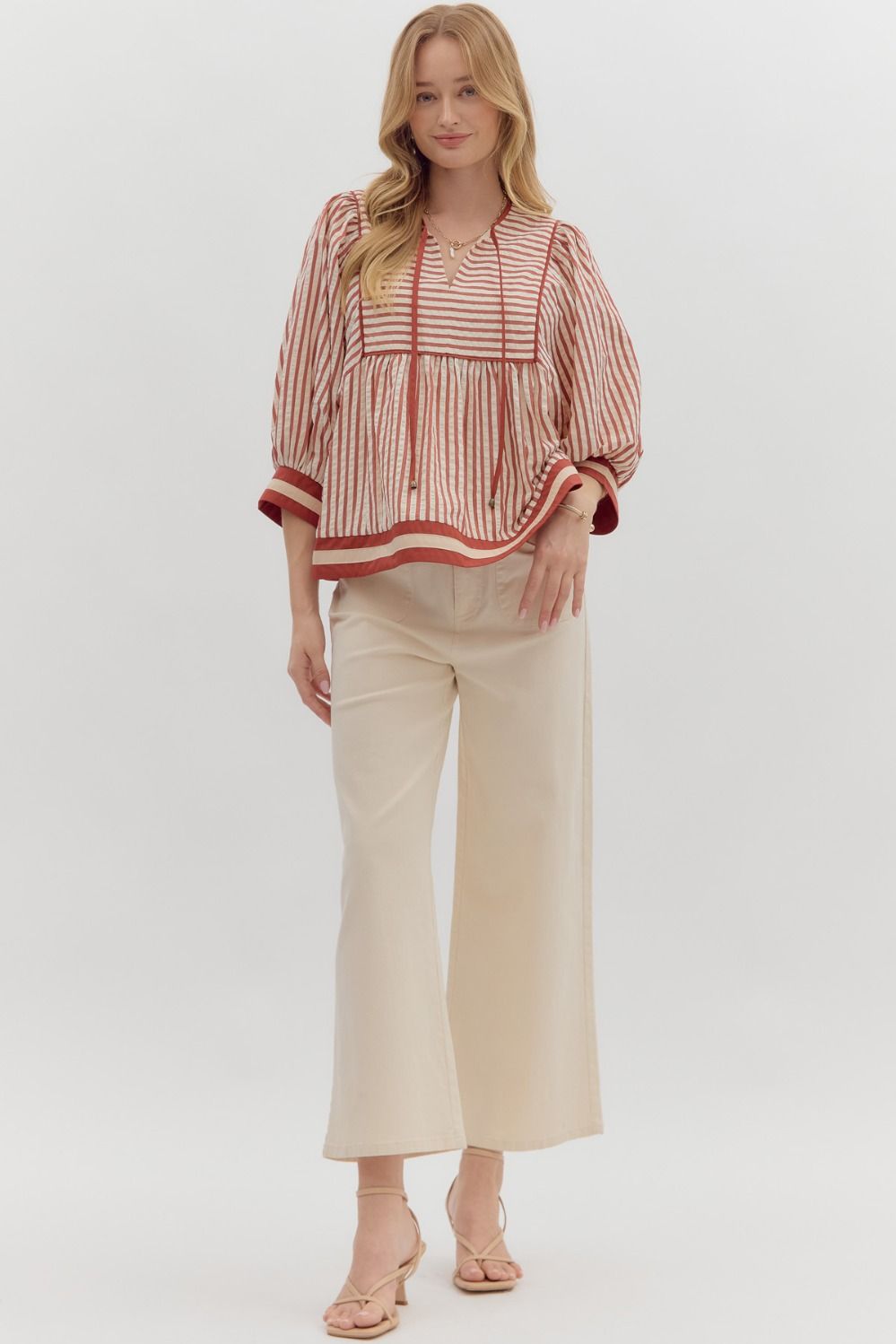 Stripe pattern ¾ sleeve top featuring multicolor band and hem detail. Unlined. Woven. Non-sheer. Lightweight.
