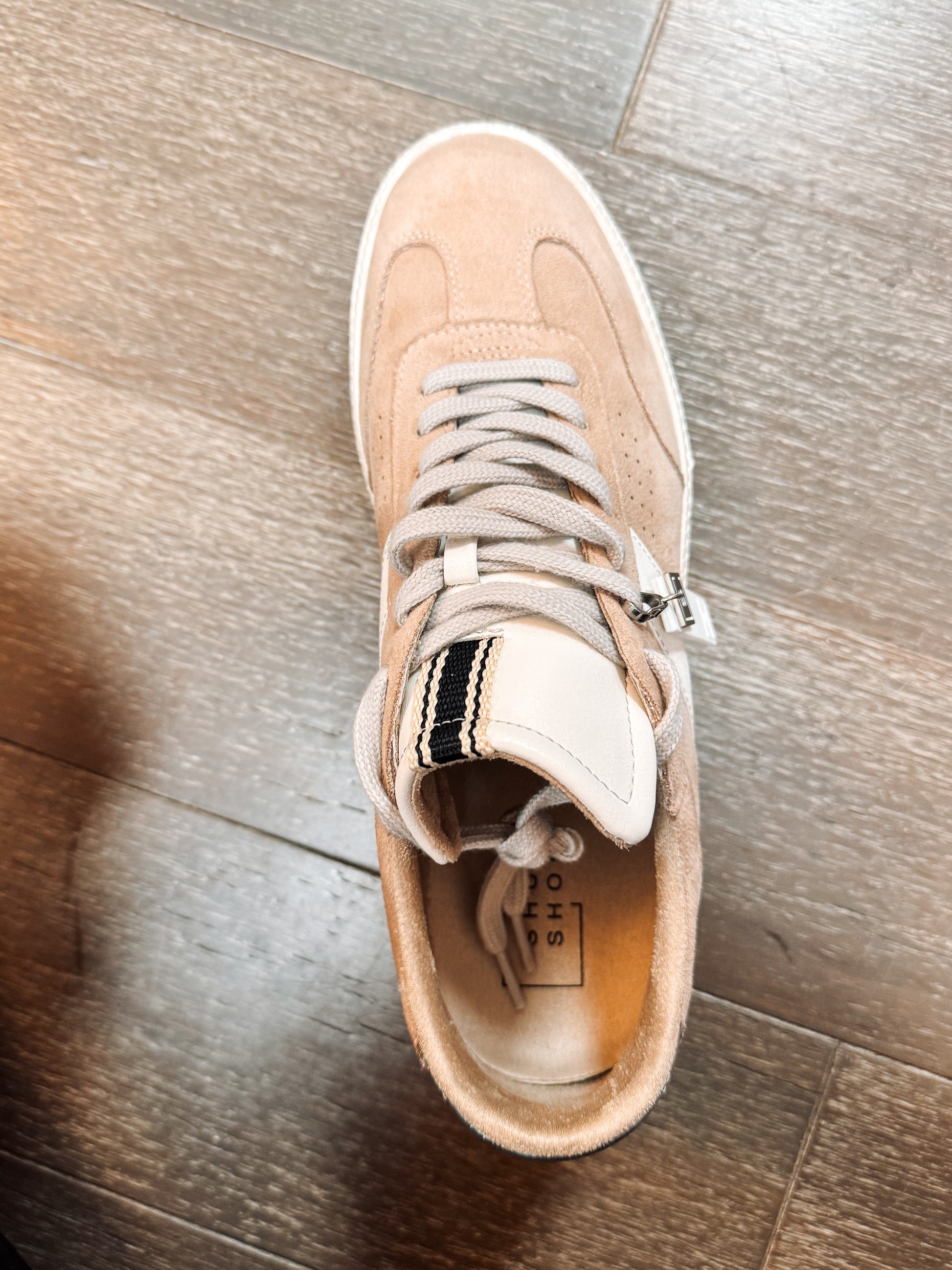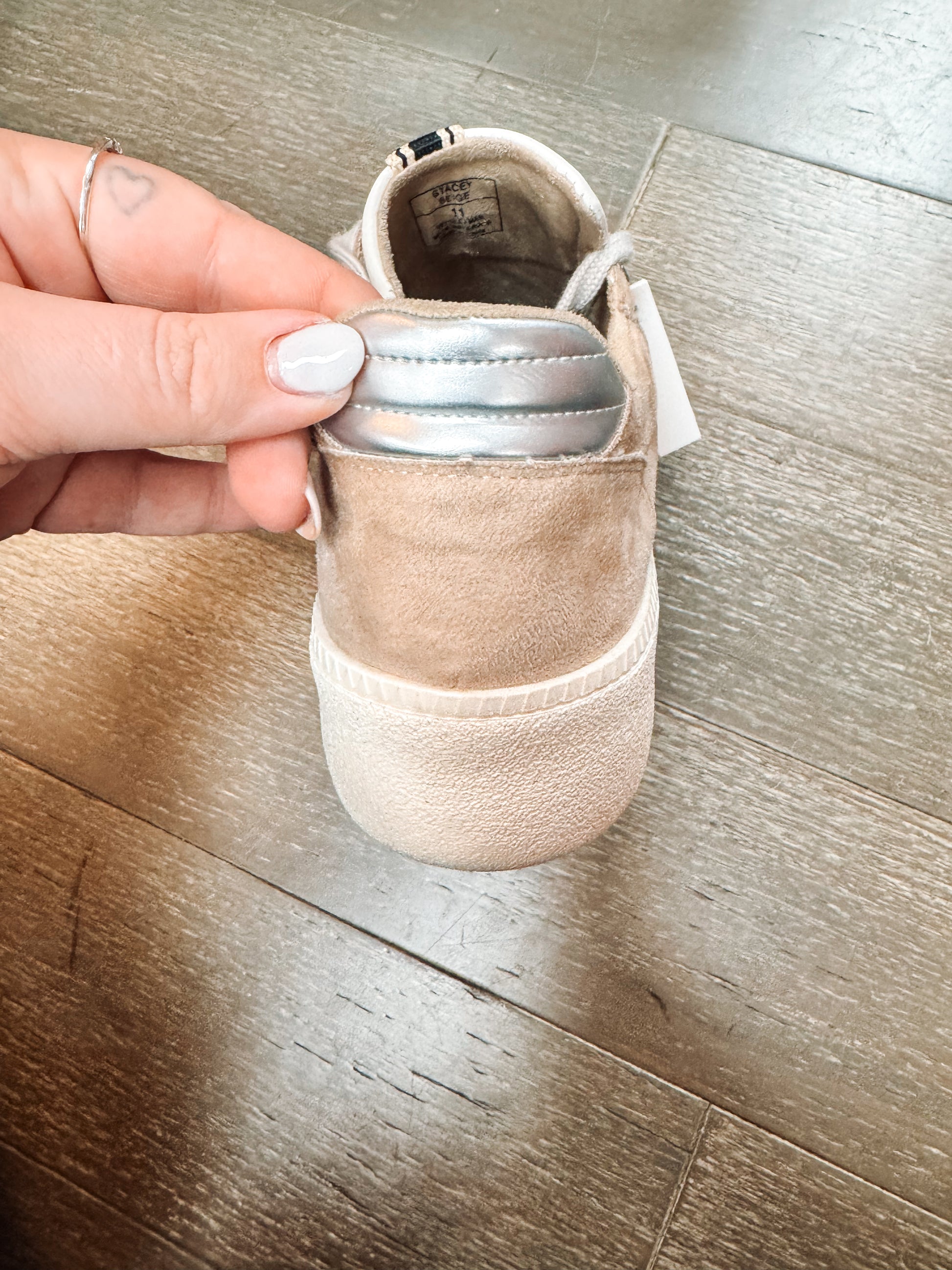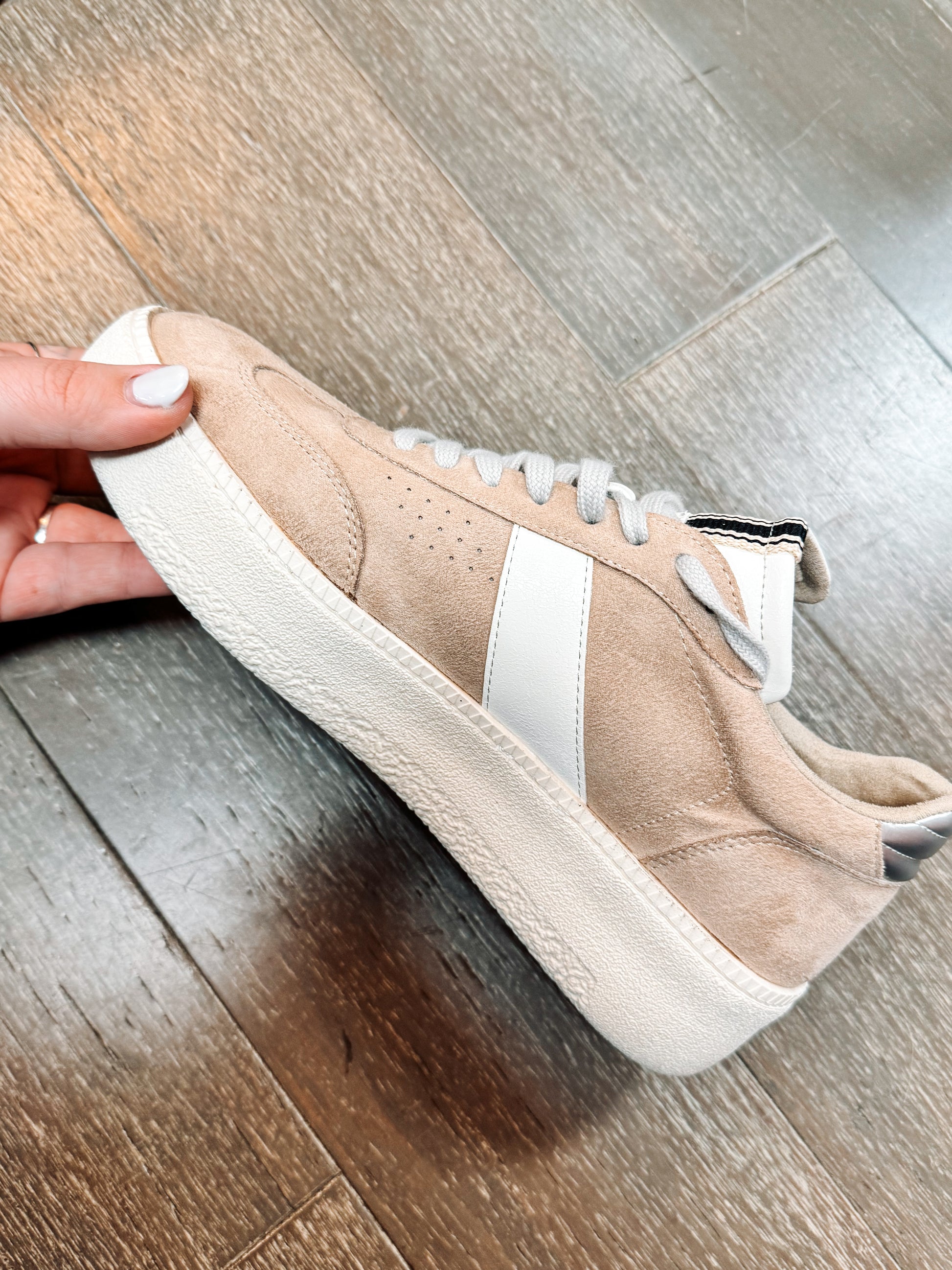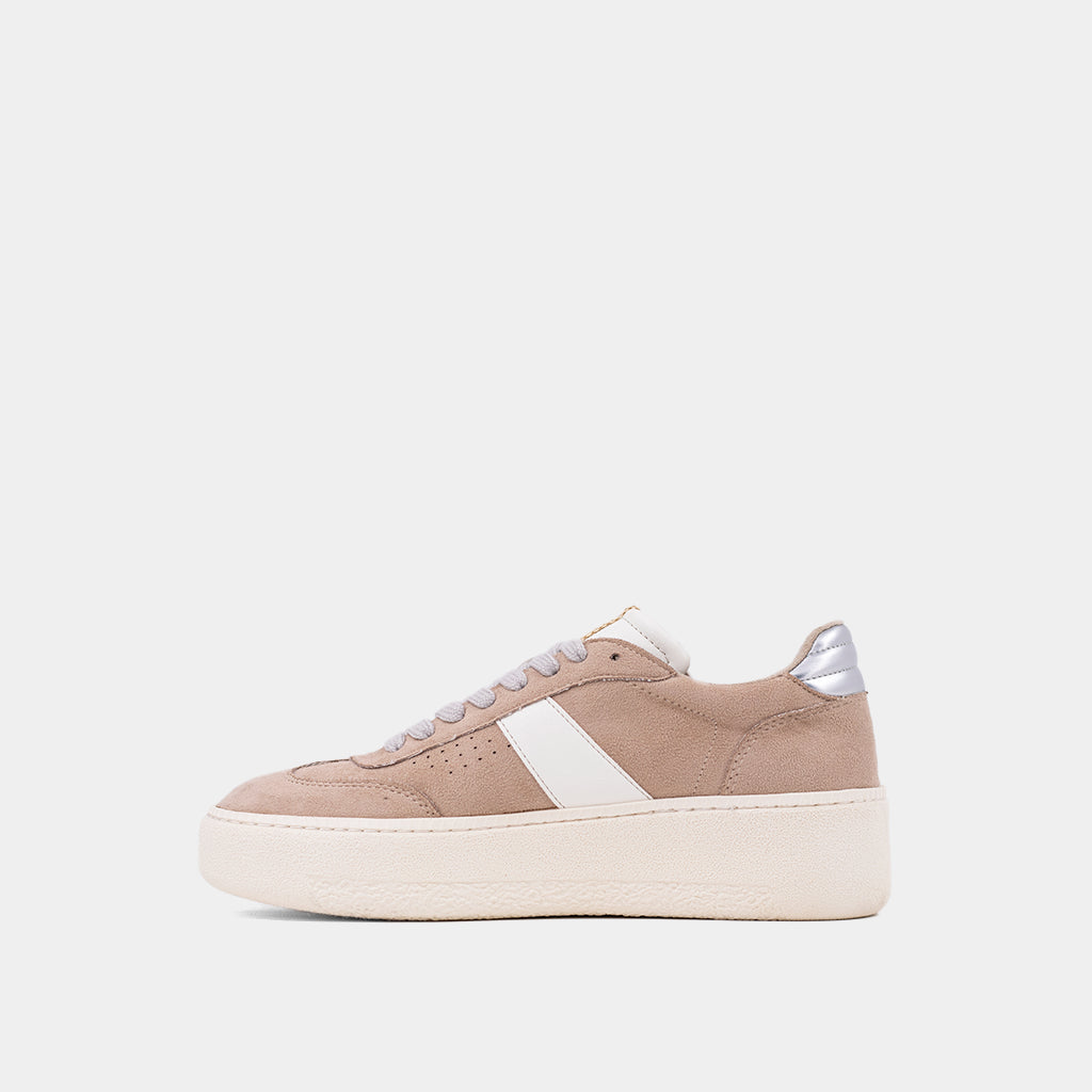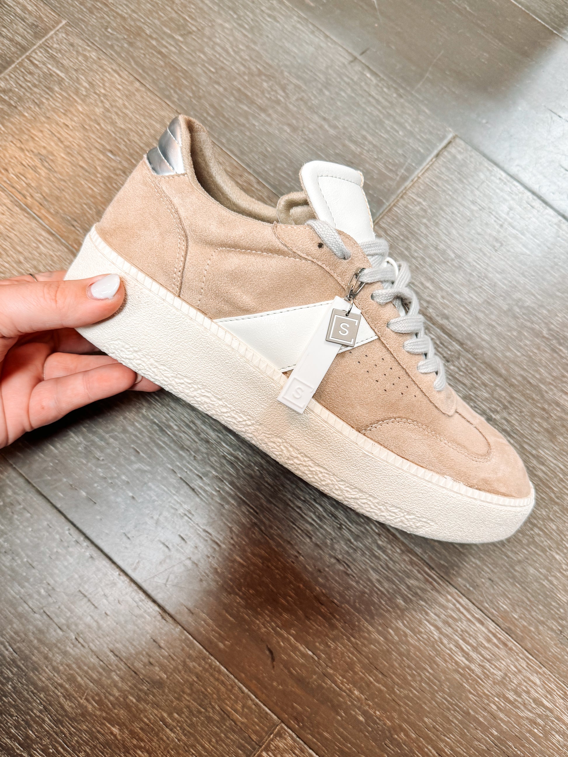 The STACEY in Beige is a perfect blend of understated elegance and modern design. Featuring soft beige suede paired with crisp white faux-leather accents, this sneaker offers a clean and versatile look. The metallic silver heel adds a touch of shine, while the chunky textured platform sole delivers height and comfort. Finished with light gray laces and the signature "S" metallic tag, STACEY is your go-to sneaker for effortless everyday chic with a neutral twist