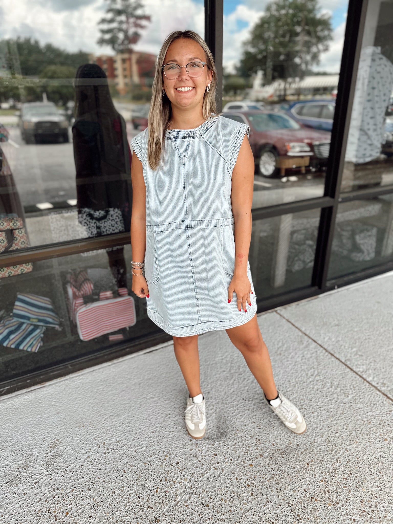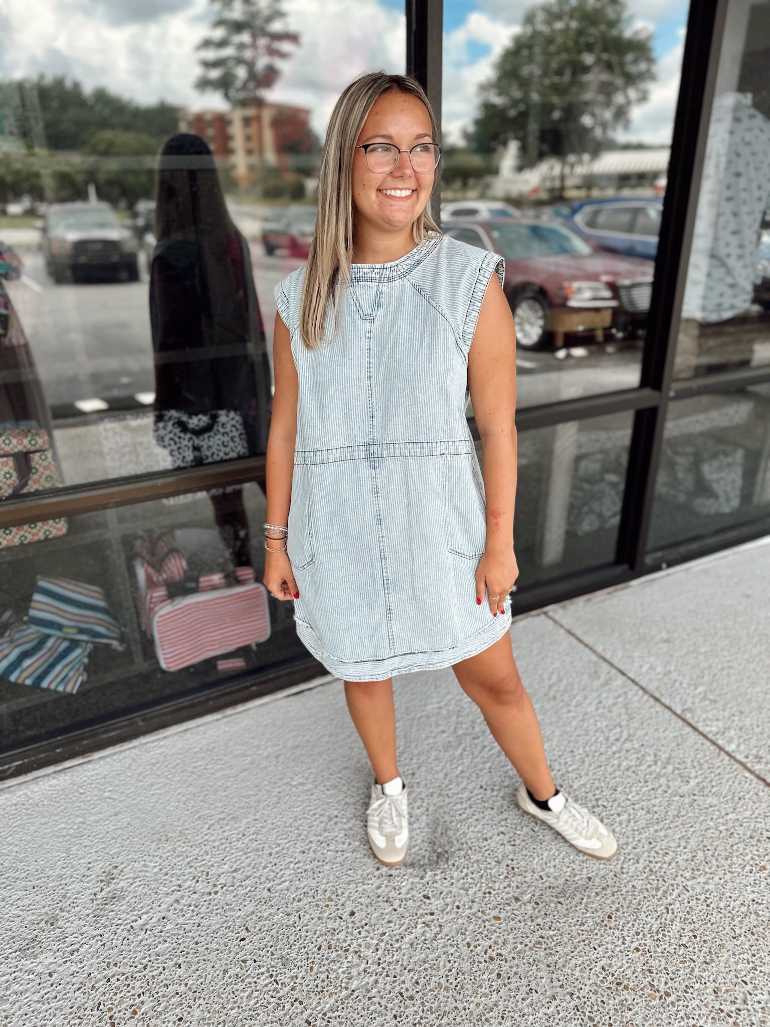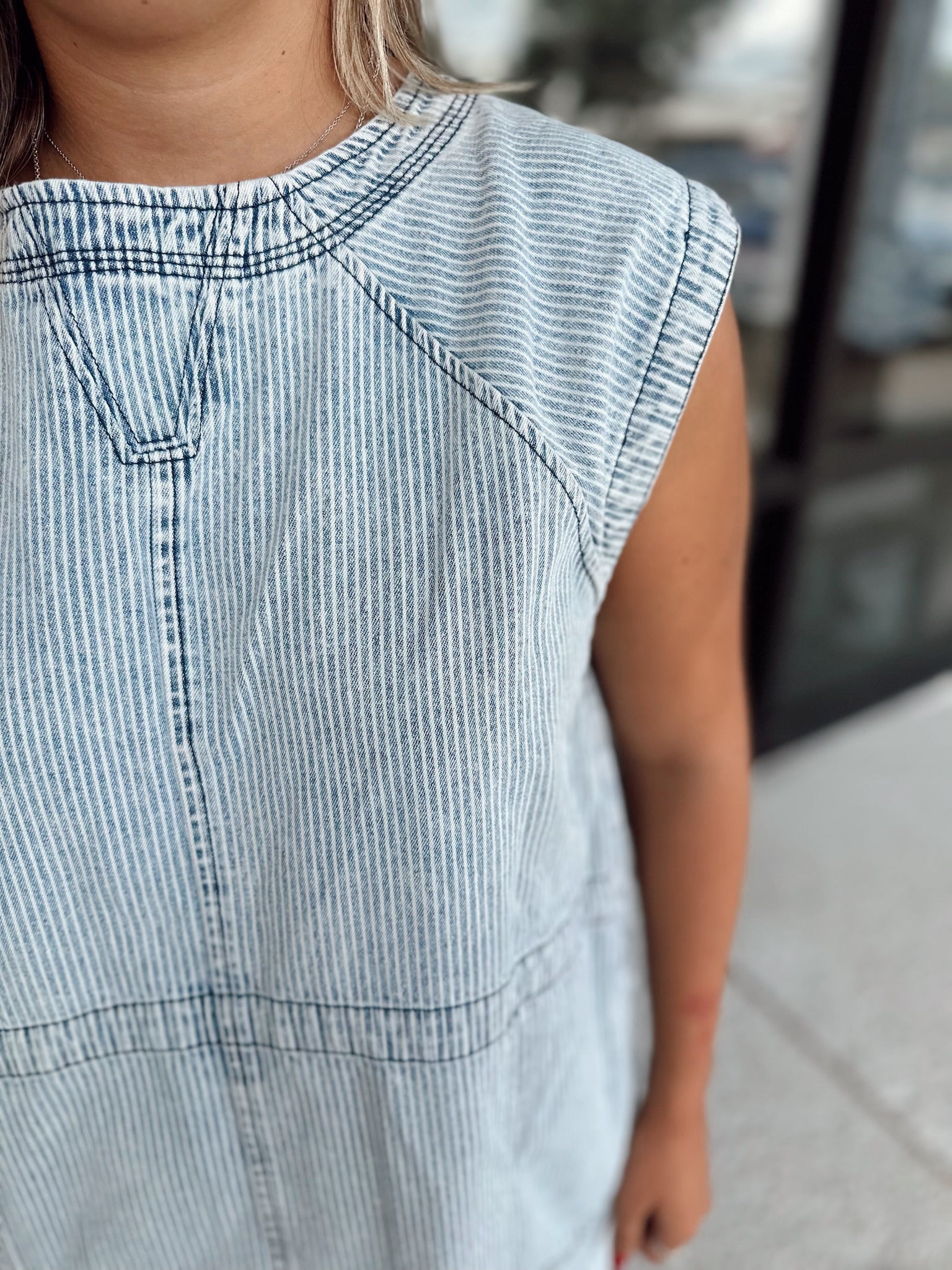 This stone, enzyme and snow washed striped denim dress showcases a sleeveless silhouette with a rounded neckline, visible seaming, dual front pockets, and a raw edge hem with a back cut-out and buckle strap detail for a structured yet laid back look.