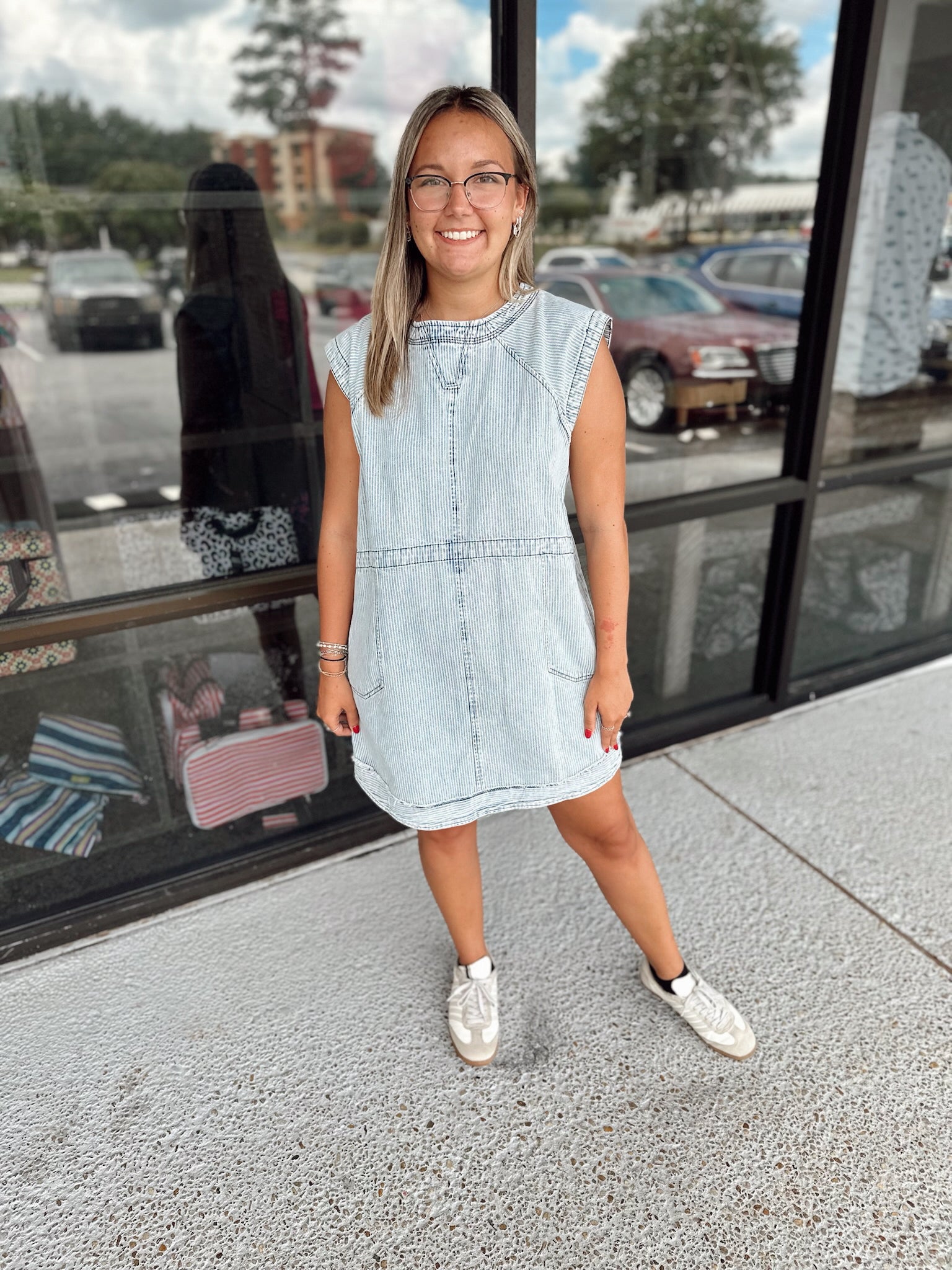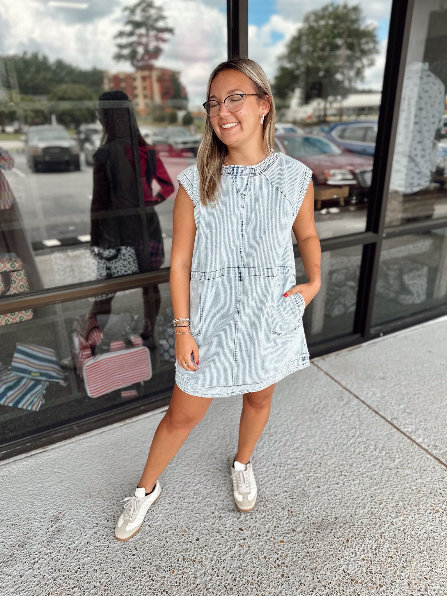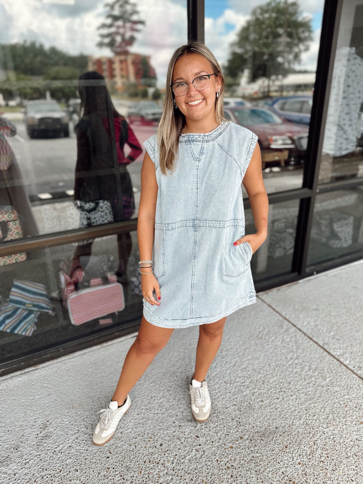 This stone, enzyme and snow washed striped denim dress showcases a sleeveless silhouette with a rounded neckline, visible seaming, dual front pockets, and a raw edge hem with a back cut-out and buckle strap detail for a structured yet laid back look.