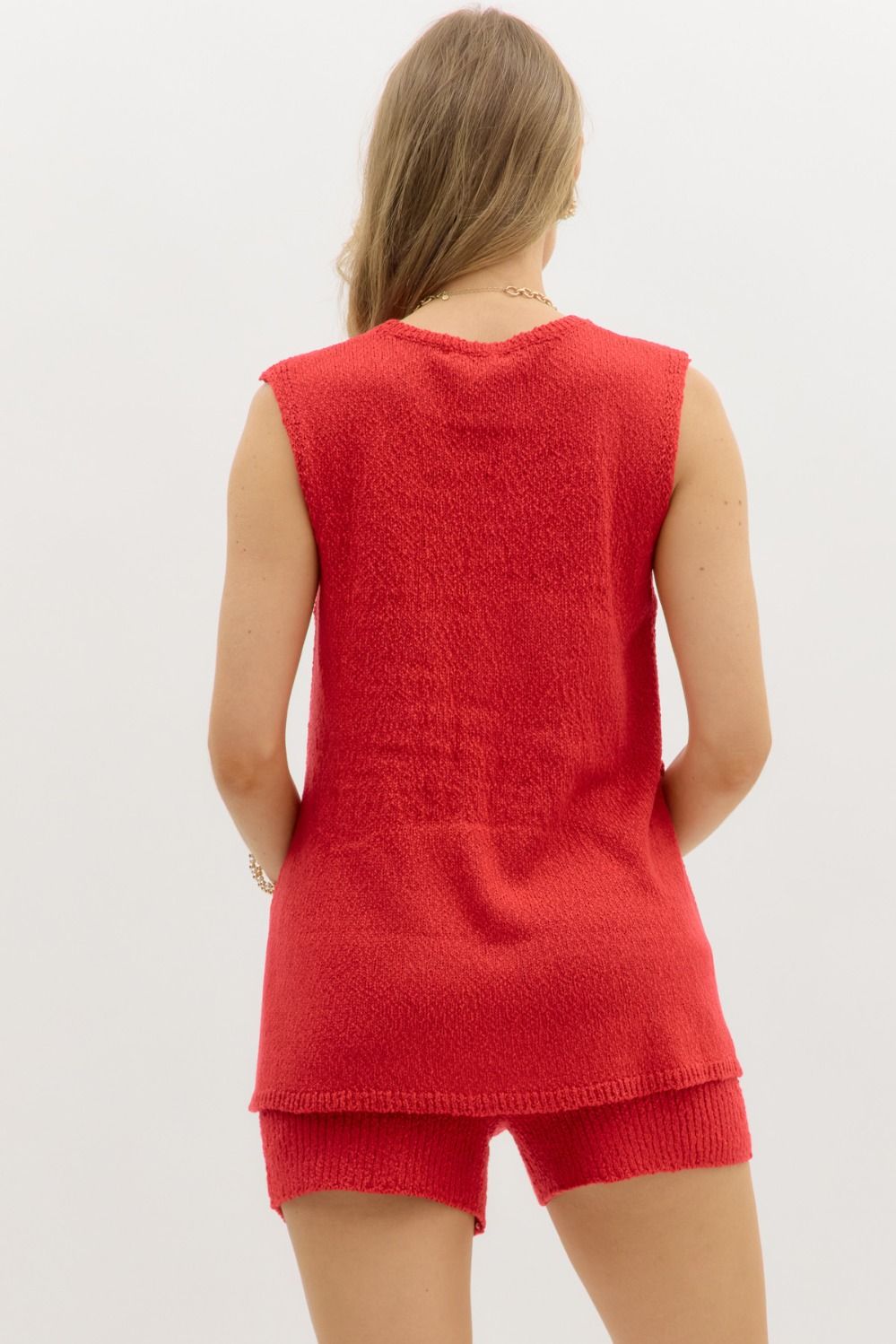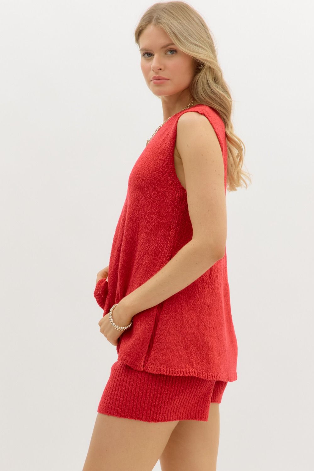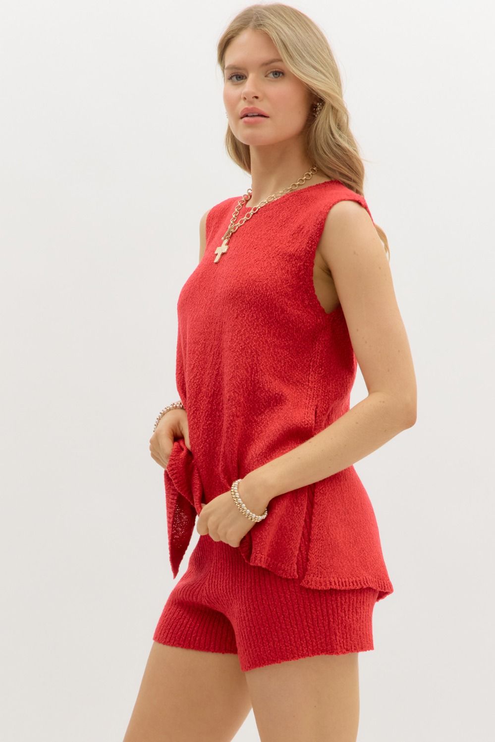 Top: Solid sweater knit sleeveless pullover top featuring high side slit. Unlined. Knit. Non-sheer. Lightweight