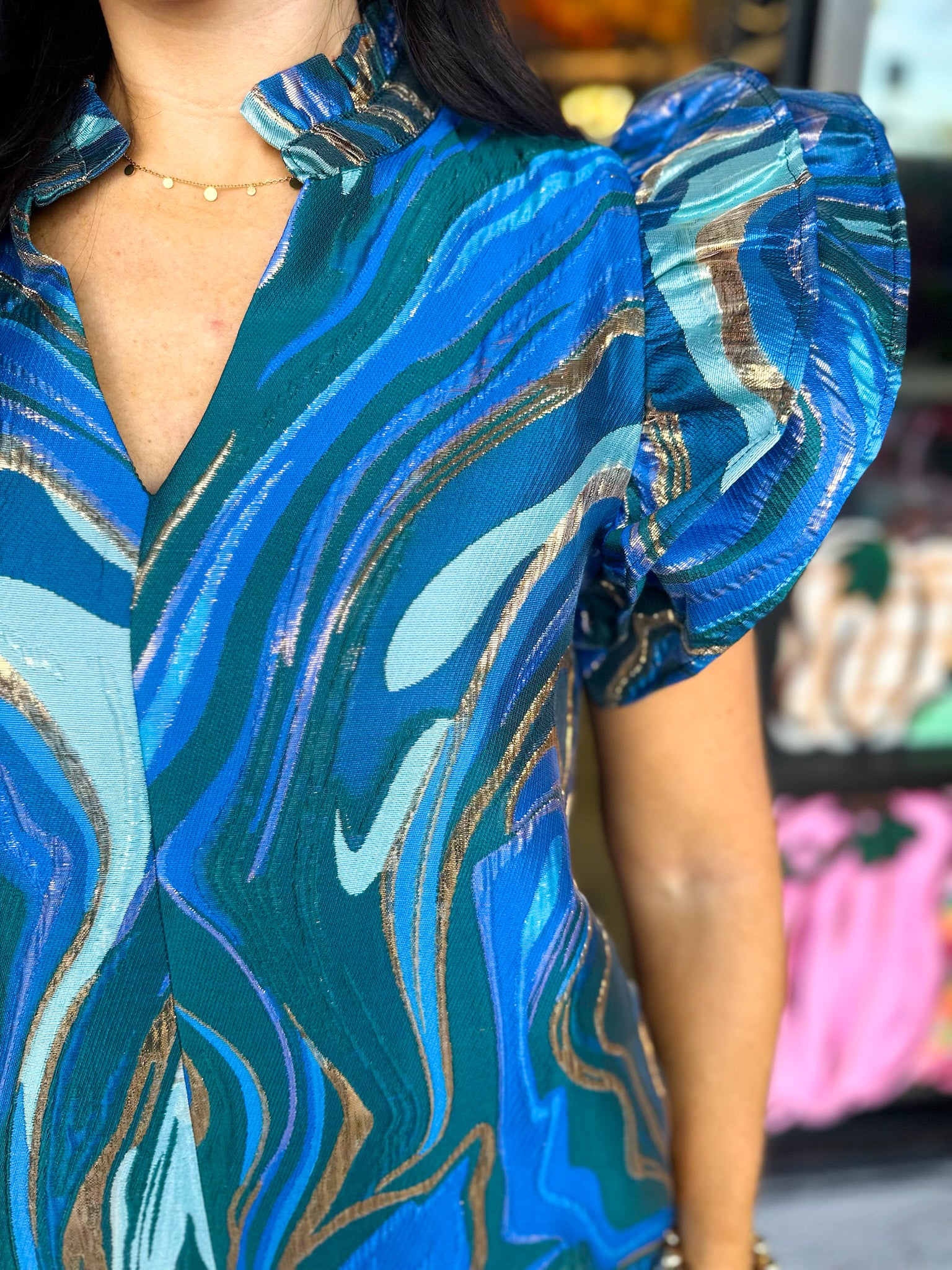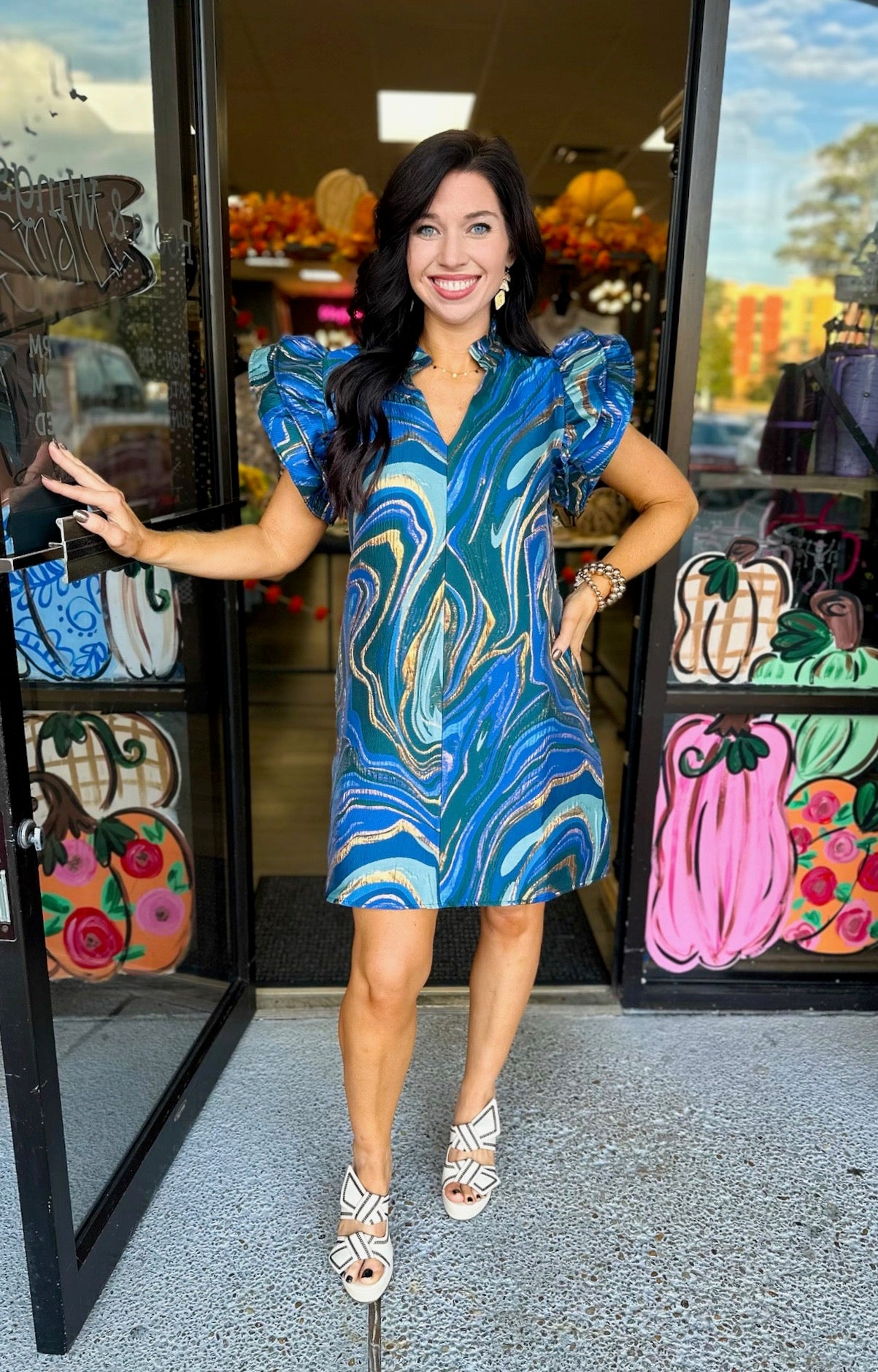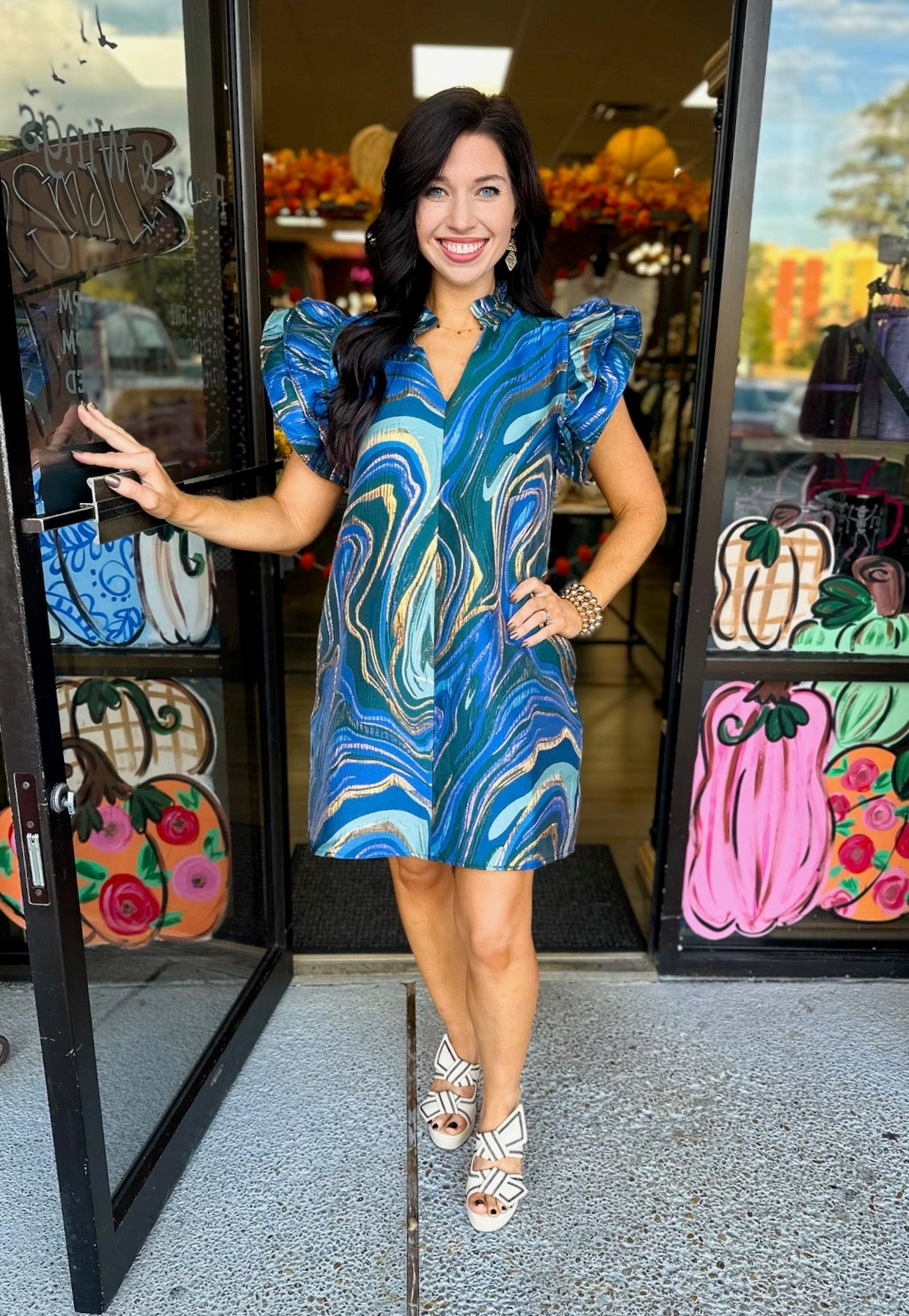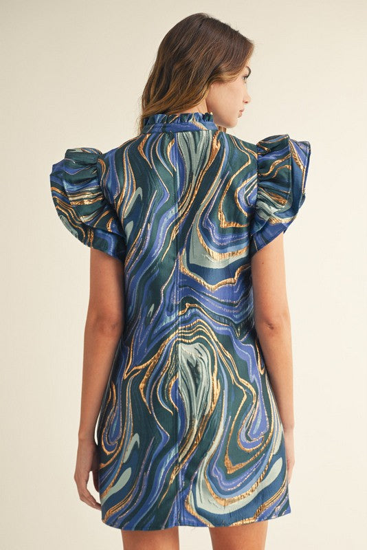 Short layered ruffled sleeves abstract jacquard dress with lurex, side pockets, ruffled neckline.