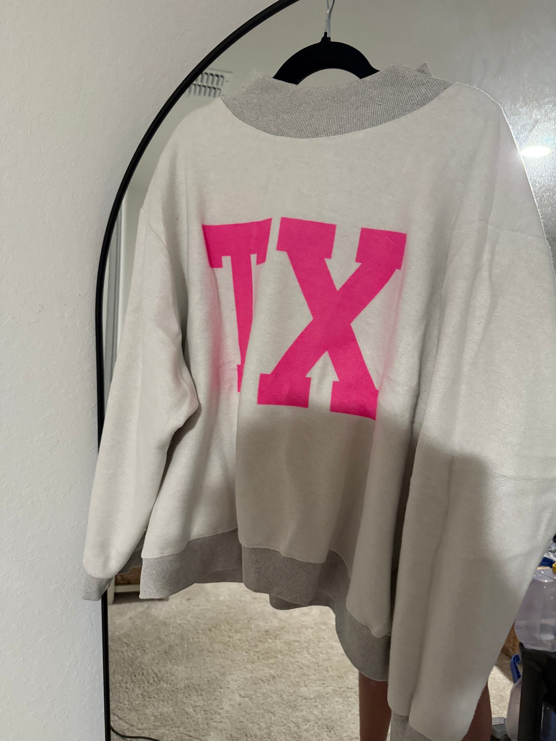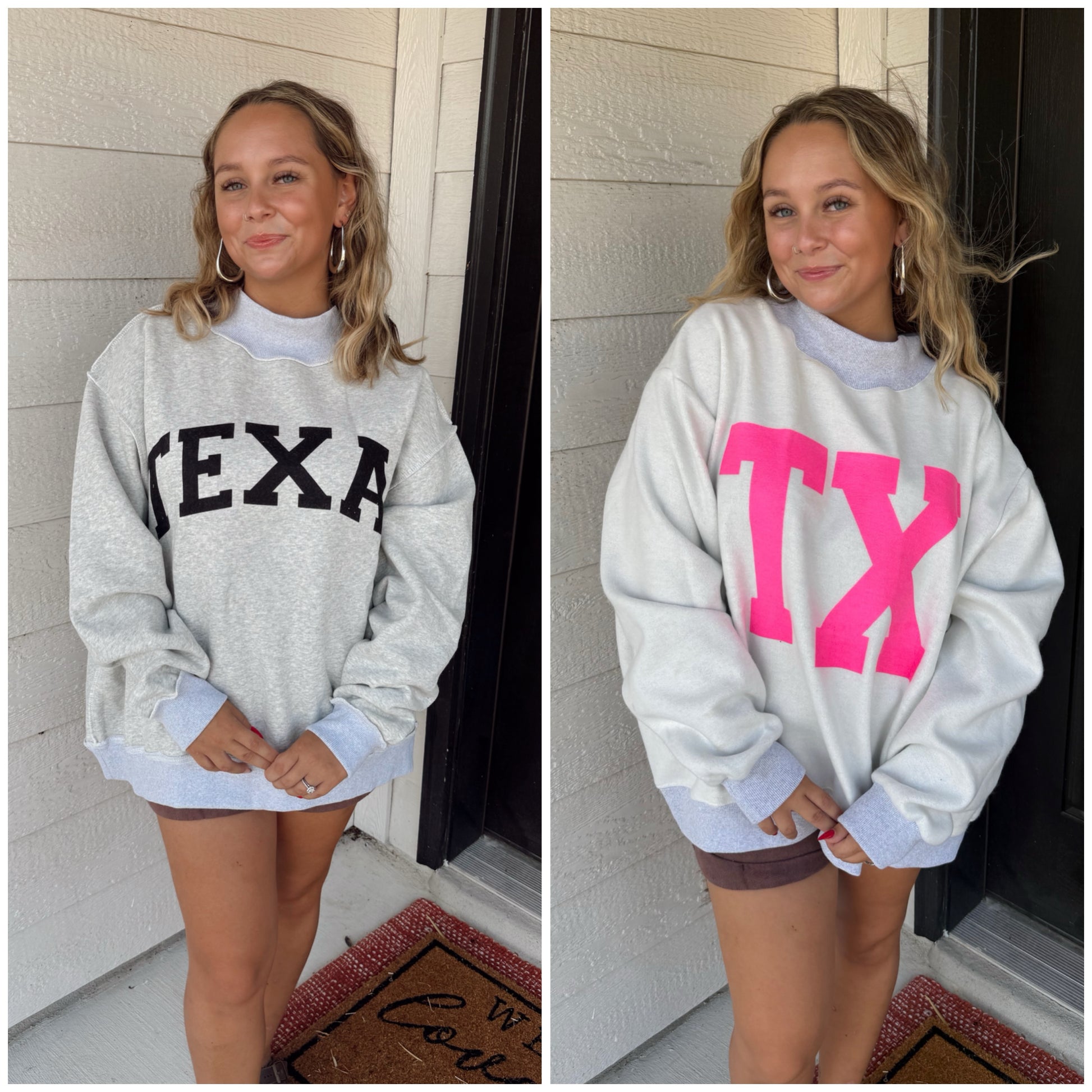 Black Texas/ PINK TX' Print Reversible Mockneck Sweatshirt - Mock-neck - Drop shoulder, long sleeves - Softest cozy fleece - Oversized fit - Rib banded hemline and cuffs - The reversible design lets you switch up your style.