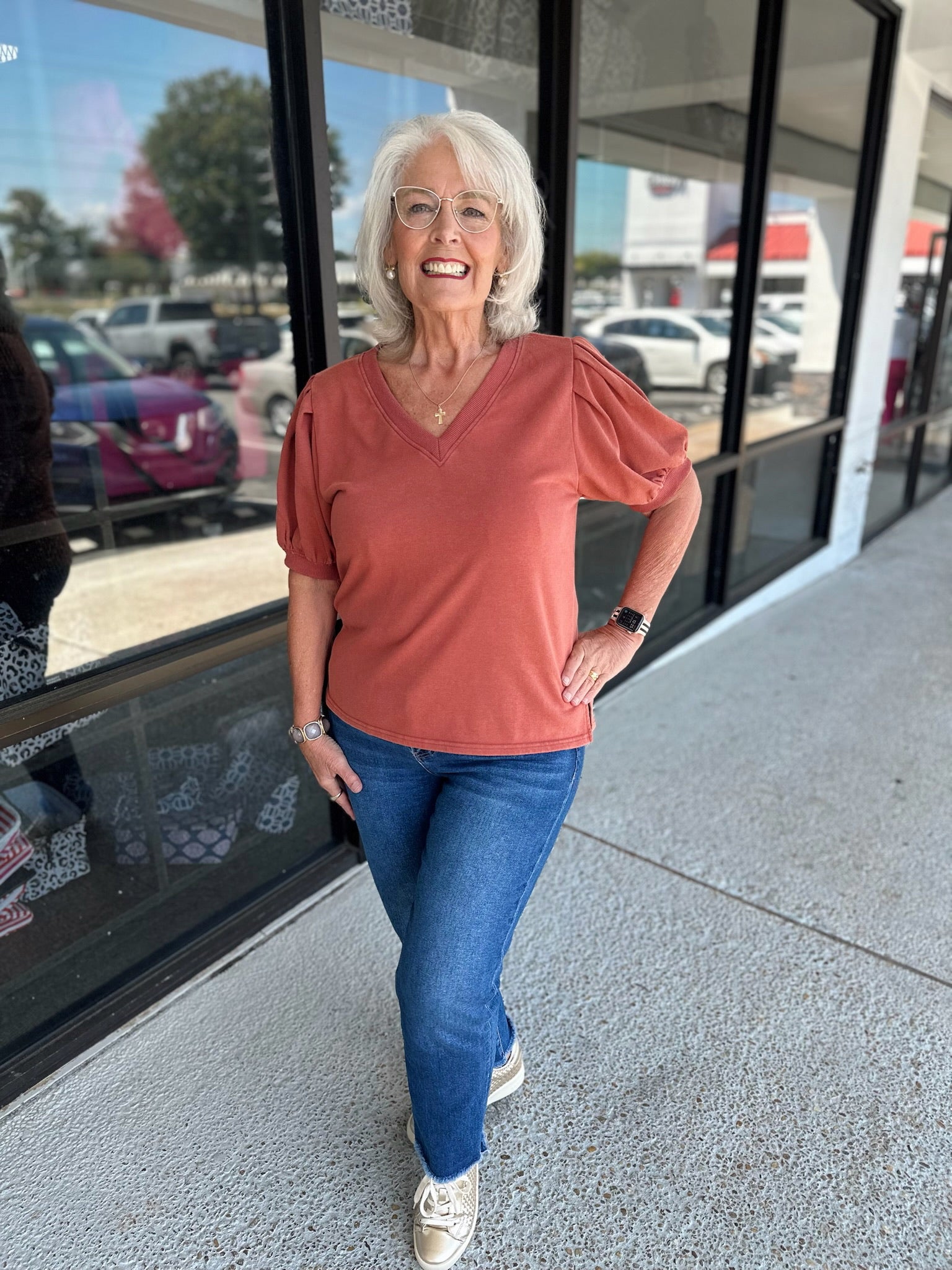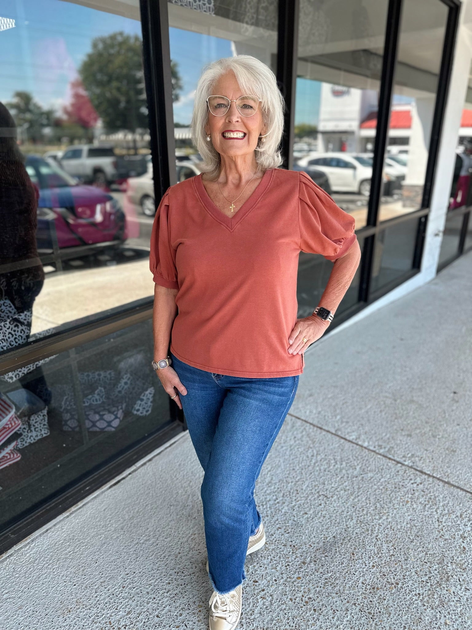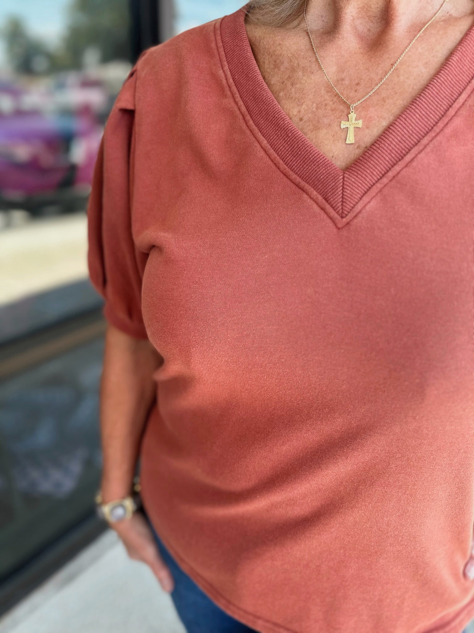 Cotton solid top with V-neck, pleated short puffed sleeves, band cuffs, and vented hemline.