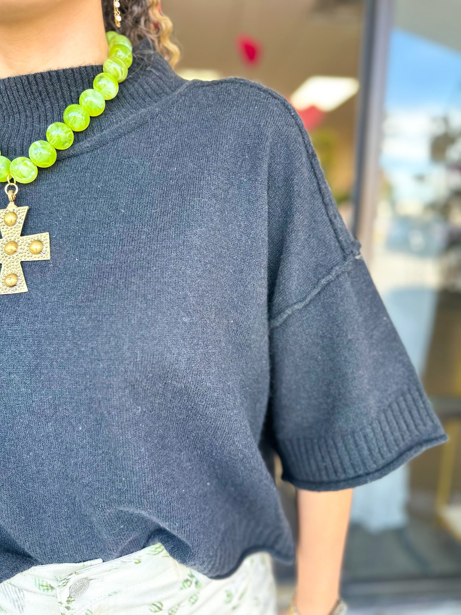 Marled knit mock neck short sleeve sweater + Ribbed mock neckline + Raw edge seam detail + Wide short sleeves with rubbed cuffs + Semi-cropped bodice + Ribbed neckline, cuffs, and hem