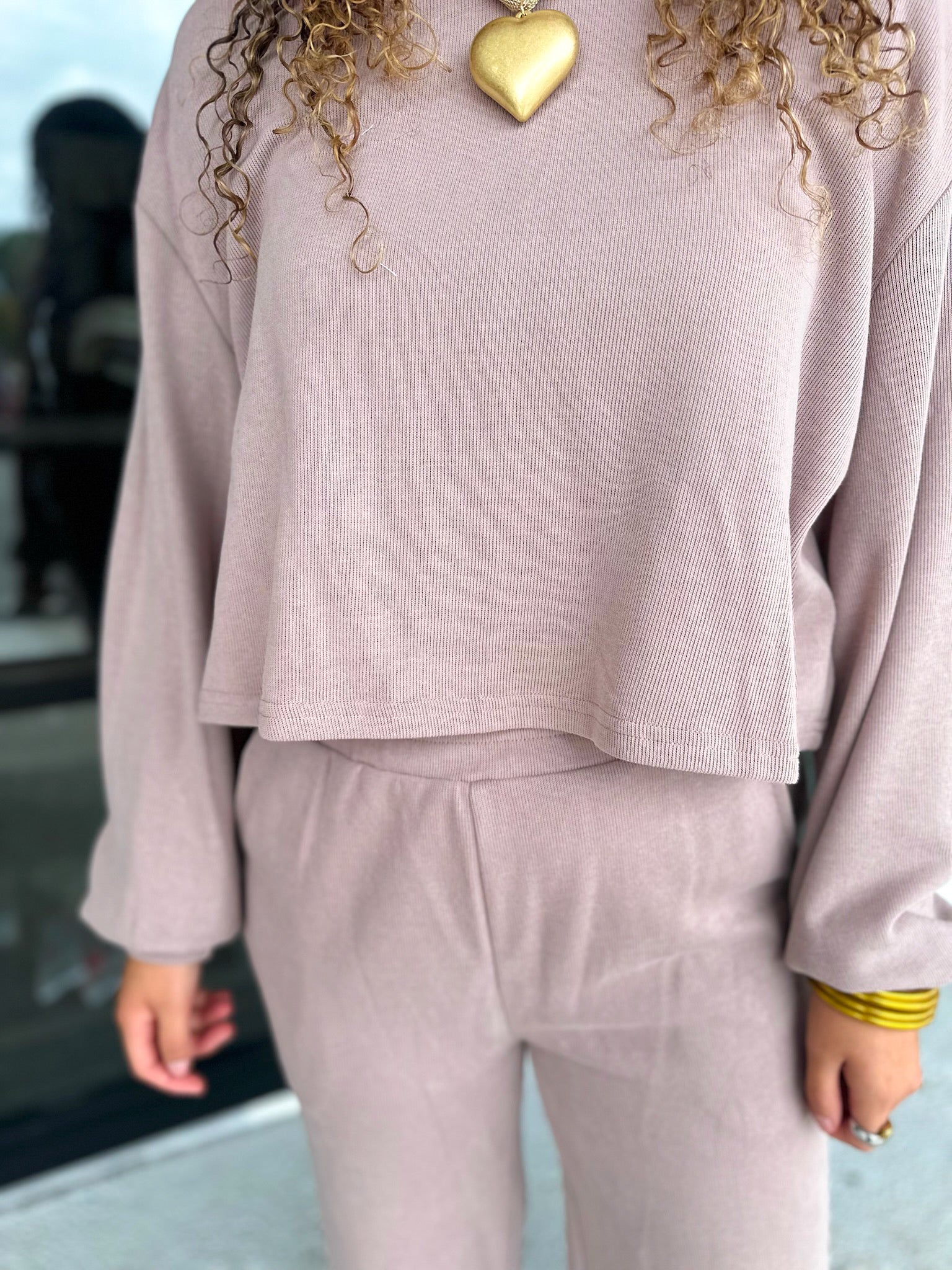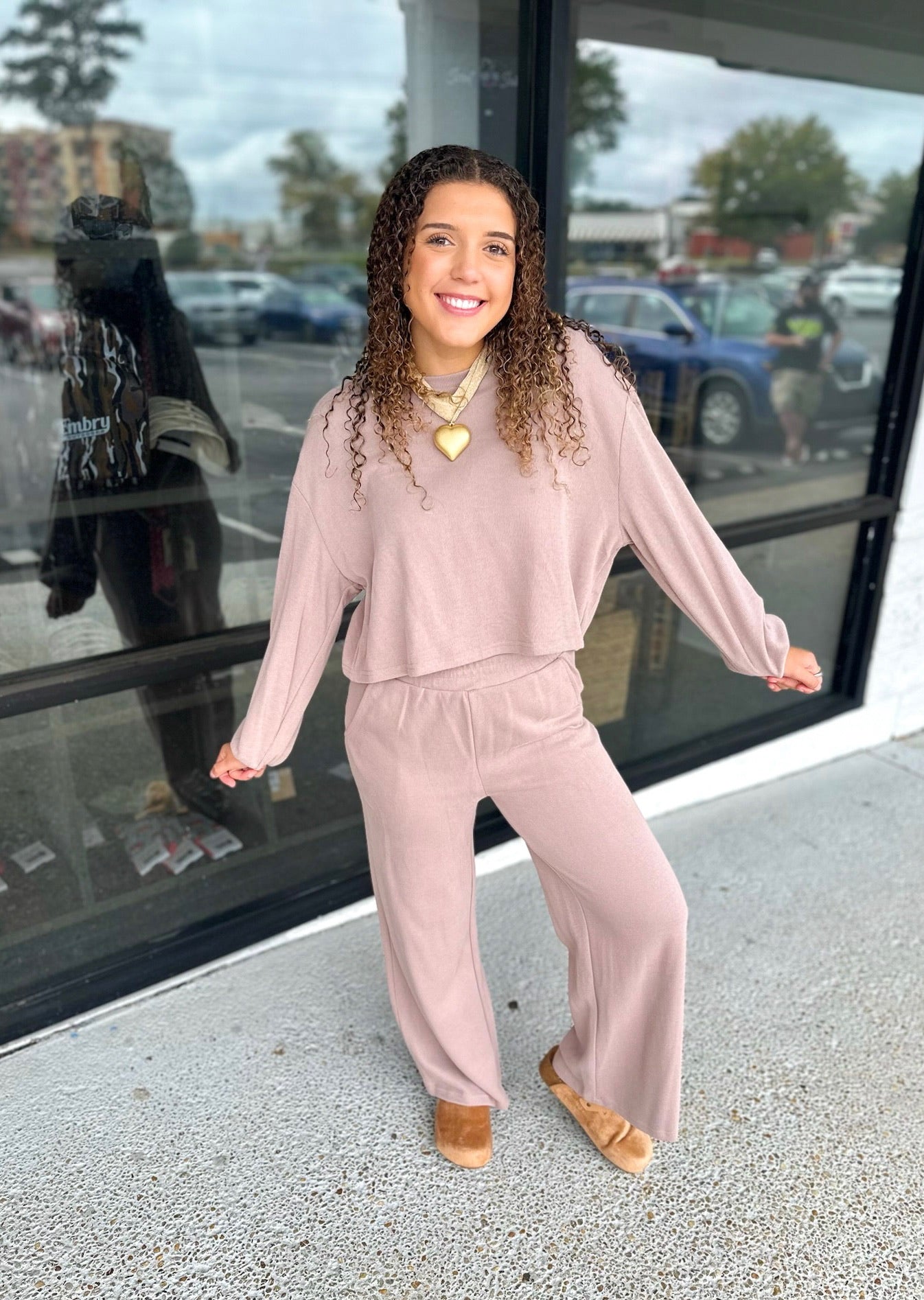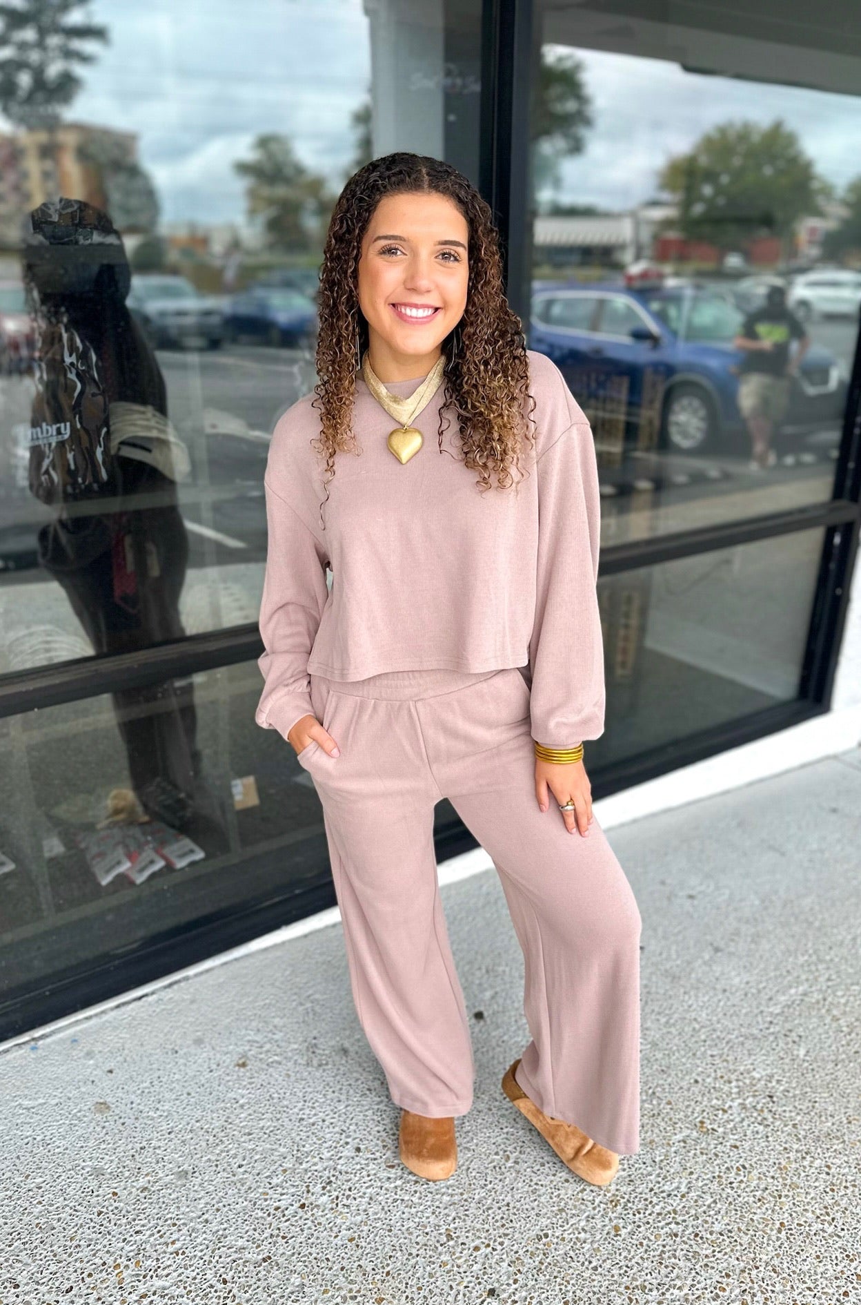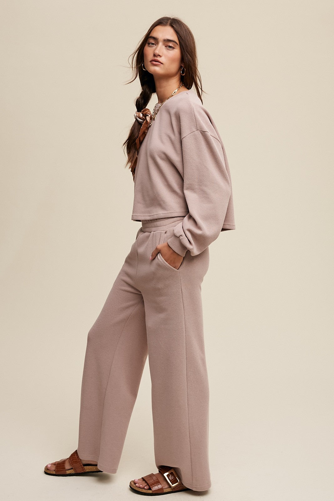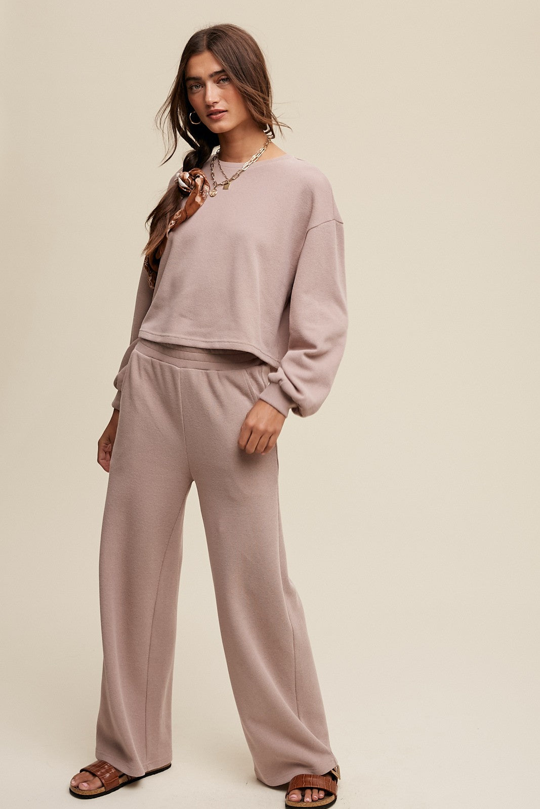 Details: Soft Brushed Knit Fabric: Made from a cozy, brushed knit material that feels soft against the skin and provides light warmth - Relaxed Cropped Pullover: Features a slightly boxy, cropped silhouette with dropped shoulders for an effortless vibe - Wide-Leg Pants: Full-length bottoms with a relaxed, wide-leg cut that drapes loosely for laid-back comfort - Elastic Waistband: Pull-on pants include a stretch waistband for a snug, flexible fit - Subtle Balloon Sleeves: Long sleeves with elastic cuffs add volume and a feminine touch - Side Seam Pockets: Functional pockets provide added convenience