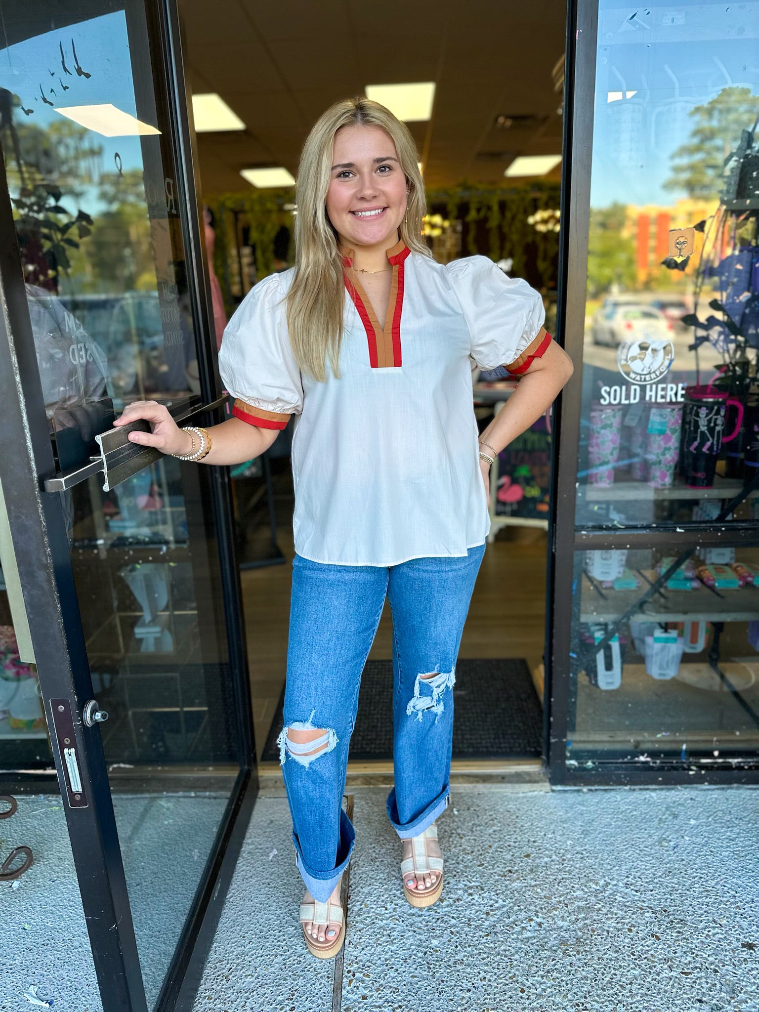 Solid short bubble sleeve featuring multicolor band finish. Unlined. Woven. Semi-sheer. Lightweight.