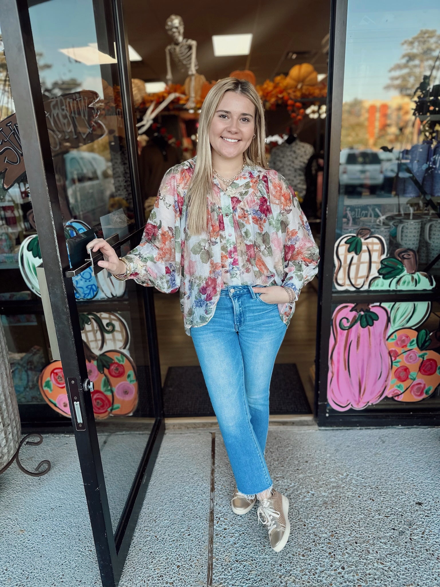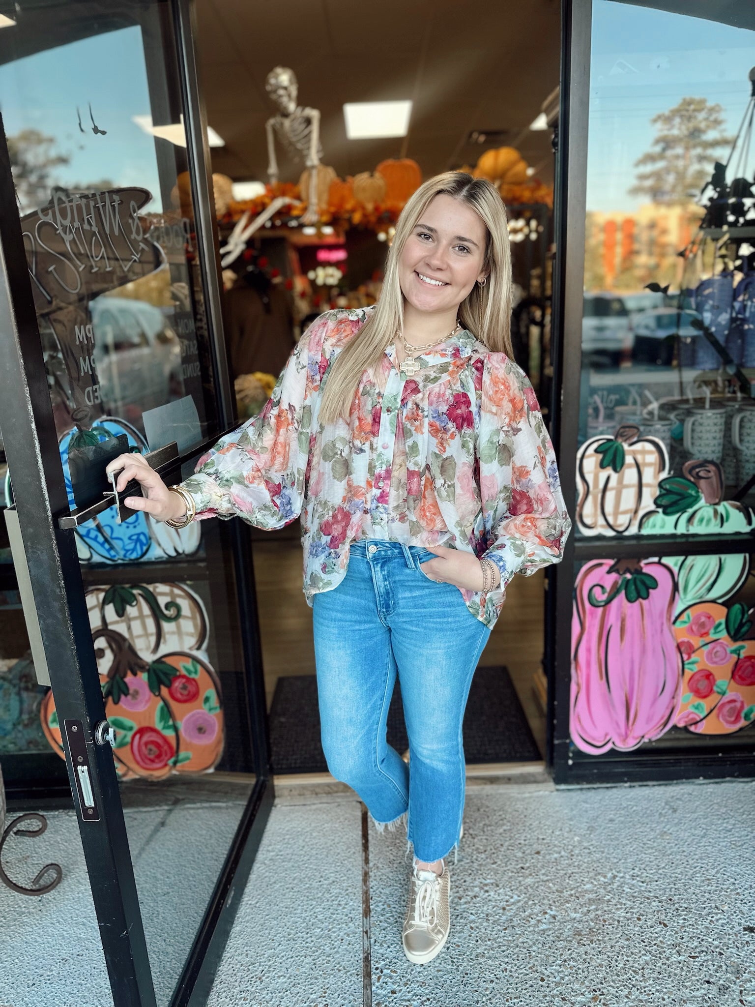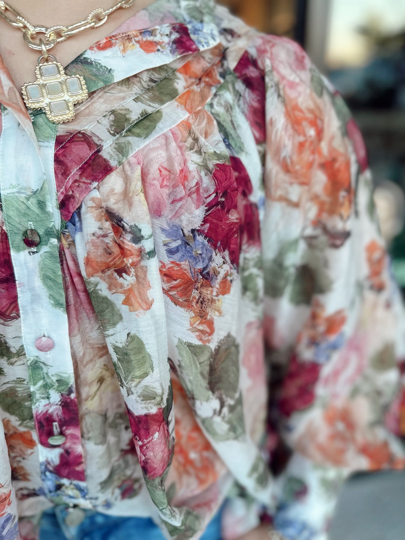 Vintage floral printed long sleeve blouse top featuring a rounded neckline, a button down front, added pleats for detail, buttoned cuffs creating a slight bubble sleeve effect and is a relaxed silhouette.