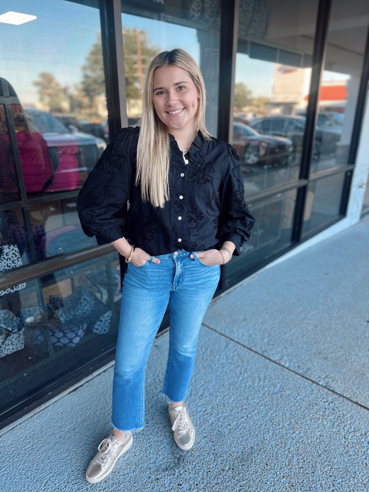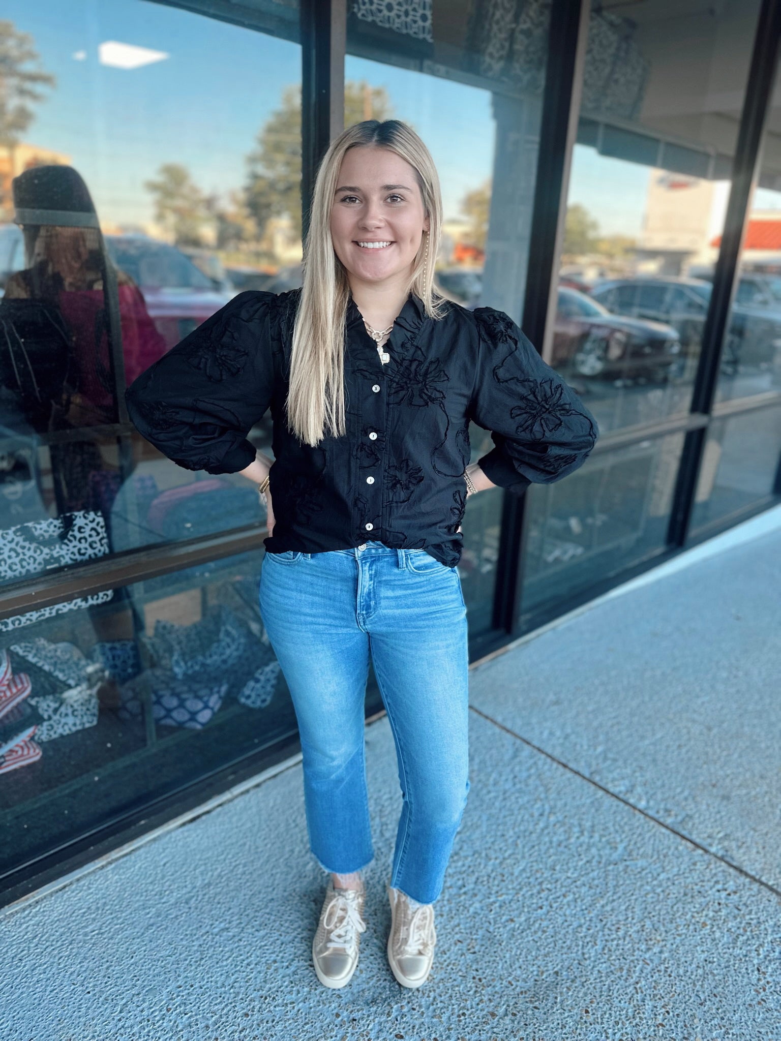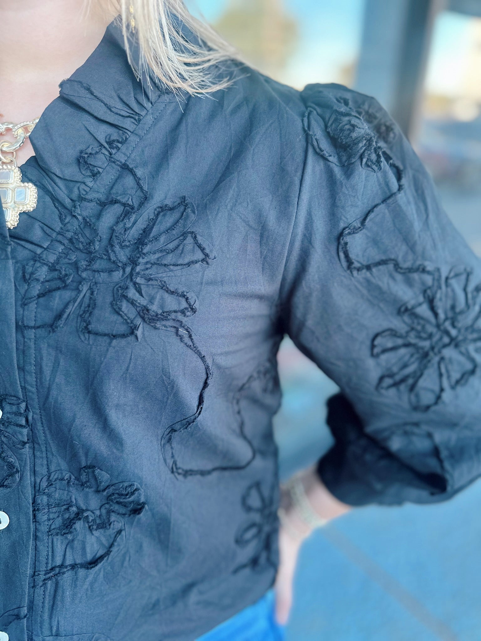 3/4 sleeves button down 3D floral top, textured fabric, ruffled neckline.