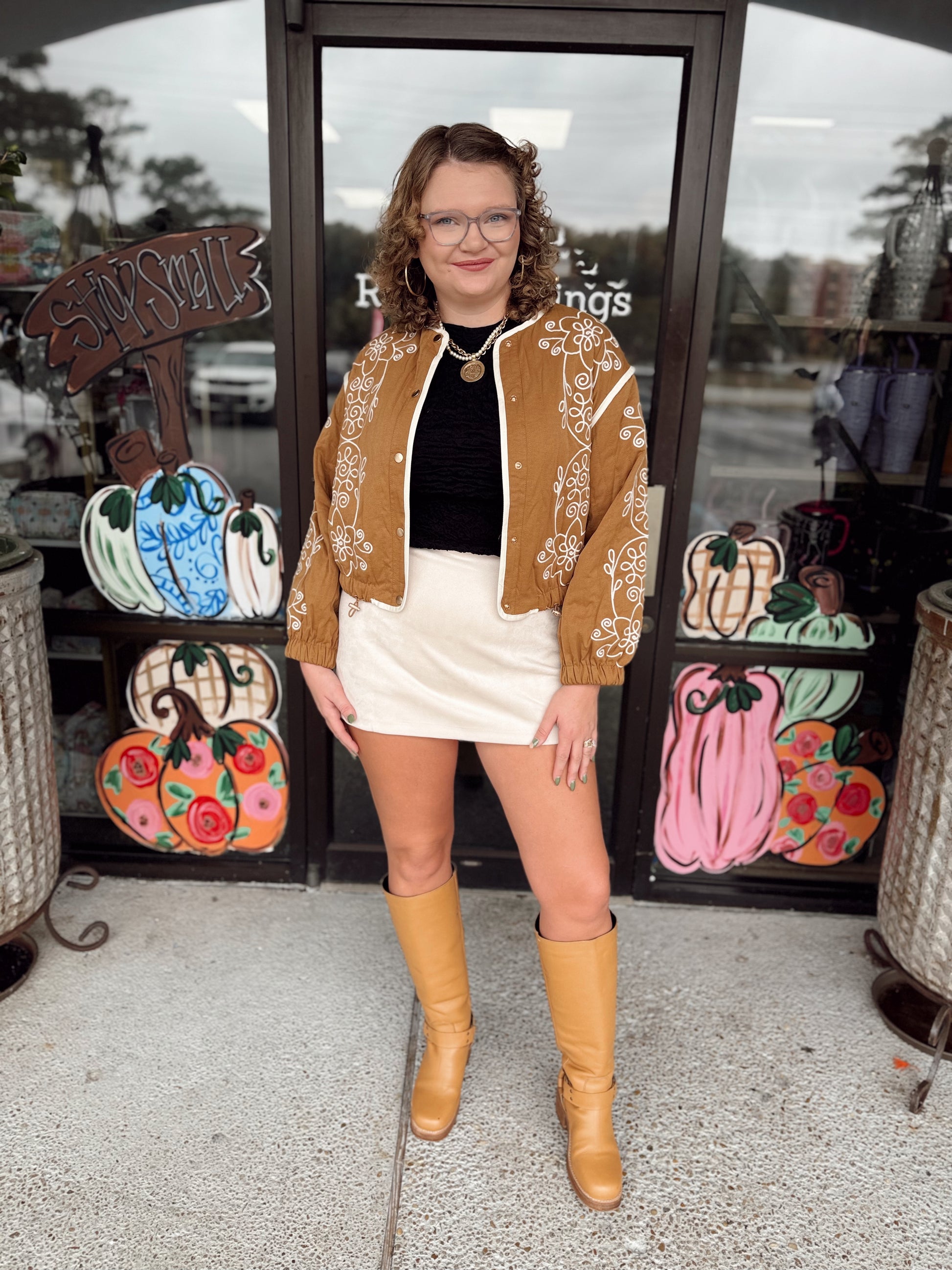 Fabric: Midweight quilted cotton with a soft matte finish - Lining: Fully lined interior for extra comfort and structure - Embroidery: Oversized contrast floral embroidery throughout body and sleeves - Design: Bomber-style silhouette with round neckline and front snap-button closure - Sleeves: Voluminous balloon sleeves with elastic cuffs - Functional Feature: Side pockets for added convenience