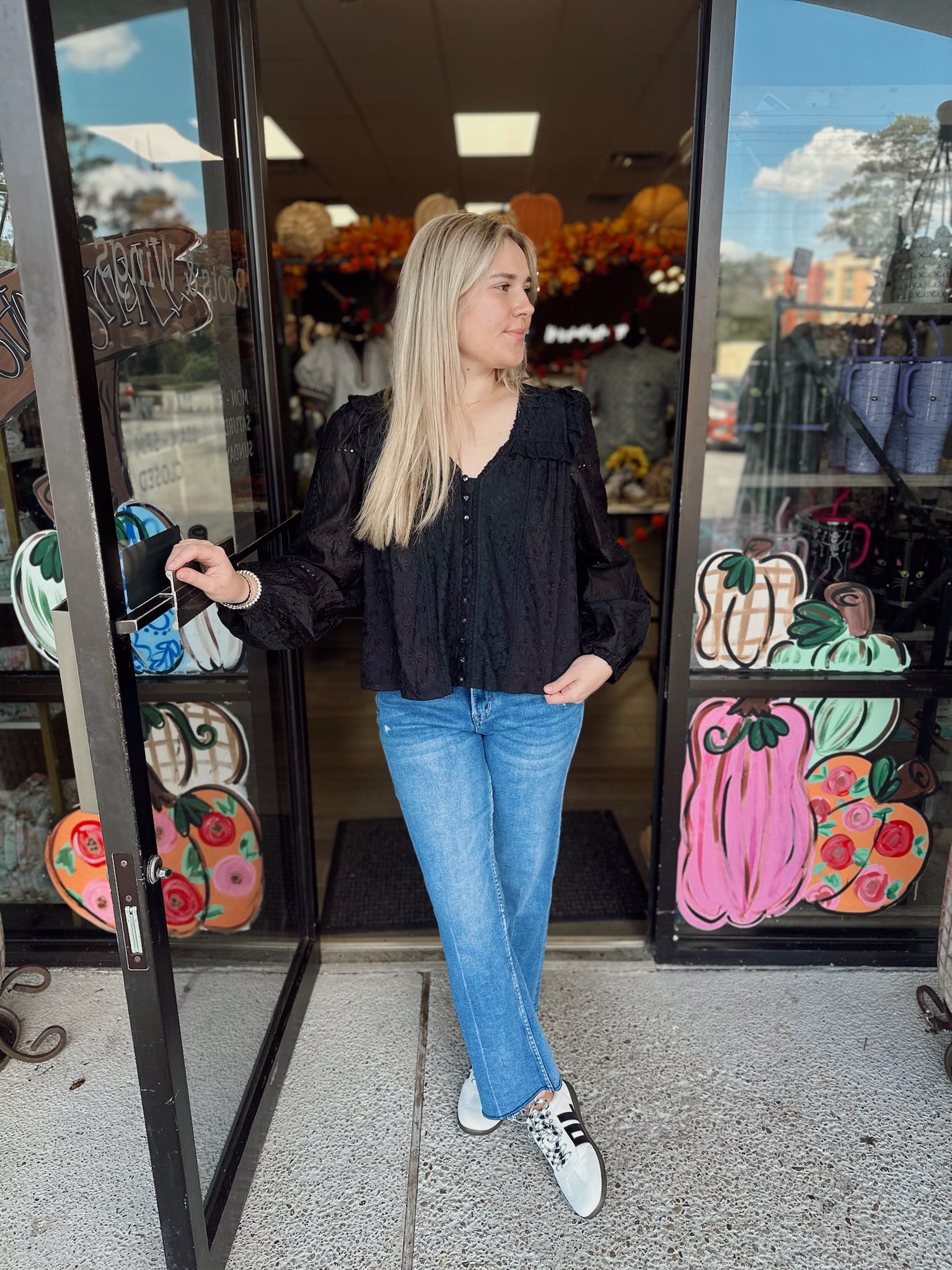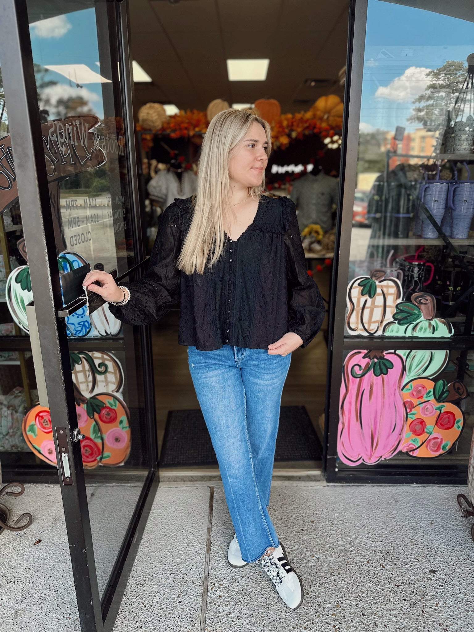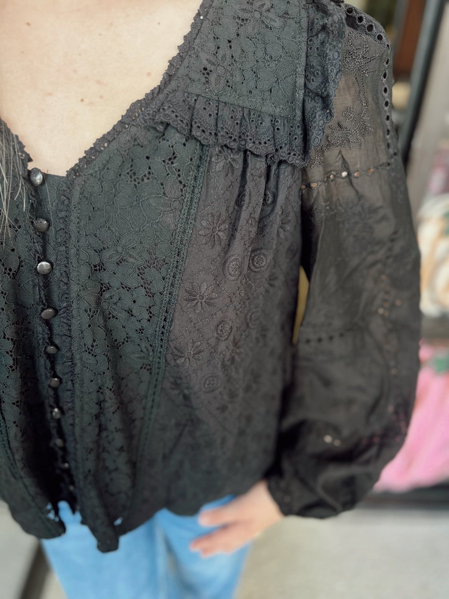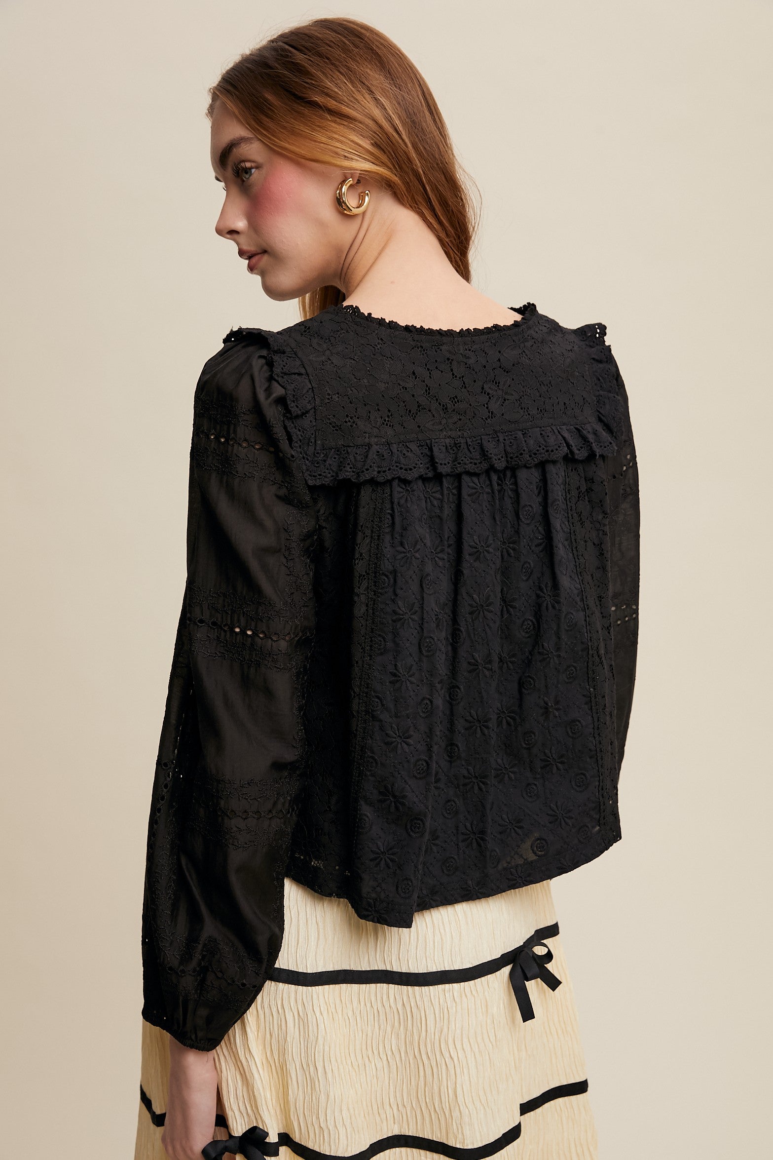 - Exquisite Lace Detail: Crafted with intricate floral lace patterns, adding a feminine and romantic charm. - Sheer Sleeves: Features lightly sheer puff sleeves with embroidery accents for an airy, elegant look. - Ruffle Accents: Delicate ruffle trims on the neckline and shoulders enhance the vintage-inspired aesthetic. - Front Button Closure: Adorned with dainty buttons that blend seamlessly into the design. - Lightweight and Lined: Made with soft, breathable fabric, with lining in the body for comfort and modesty.