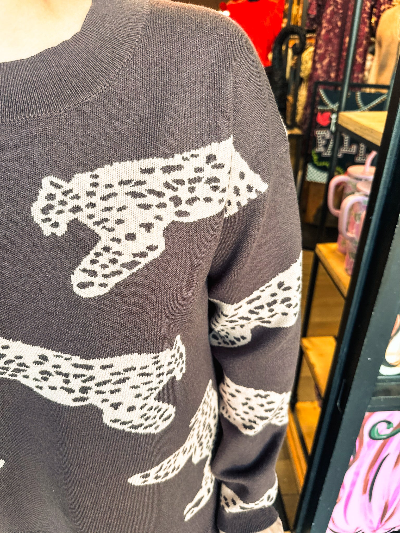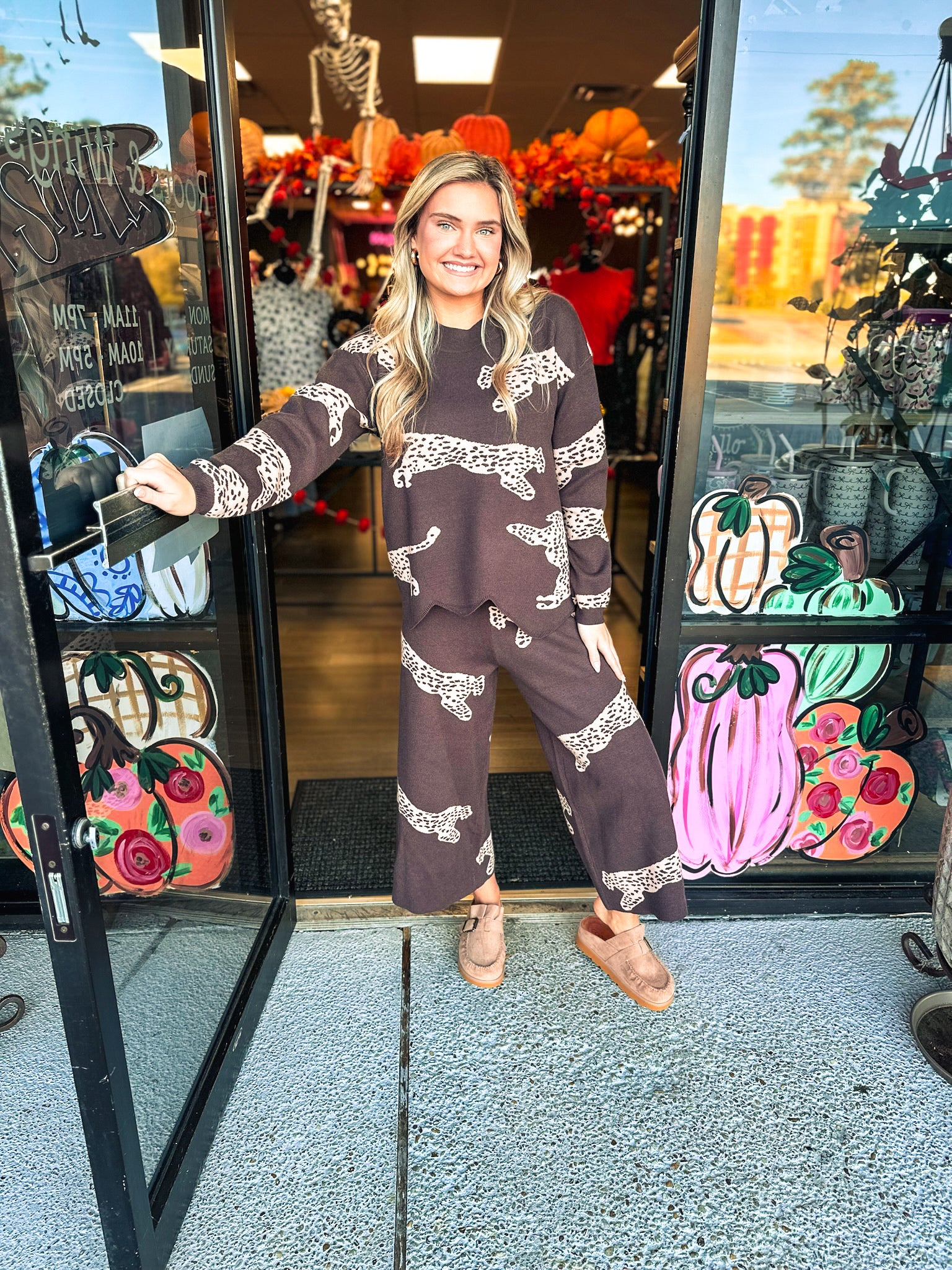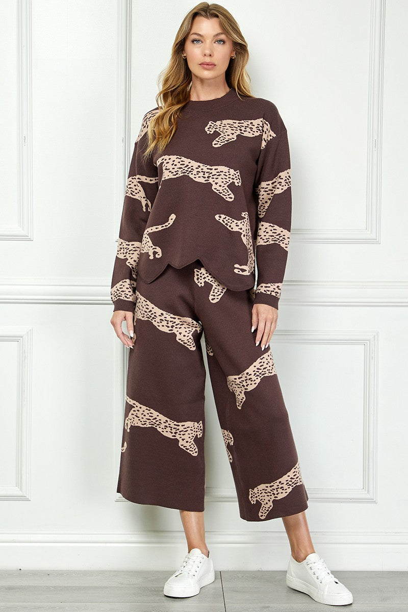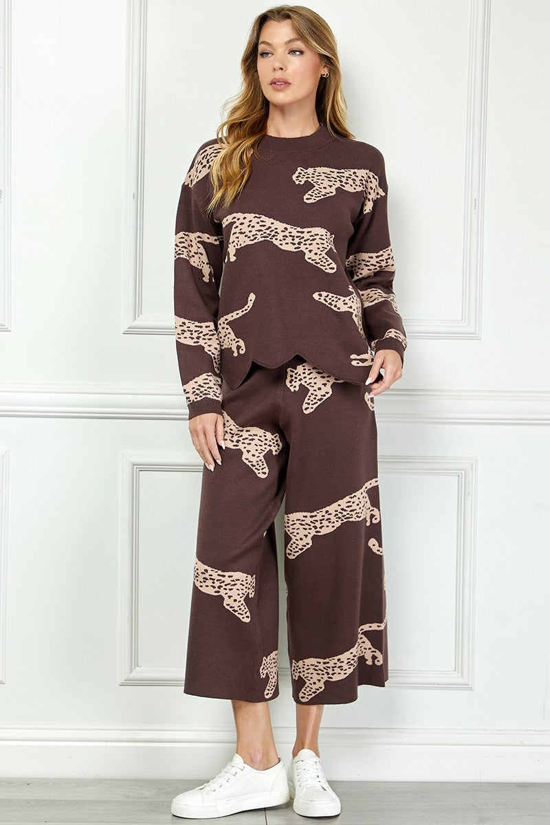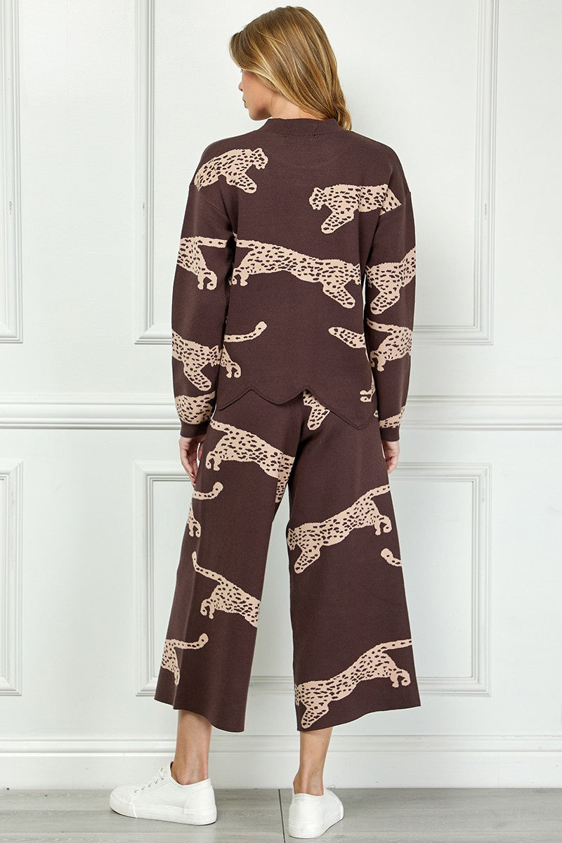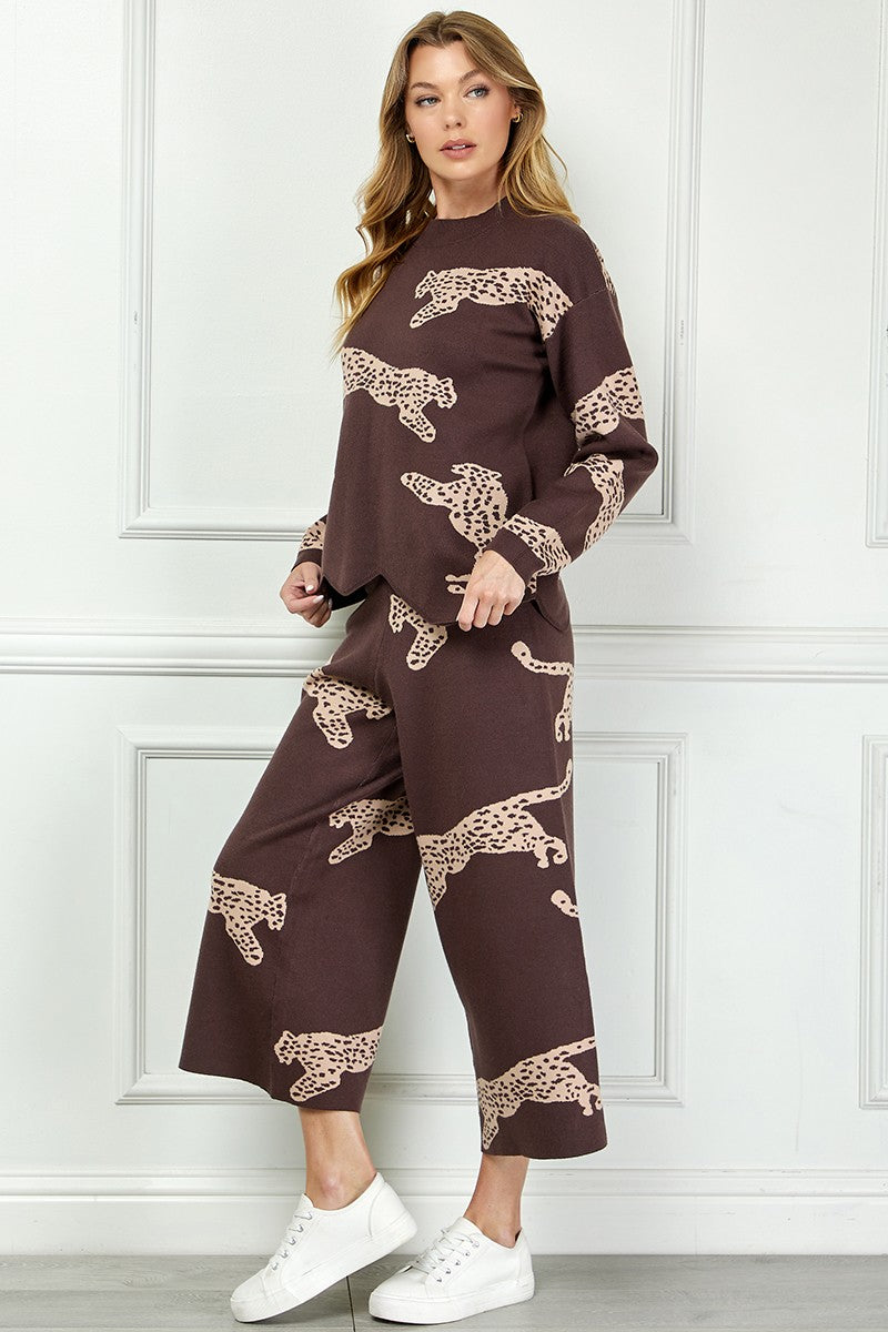 These wide-leg knit pants bring a bold, playful edge with their all-over leopard motif. Crafted in a deep chocolate base with beige leopard silhouettes, the design makes a statement while maintaining cozy comfort. The elasticized waistband offers a smooth, flattering fit, while the cropped culotte-style cut provides effortless movement and modern flair. Pair them with the matching leopard sweater for a coordinated look, or style with neutral tops for a standout piece that remains versatile and chic.