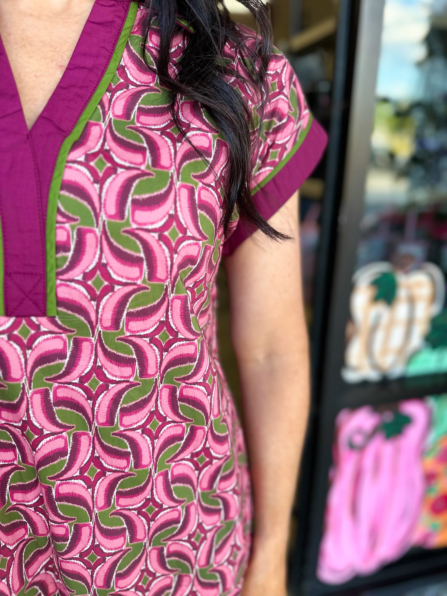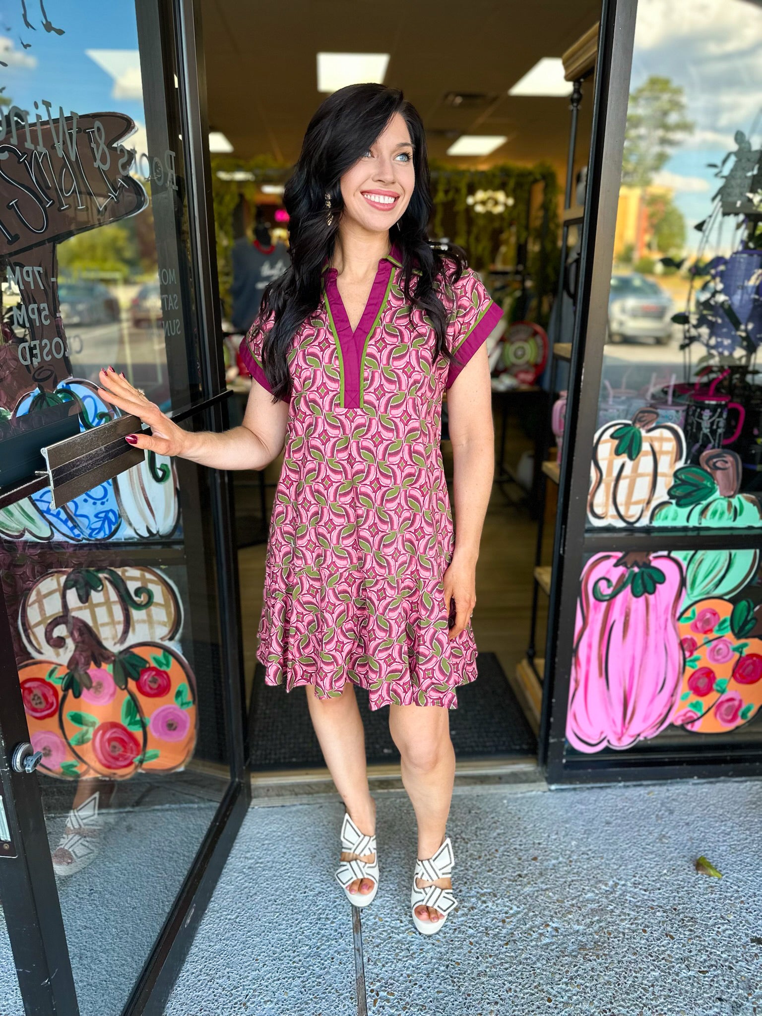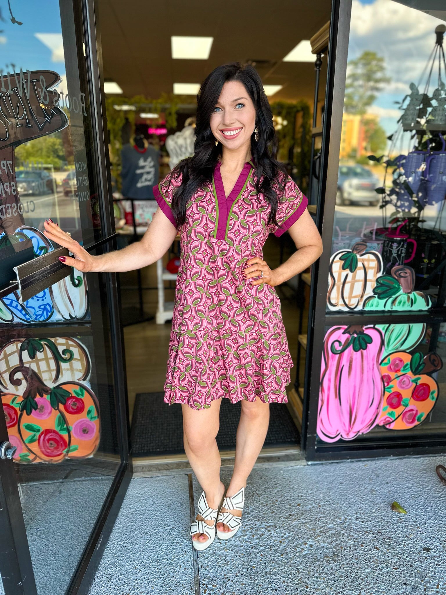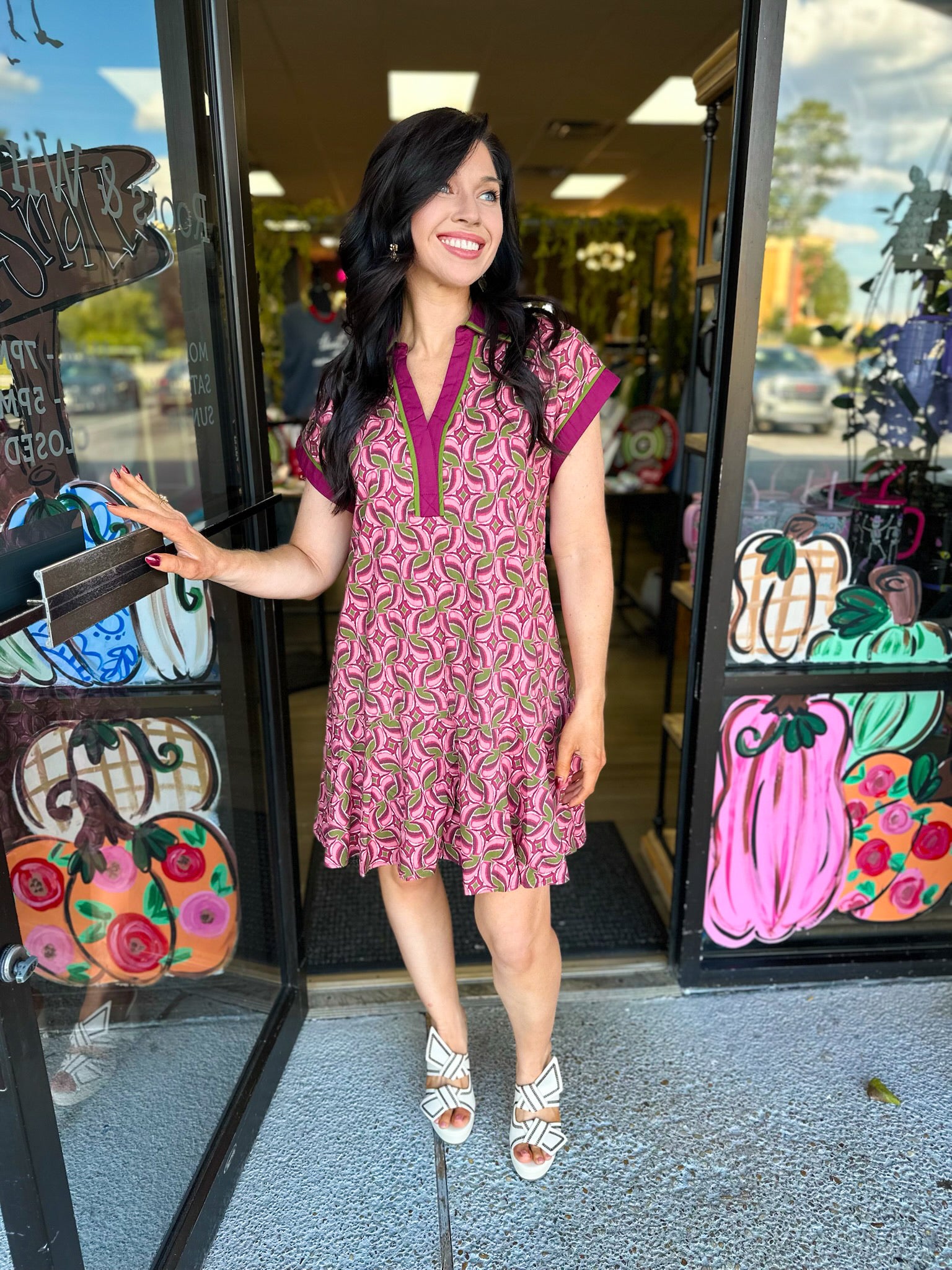 Abstract pattern flounce ruffle hem mini dress featuring contrast accent spread collar. Side pockets. Lined. Woven. Non-sheer. Lightweight.